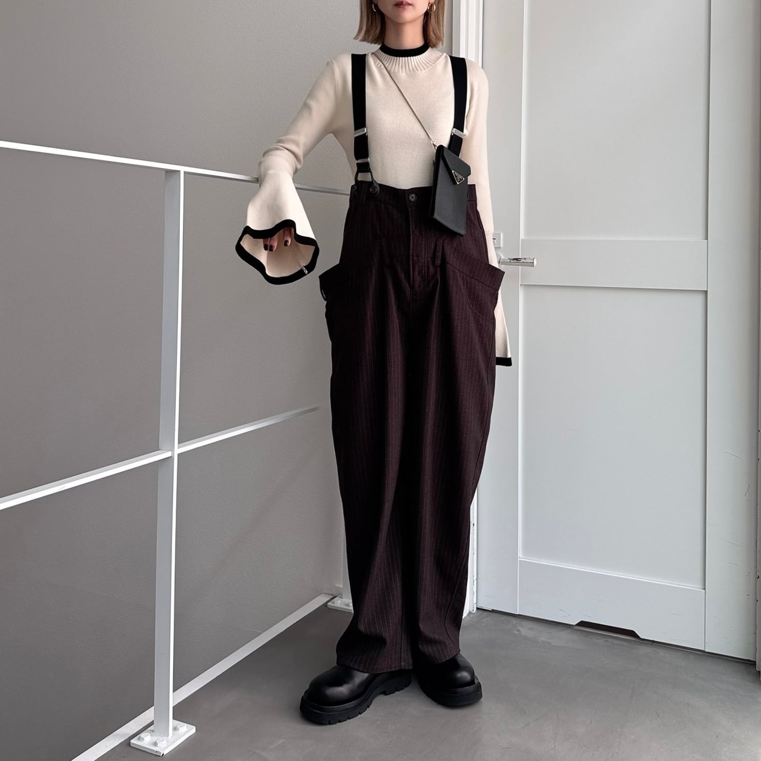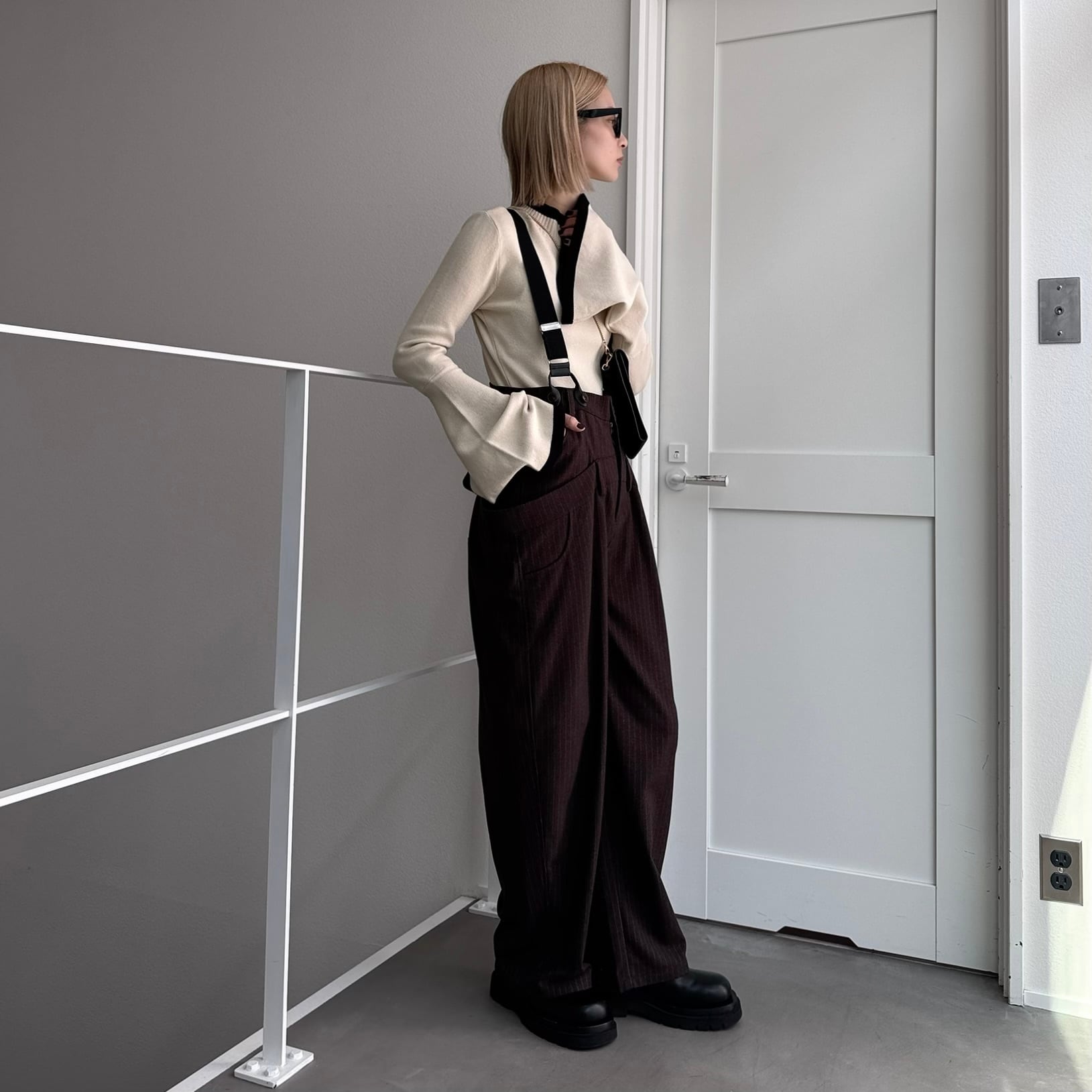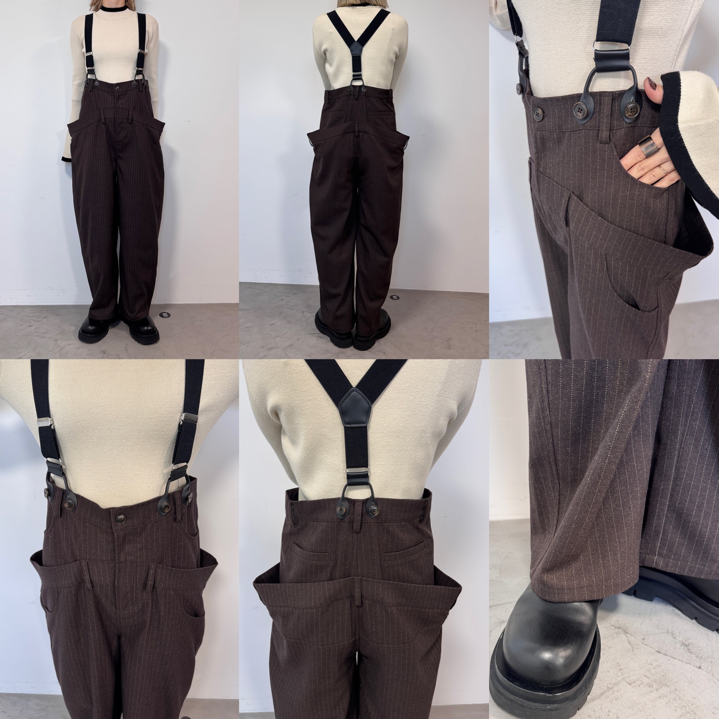 ウエスト部分を重ね合わせたドッキングデザインのサロペットパンツ。デザイン性のあるボトムはどんなitemにも合わせやすく一気にモード感のある雰囲気に。ダブルウエスト部分は腰回りをカバーしてくれます。サスペンダーを使用したコーデはもちろん、ウエストのボタンを切り替えるだけでハイウエストパンツとしても◎コーデによって履く位置をチェンジしコーデをお楽しみいただけます。オケージョンにもおススメ。