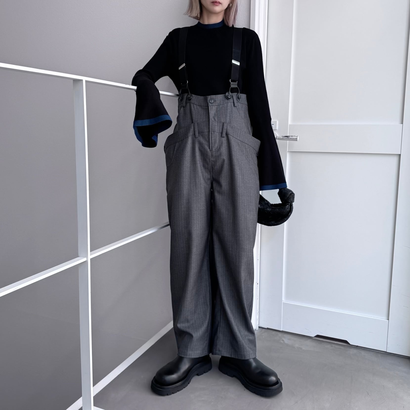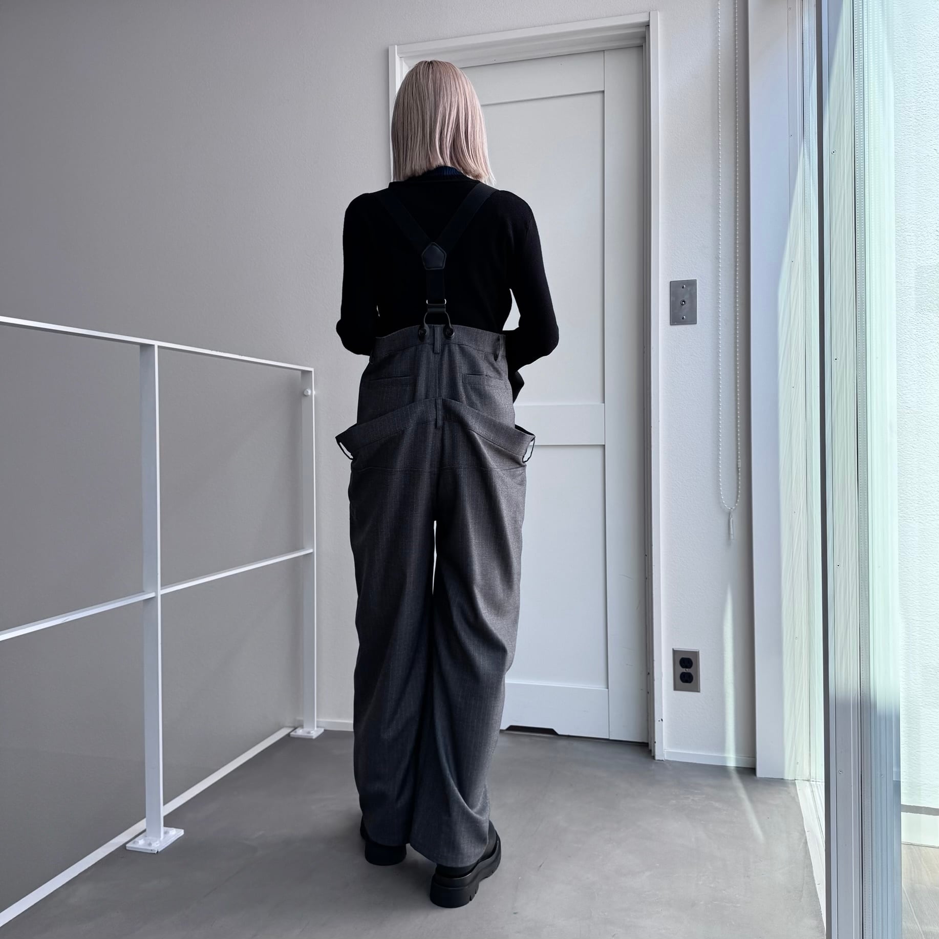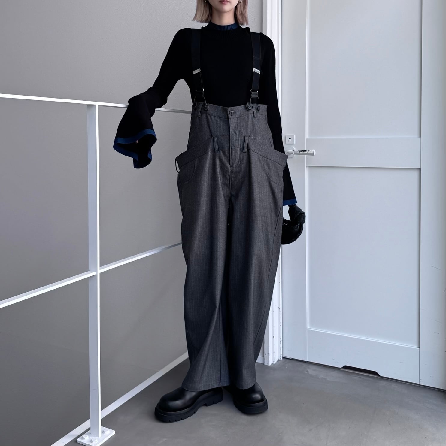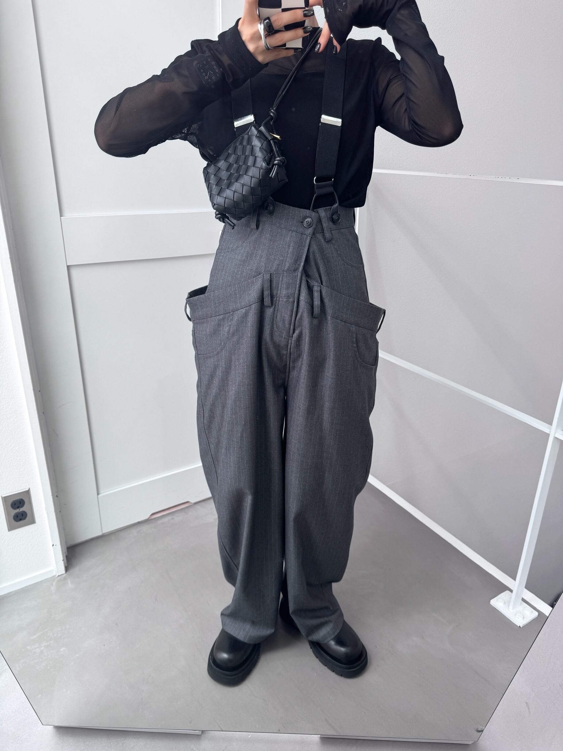 ウエスト部分を重ね合わせたドッキングデザインのサロペットパンツ。デザイン性のあるボトムはどんなitemにも合わせやすく一気にモード感のある雰囲気に。ダブルウエスト部分は腰回りをカバーしてくれます。サスペンダーを使用したコーデはもちろん、ウエストのボタンを切り替えるだけでハイウエストパンツとしても◎コーデによって履く位置をチェンジしコーデをお楽しみいただけます。オケージョンにもおススメ。