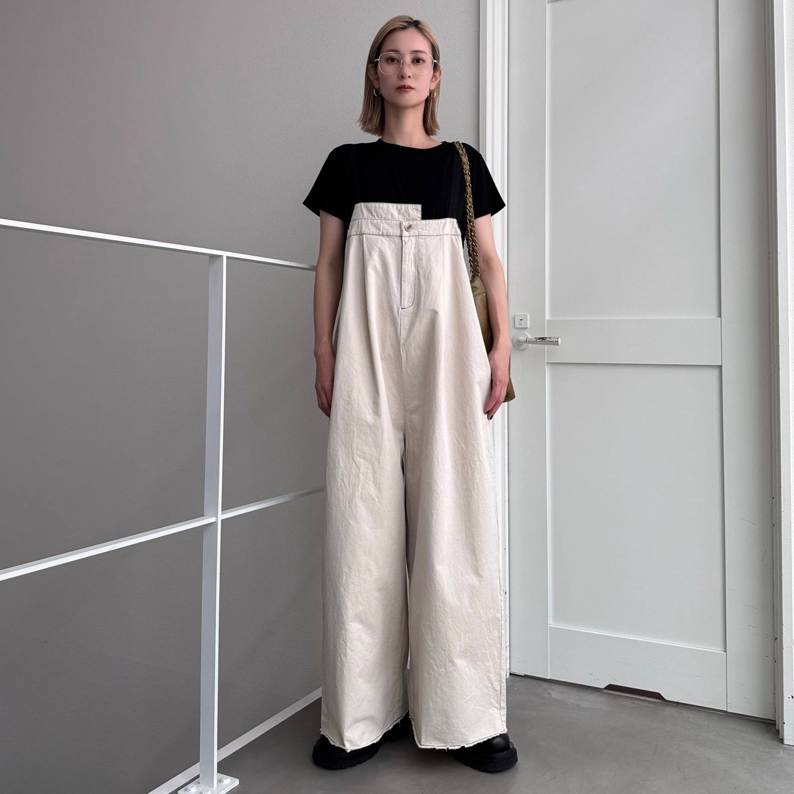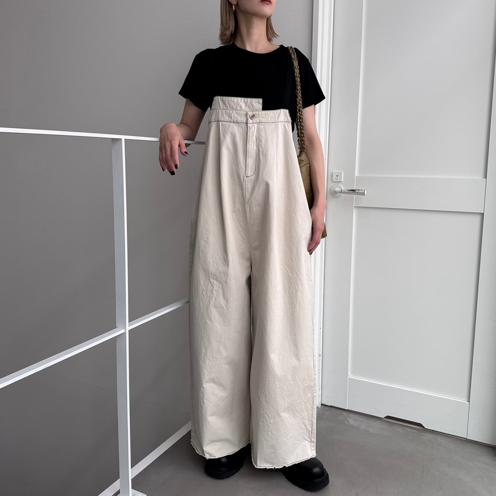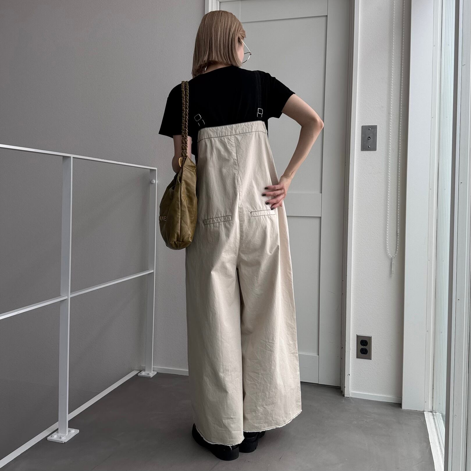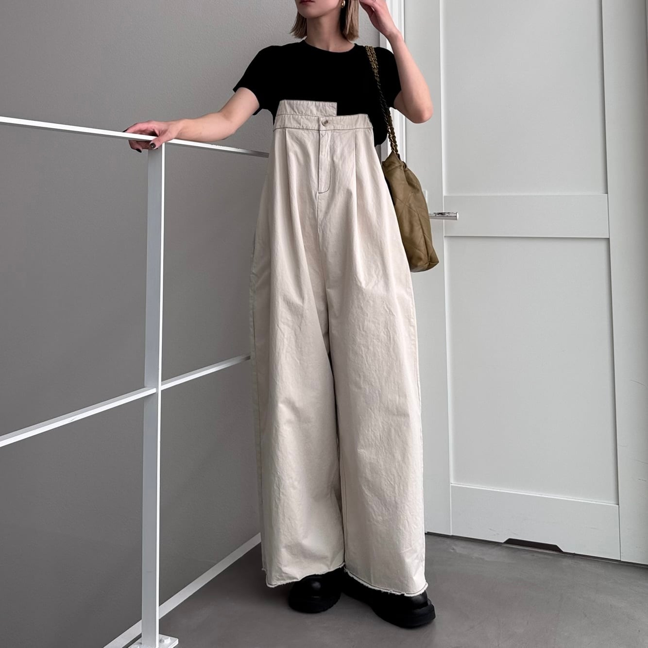 裾の切りっぱなしやステッチがアクセントになったサロペットPT。ゆったりとしたサイズで、リラックスできる着心地。肩紐調整が可能で、自分好みのフィット感を楽しめます。