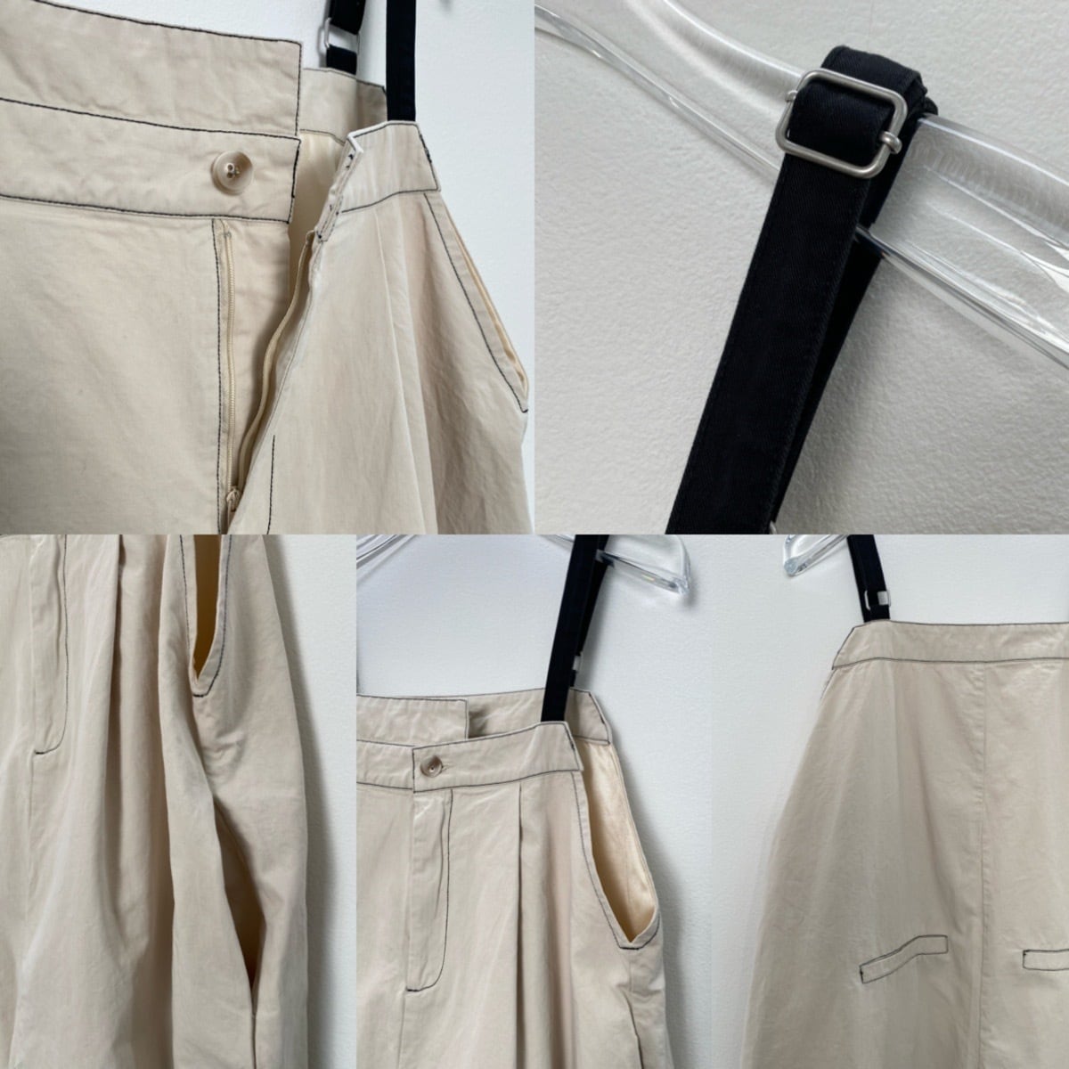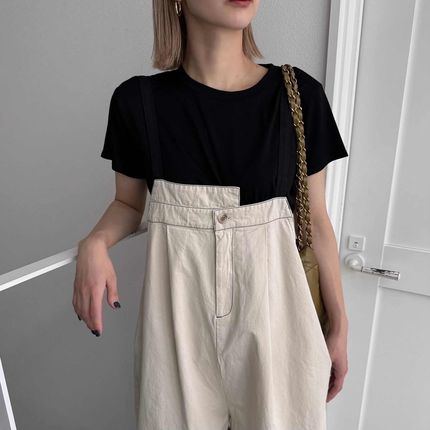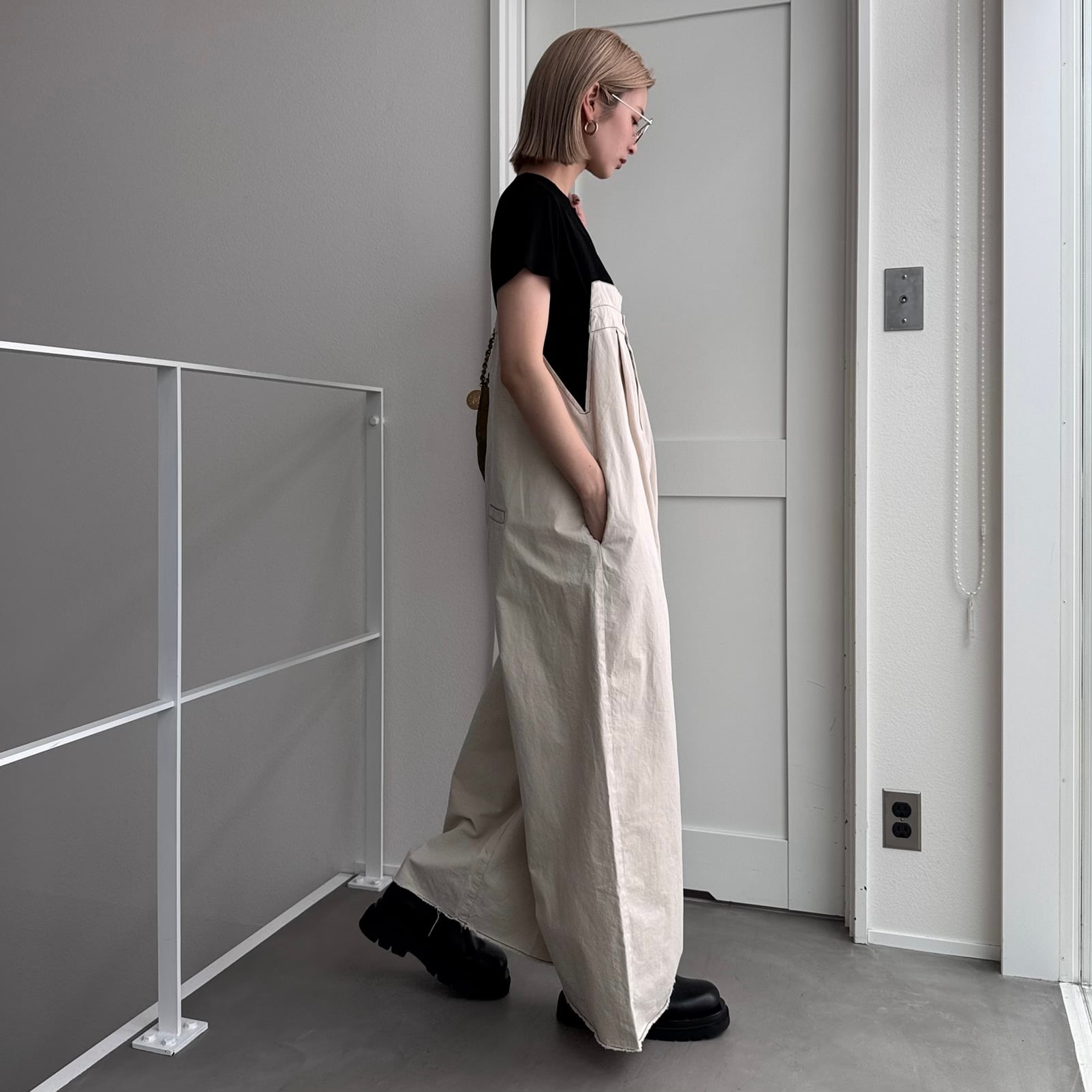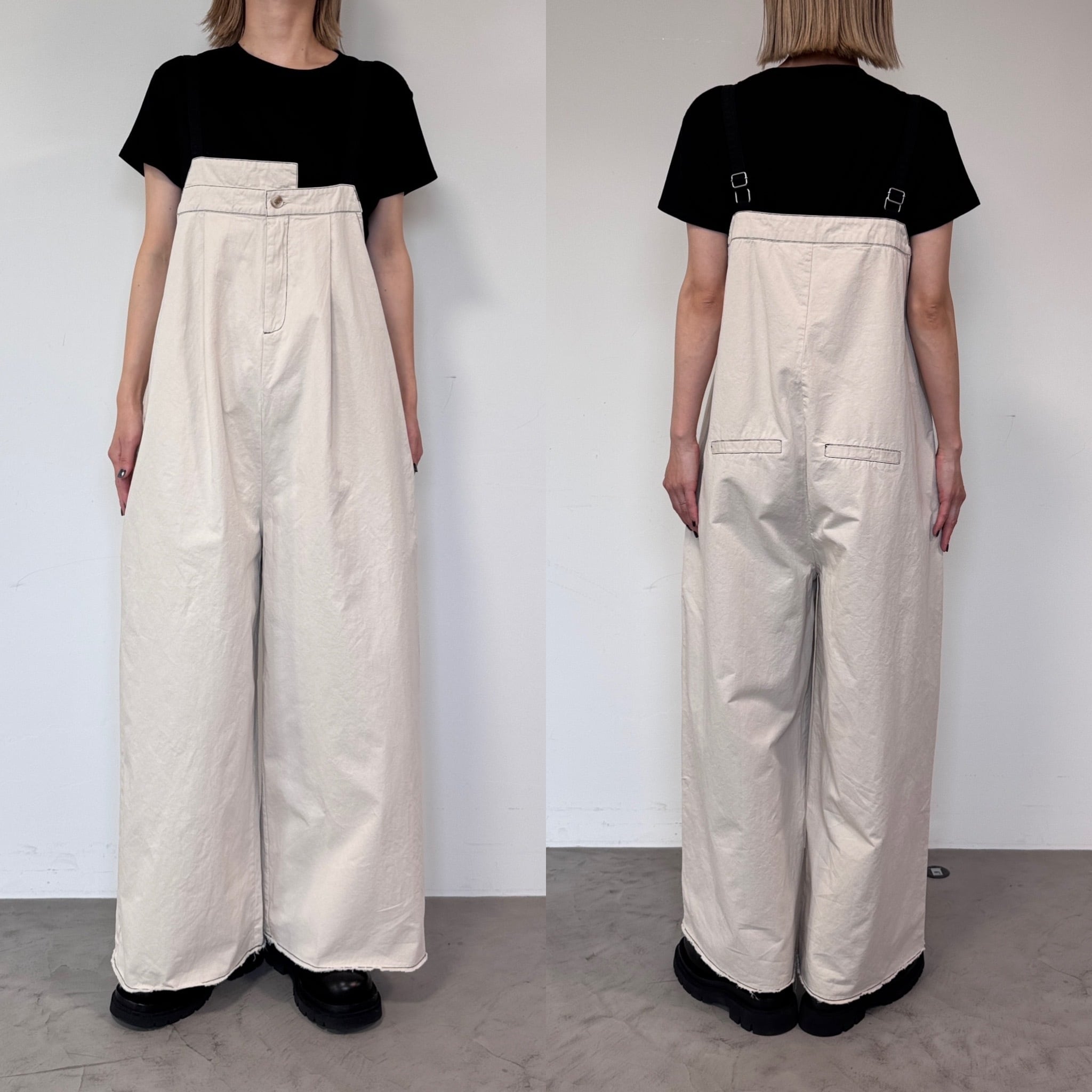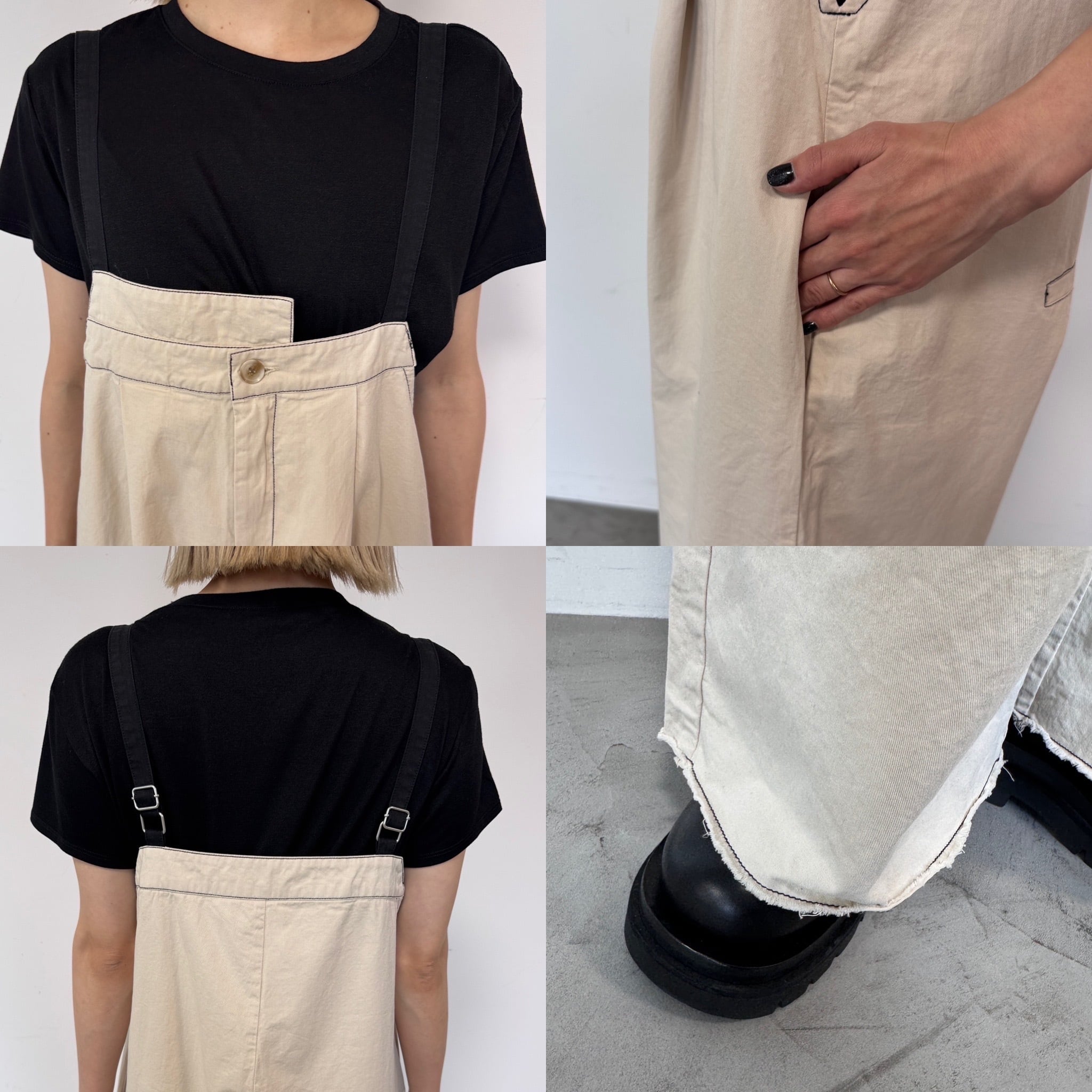 裾の切りっぱなしやステッチがアクセントになったサロペットPT。ゆったりとしたサイズで、リラックスできる着心地。肩紐調整が可能で、自分好みのフィット感を楽しめます。