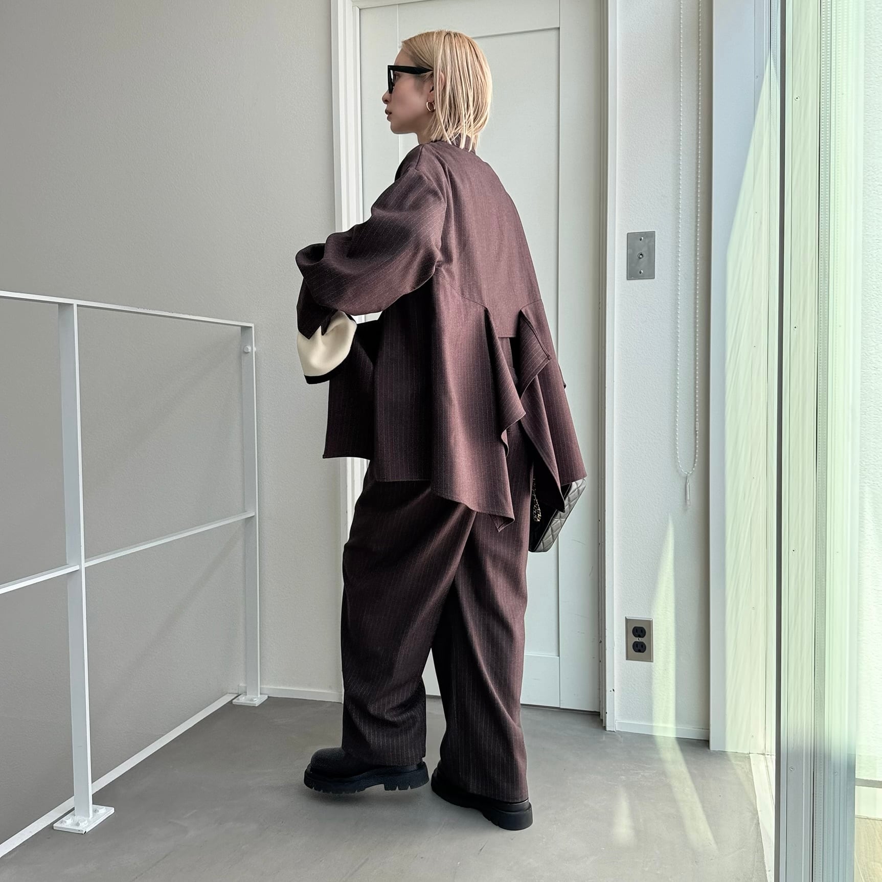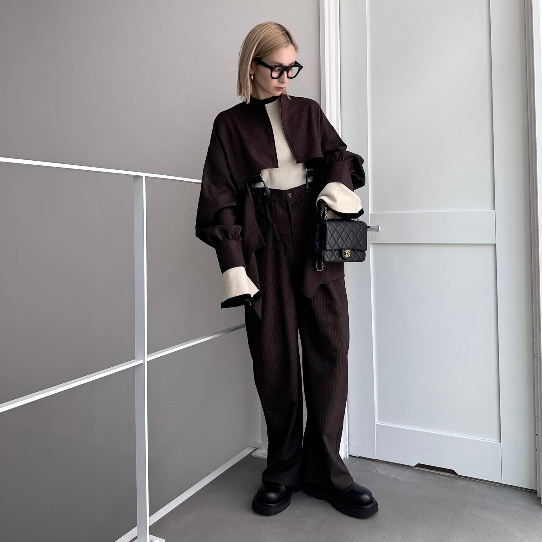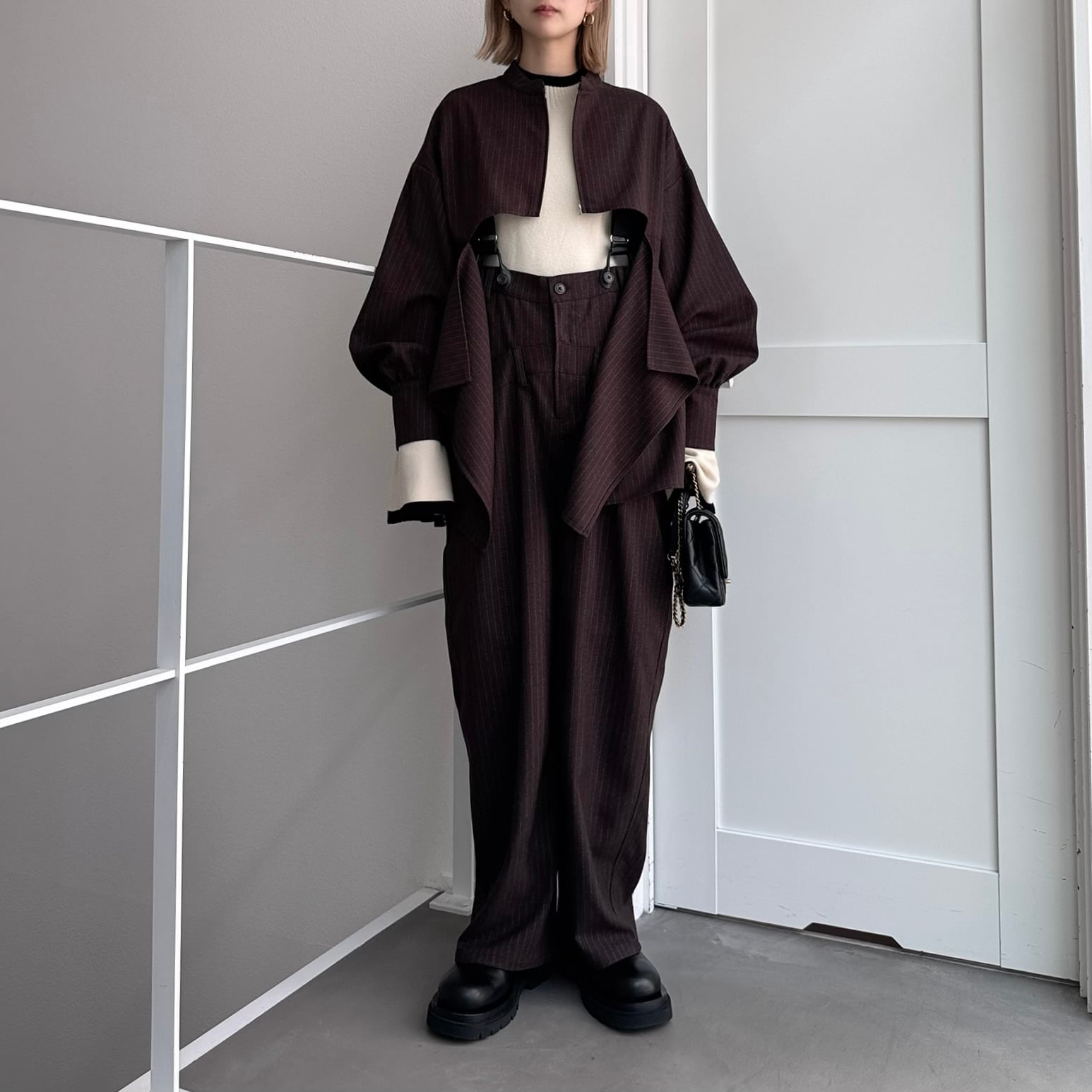 品のあるピンストライプがポイントのジップジャケット&サロペット。細めのピンストライプがオケージョンはもちろん、合わせるインナーでカジュアルコーデも楽しめるセットアップです。ドレープ部分は腰回りを隠してくれるロング丈で、動きのあるデザイン。サロペットは、ウエスト部分を重ねたドッキングデザインで、サスペンダーを外してウエストボタンを切り替えるだけでハイウエストパンツとしても着用いただけます。デザイン性のあるボトムはどんなアイテムにも合わせやすくデイリーにも使いやすいサロペットです。