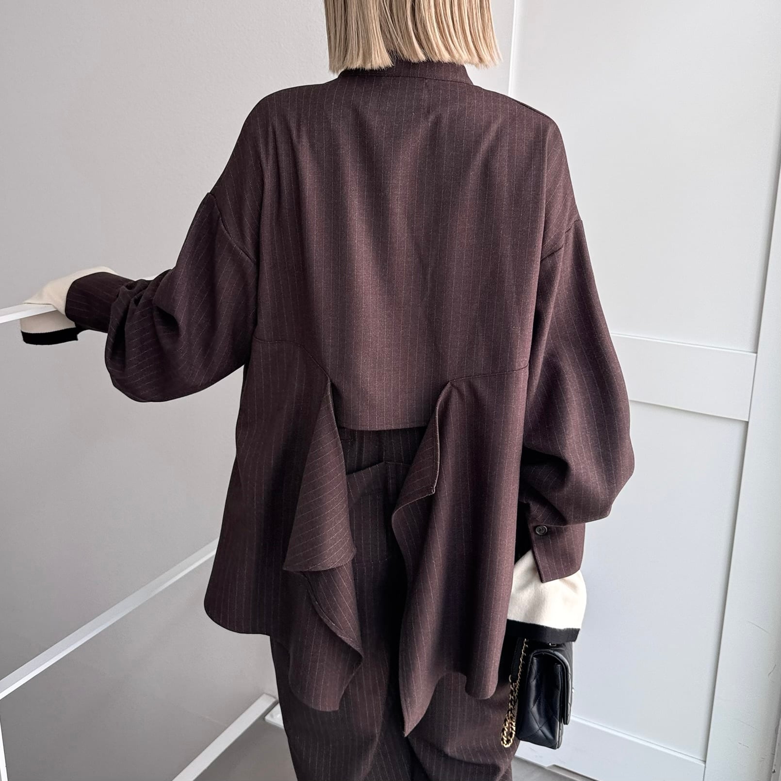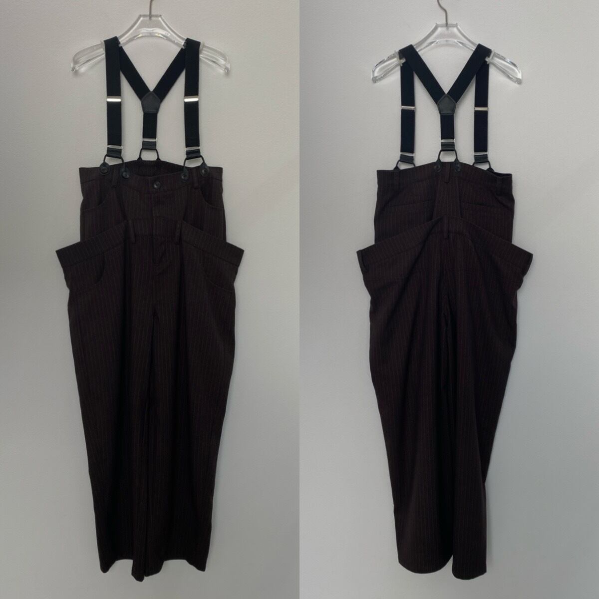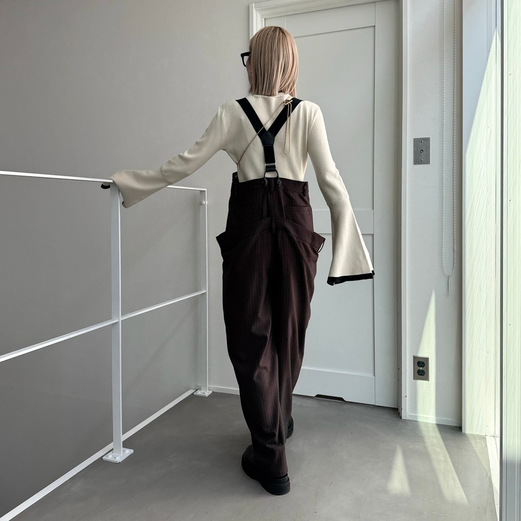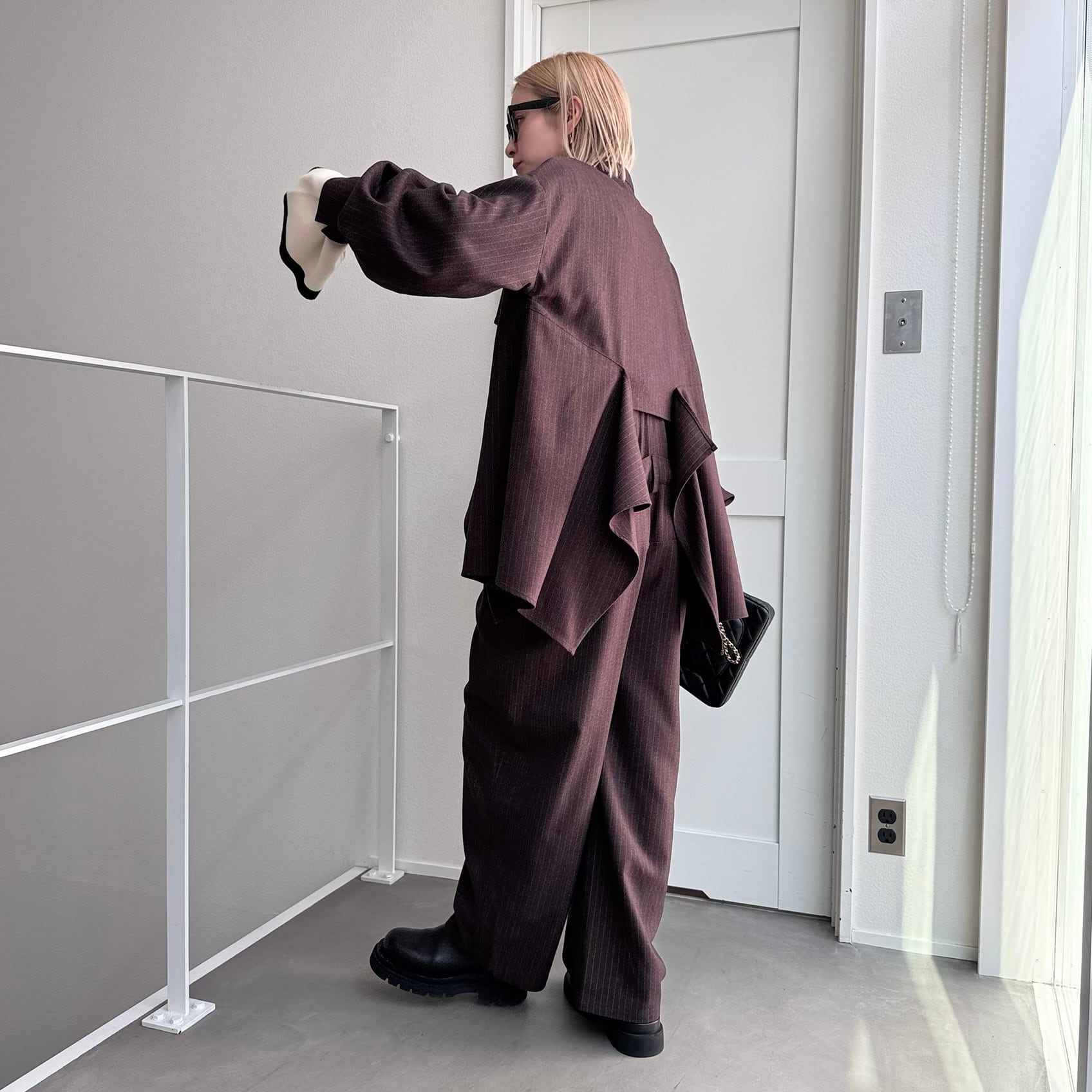 品のあるピンストライプがポイントのジップジャケット&サロペット。細めのピンストライプがオケージョンはもちろん、合わせるインナーでカジュアルコーデも楽しめるセットアップです。ドレープ部分は腰回りを隠してくれるロング丈で、動きのあるデザイン。サロペットは、ウエスト部分を重ねたドッキングデザインで、サスペンダーを外してウエストボタンを切り替えるだけでハイウエストパンツとしても着用いただけます。デザイン性のあるボトムはどんなアイテムにも合わせやすくデイリーにも使いやすいサロペットです。