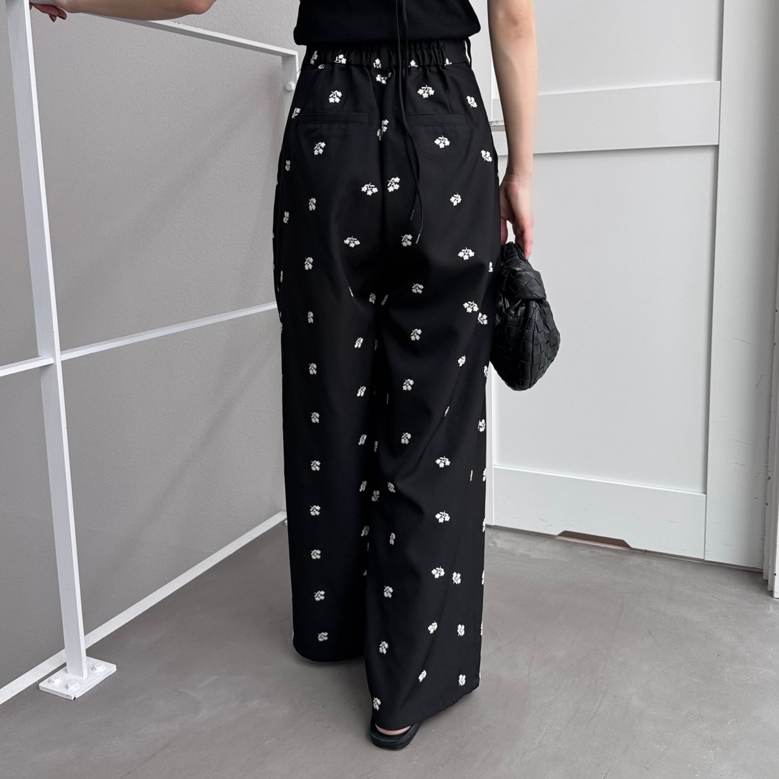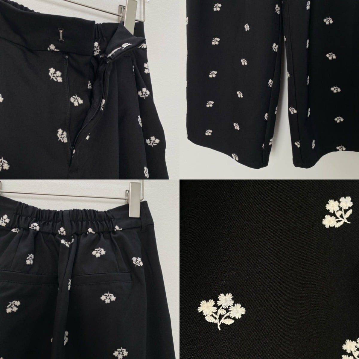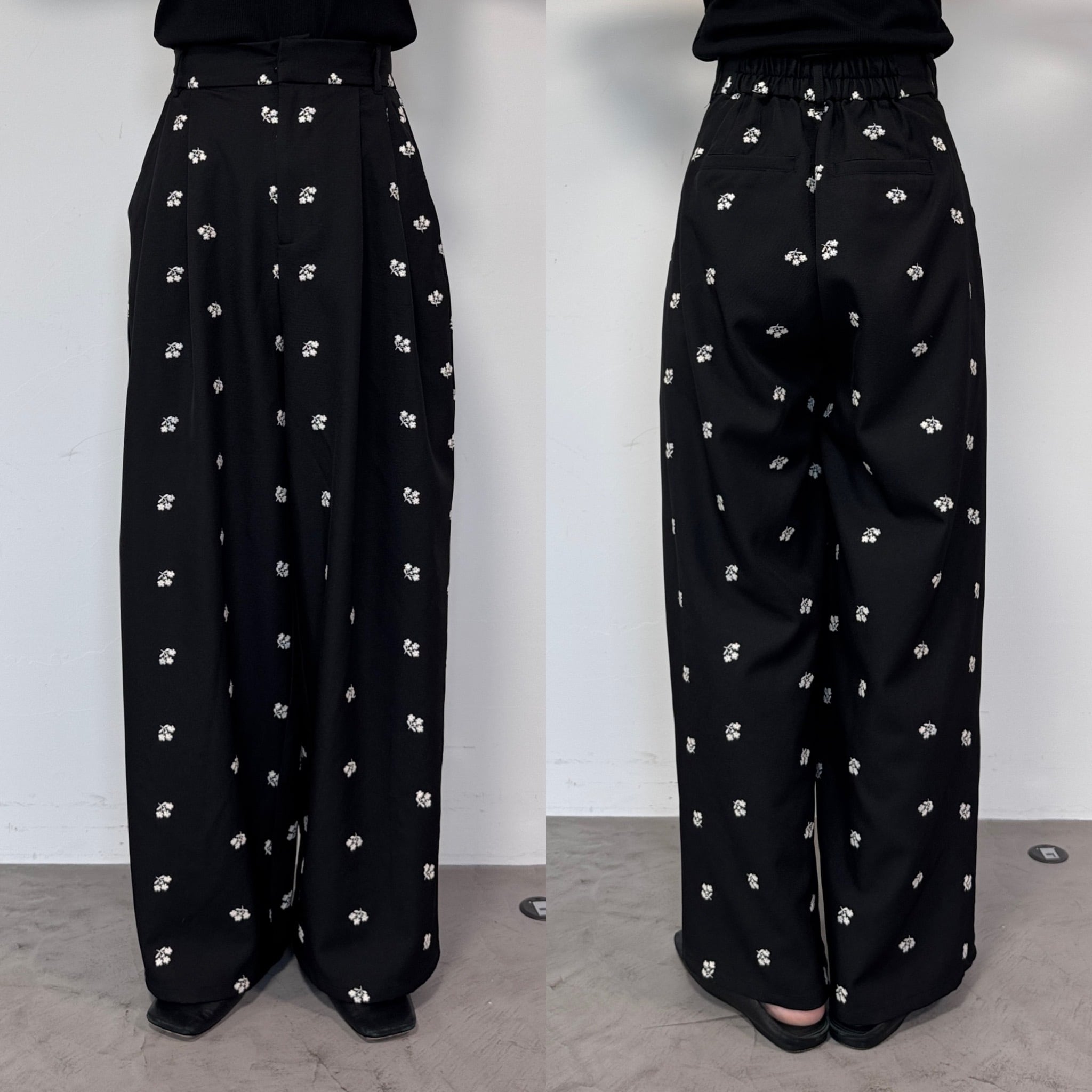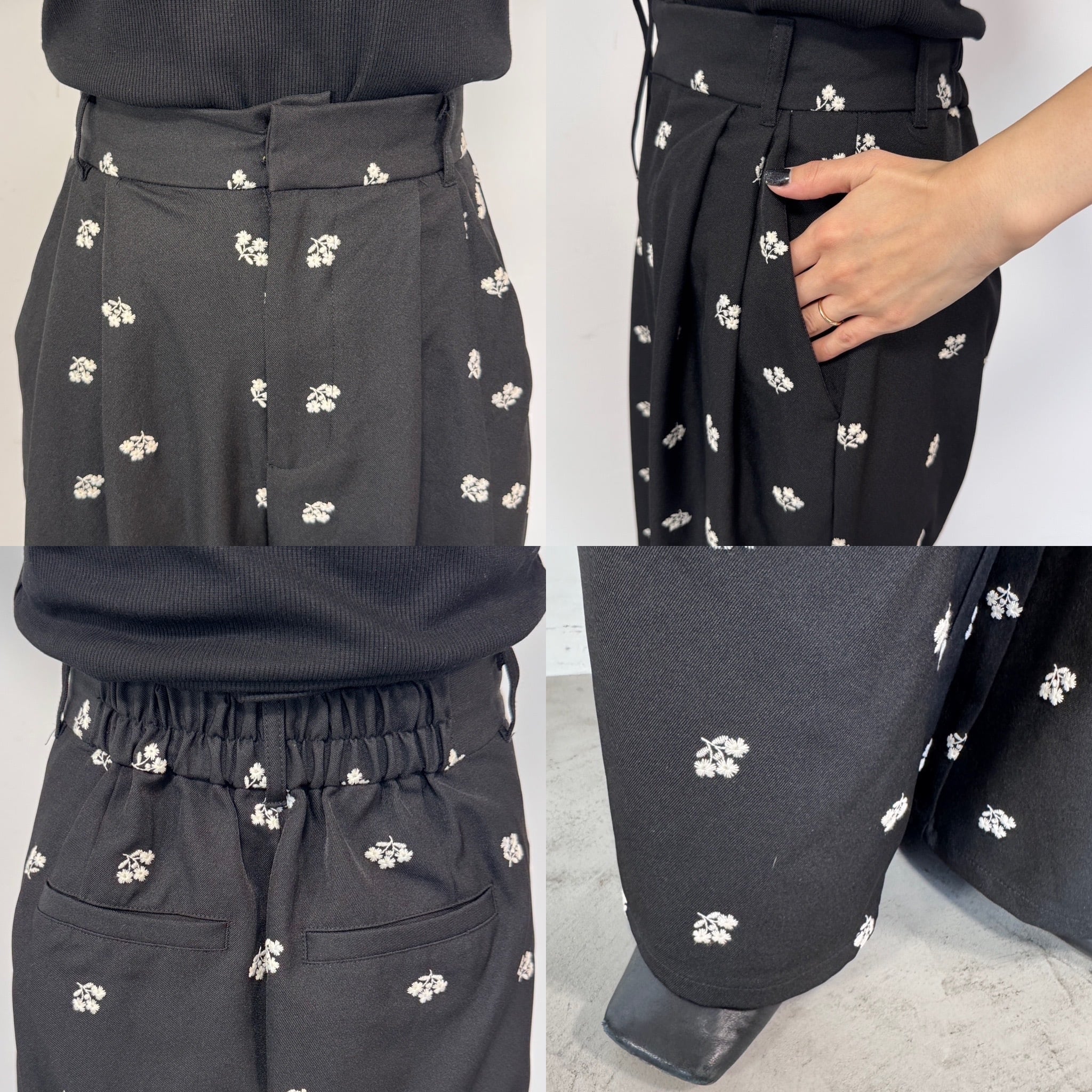 ミニフラワー刺繍タックPT/ブラック