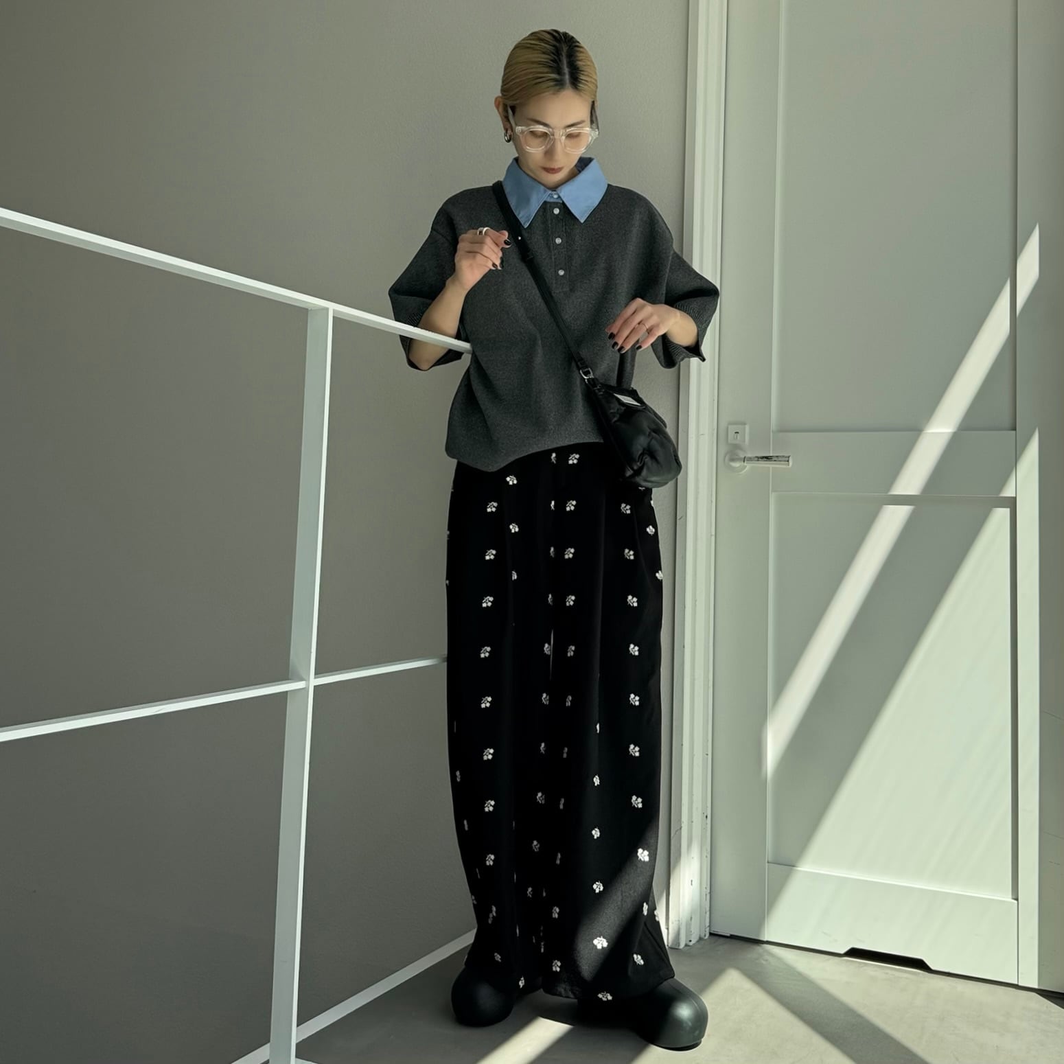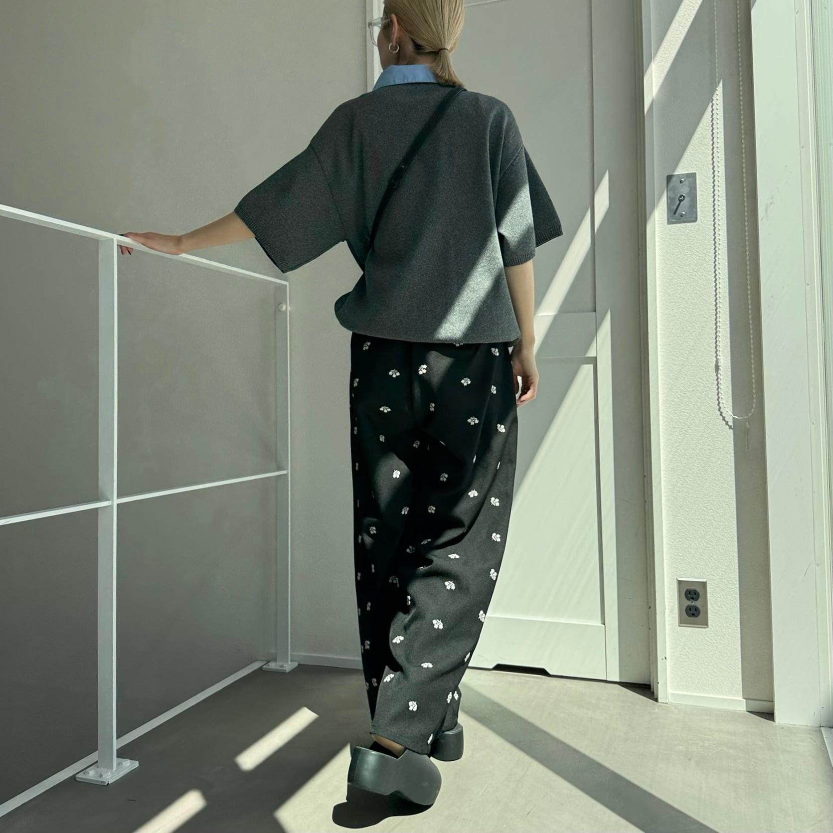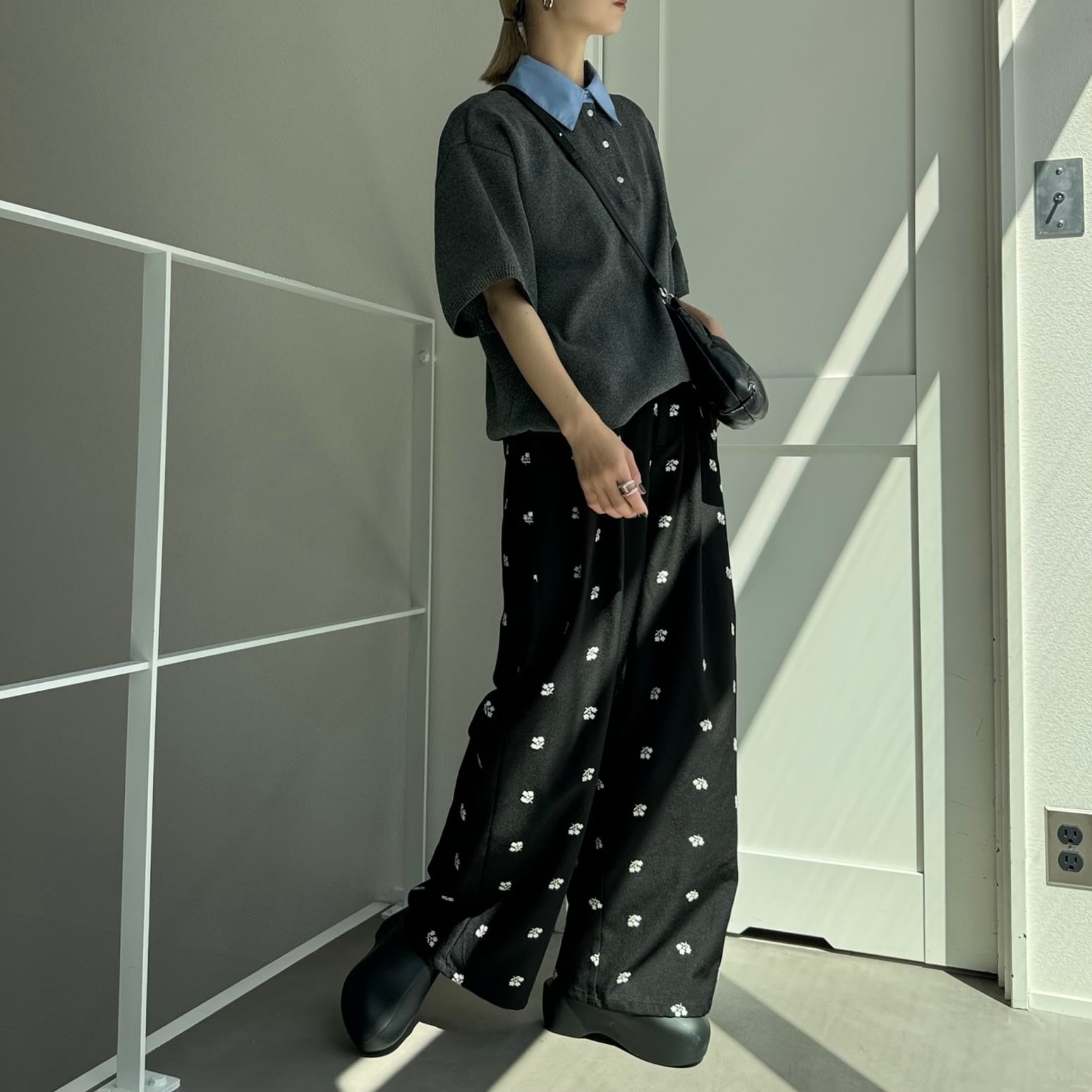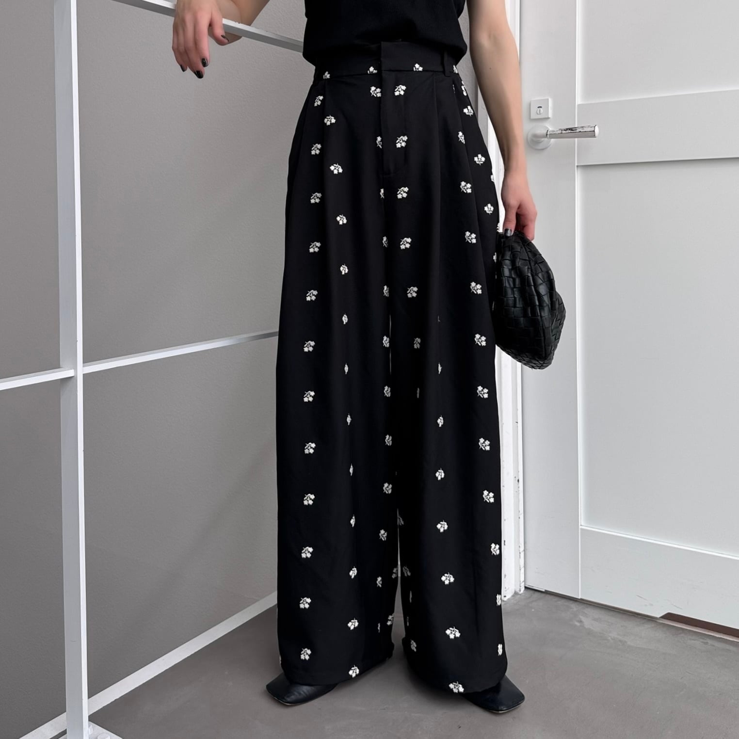 ミニフラワー刺繍タックPT/ブラック