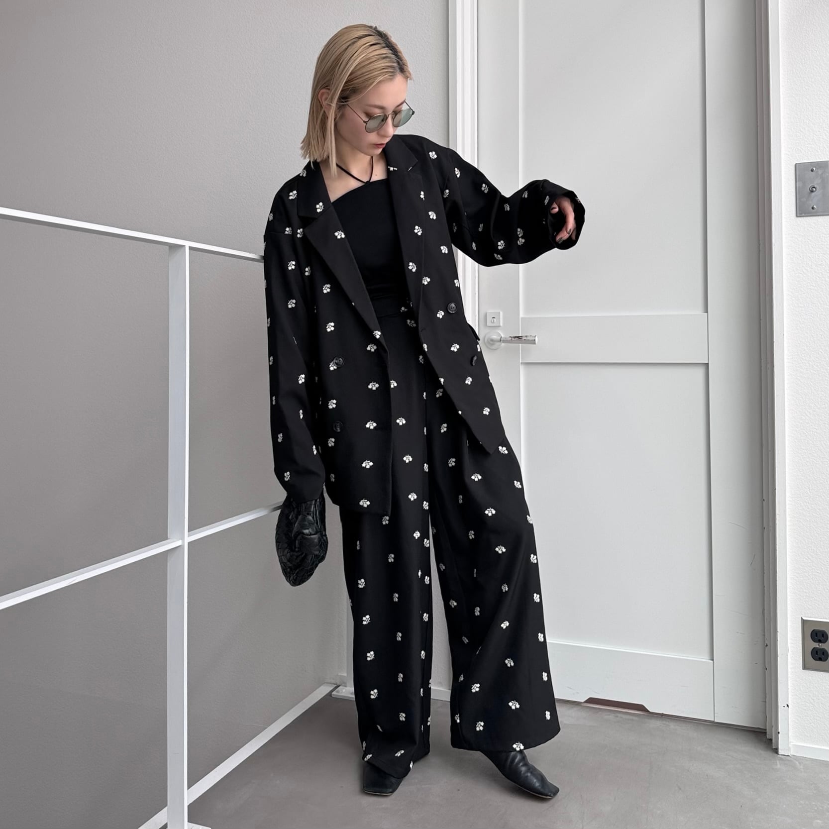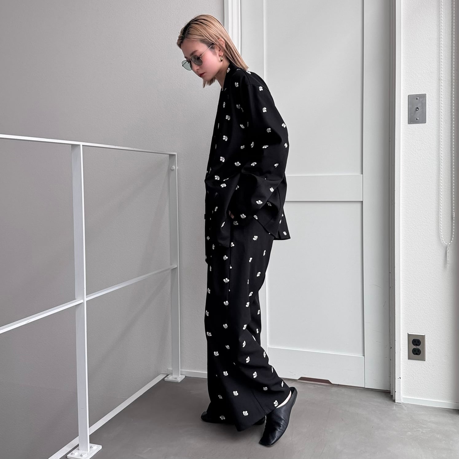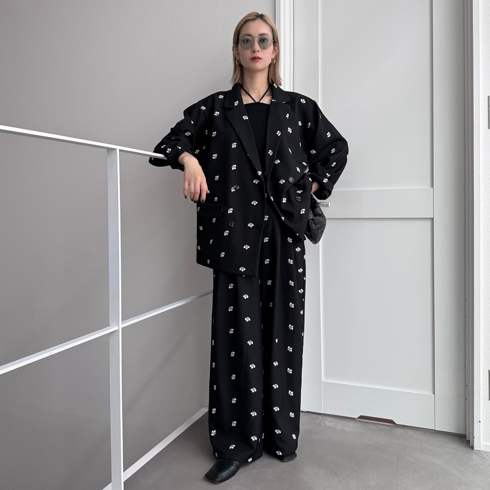 小花柄の刺繍が目を惹くタックパンツ。 スタイリッシュなストレートシルエットでカジュアルにもフォーマルにも合わせやすく、幅広いシーンでお楽しみいただけます。同生地/同柄のジャケットとセットアップ着用も可能◎