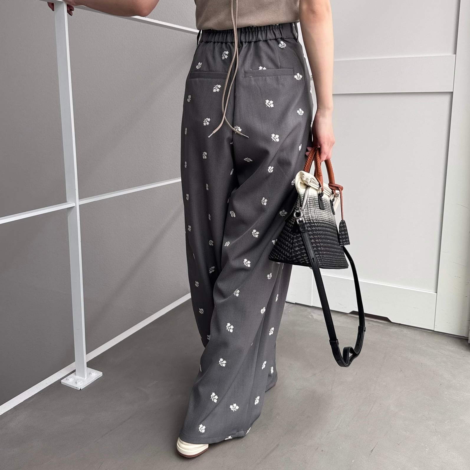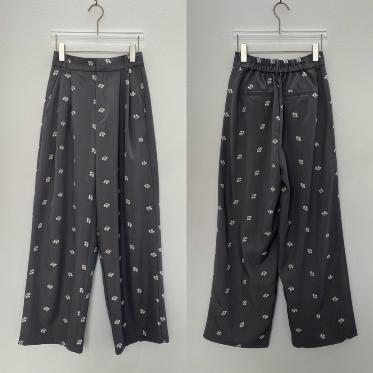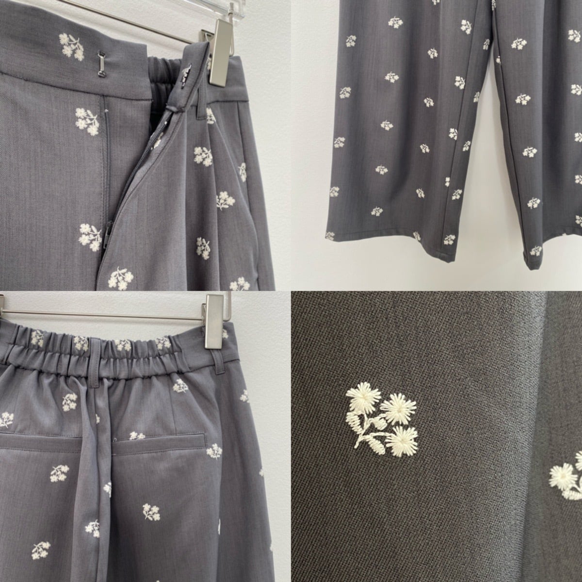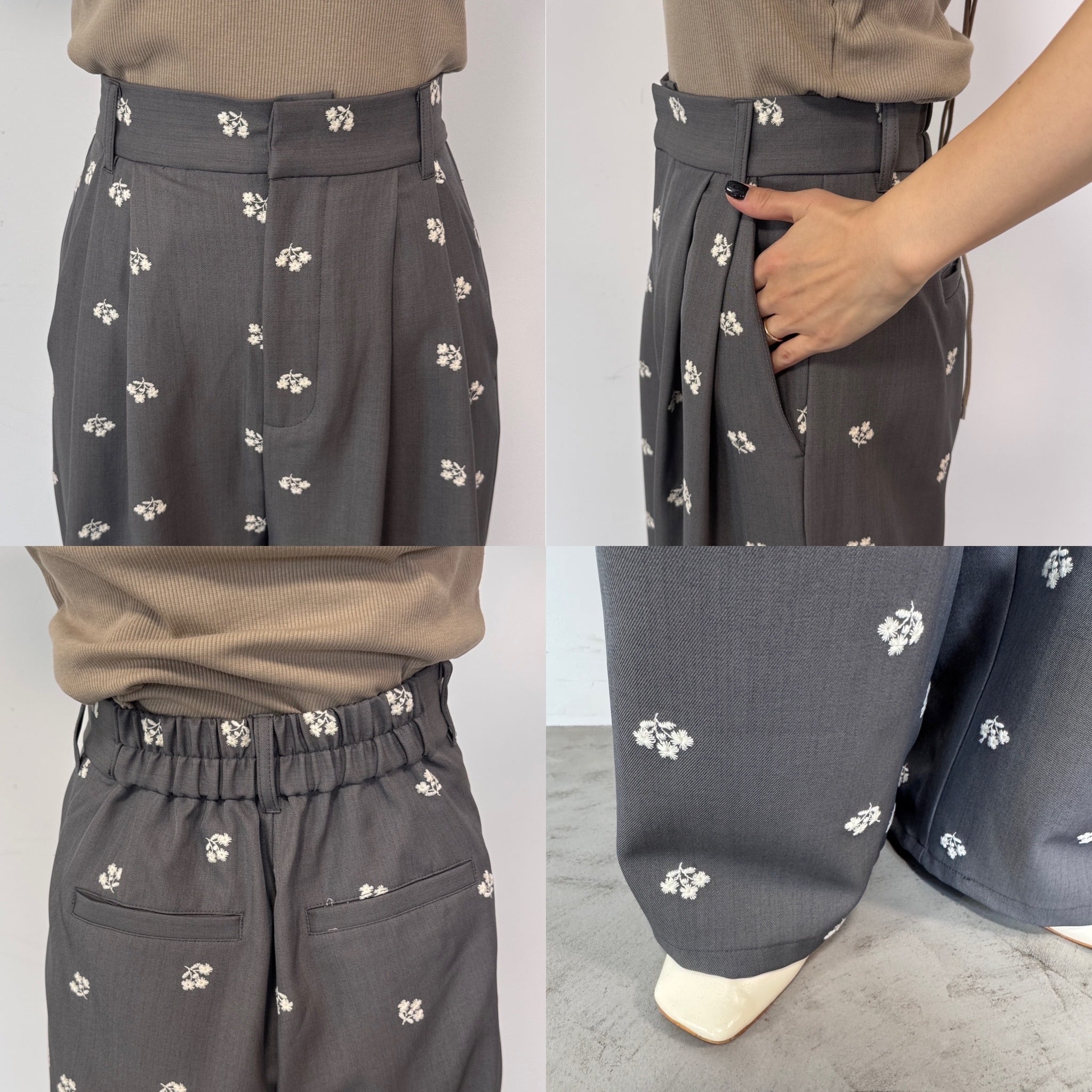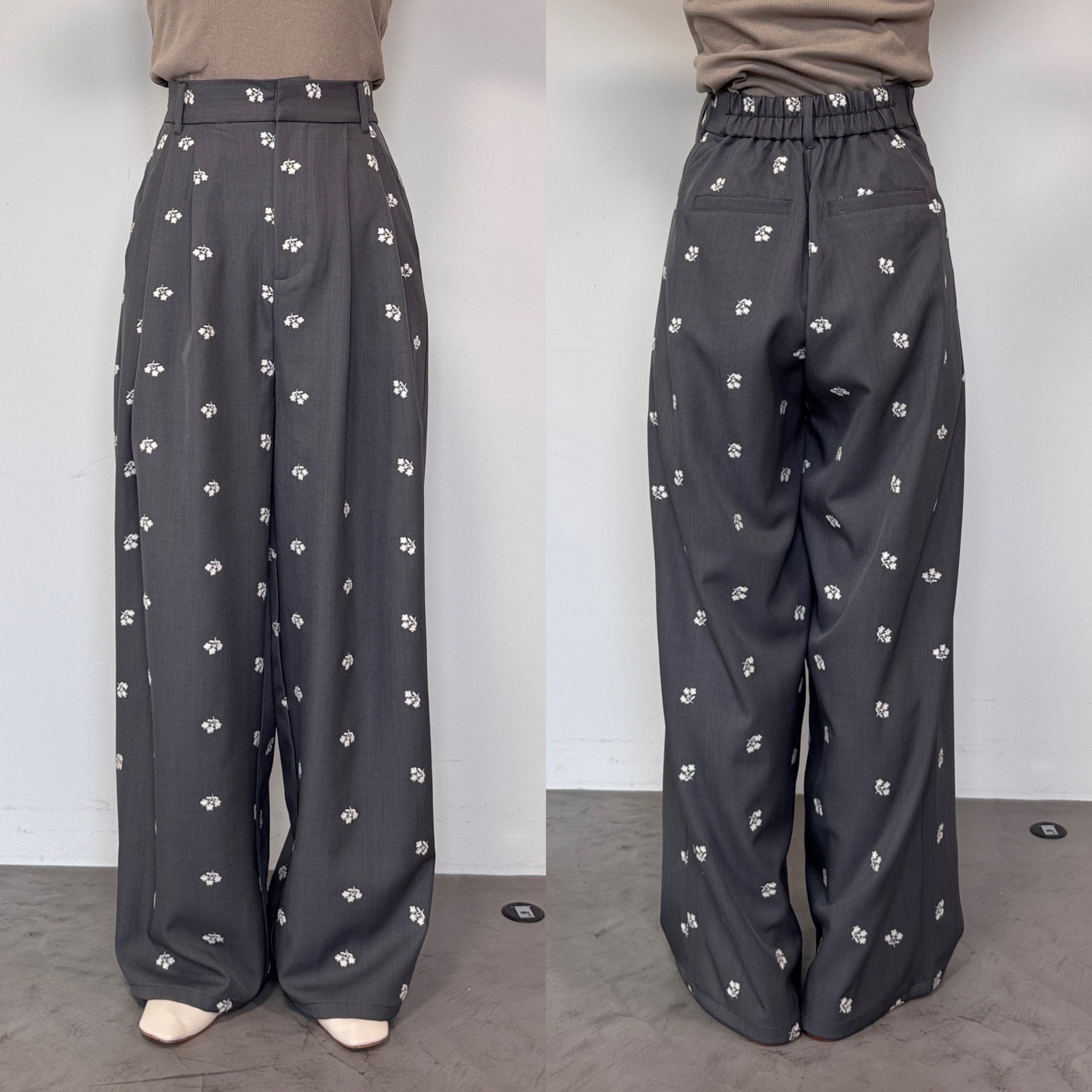 ミニフラワー刺繍タックPT/グレー