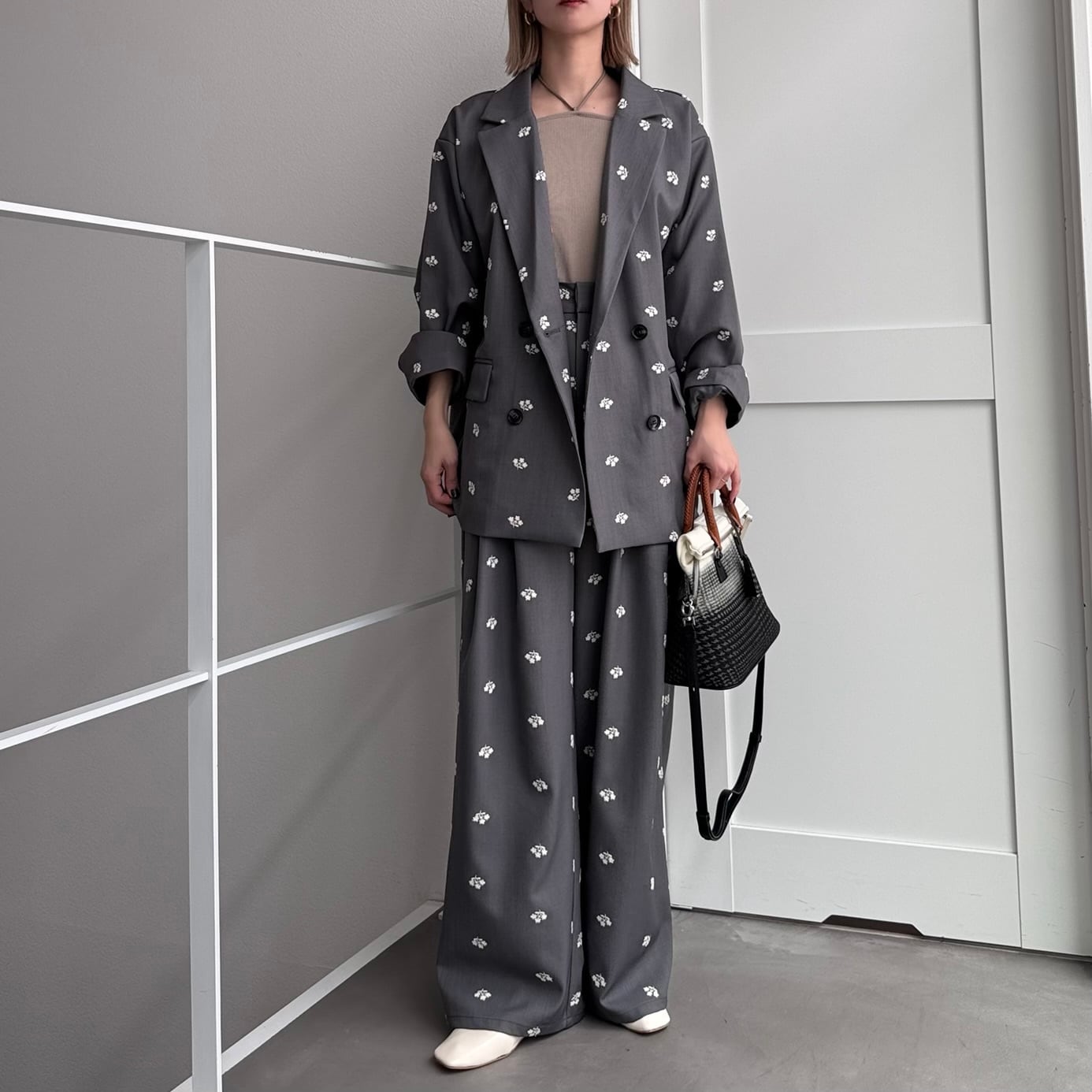 小花柄の刺繍が目を惹くタックパンツ。 スタイリッシュなストレートシルエットでカジュアルにもフォーマルにも合わせやすく、幅広いシーンでお楽しみいただけます。同生地/同柄のジャケットとセットアップ着用も可能◎