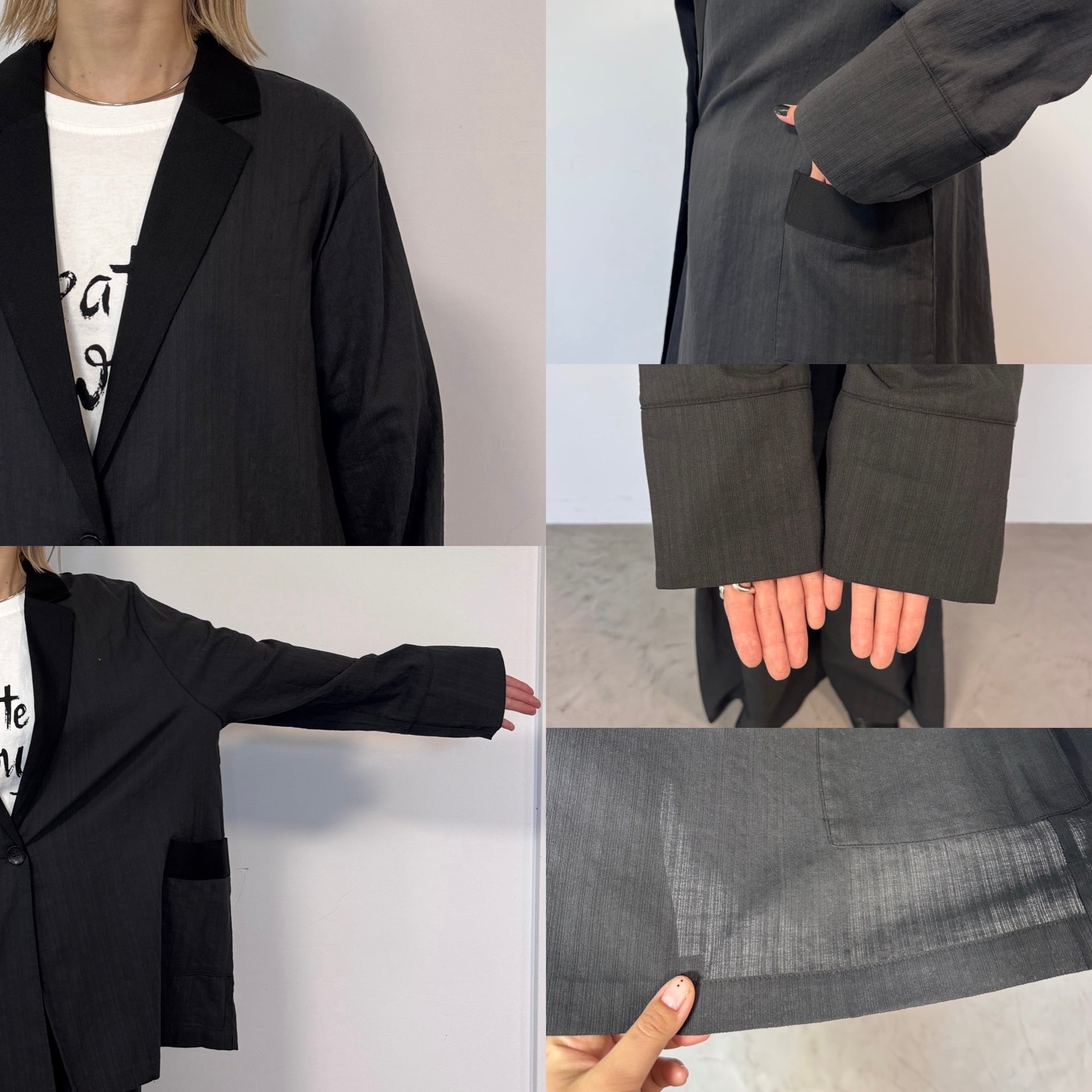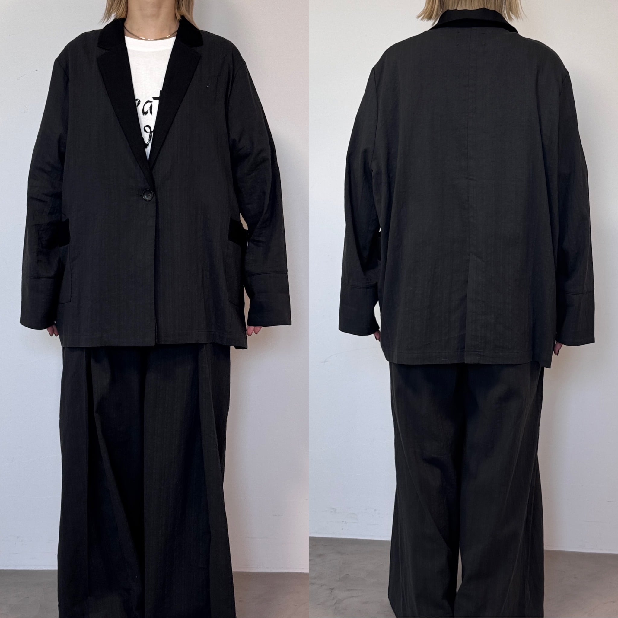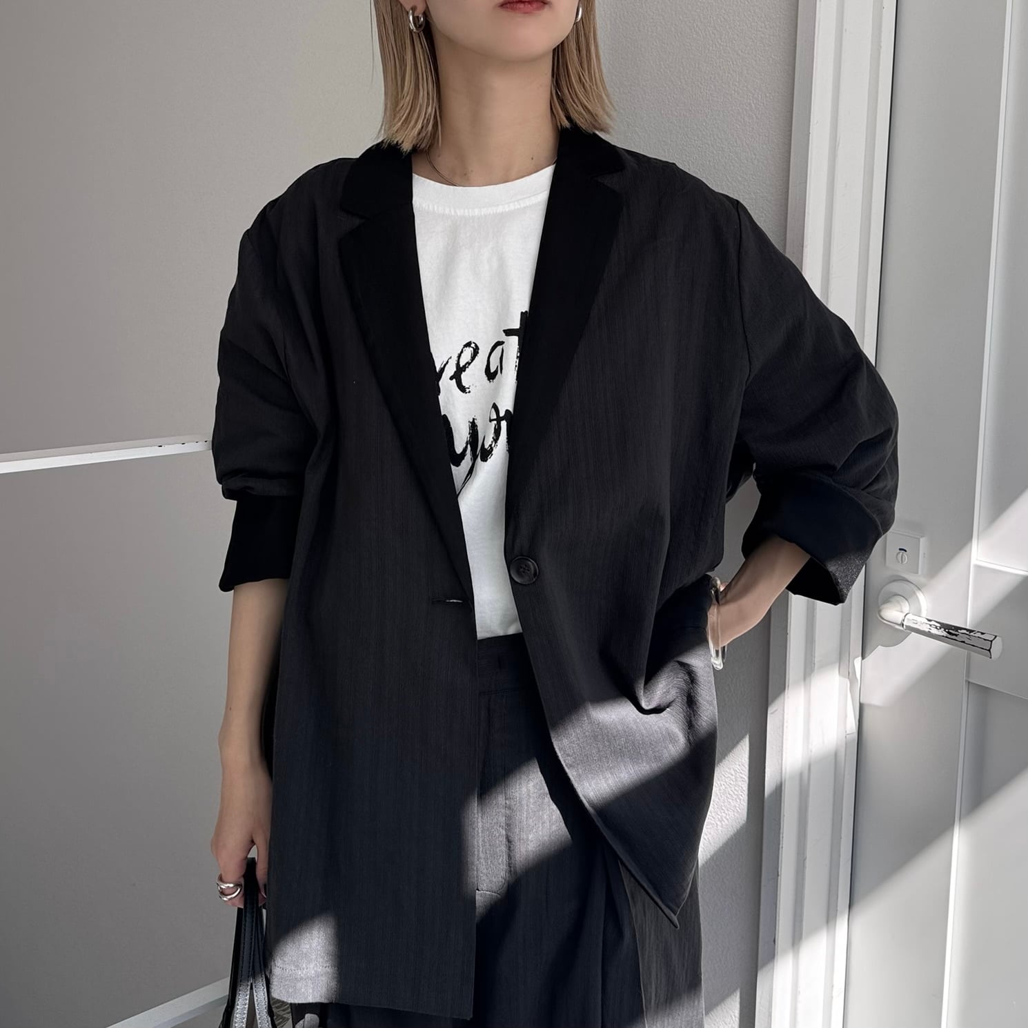 麻のような生地で通気性が良く、さらっと軽やかな着心地が特徴のテーラードジャケット。襟と袖の折り返し部分が異素材の切替えデザインがアクセントに◎カジュアルにはもちろんこれからの季節のスタイリッシュなフォーマルコーデにもお楽しみいただけます。同生地のパンツとセットアップ着用も可能◎