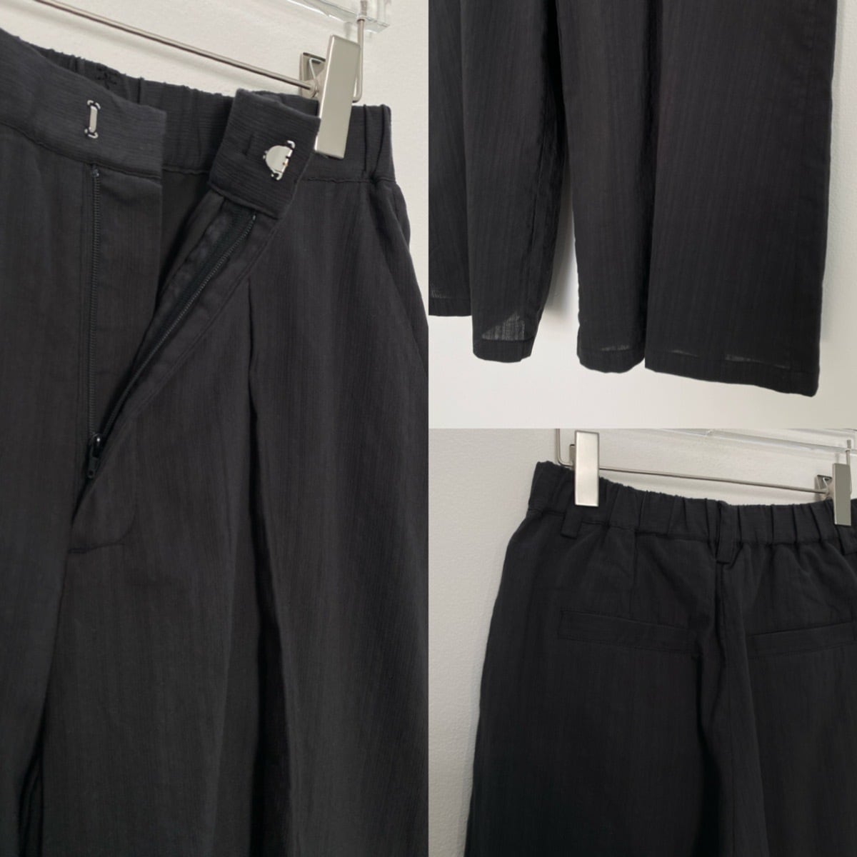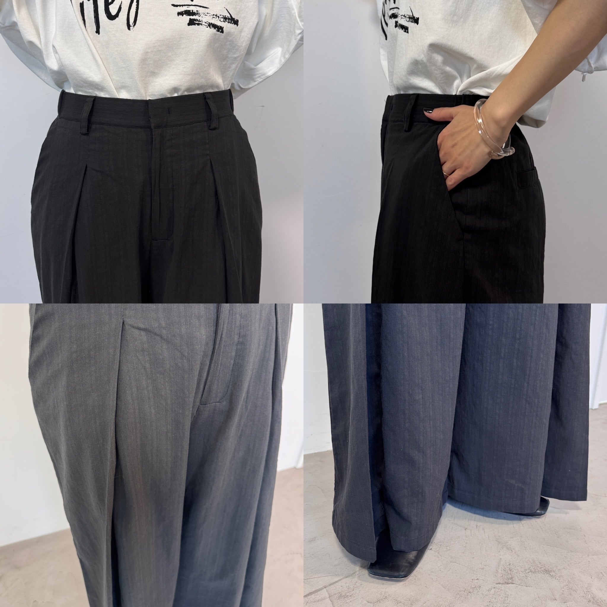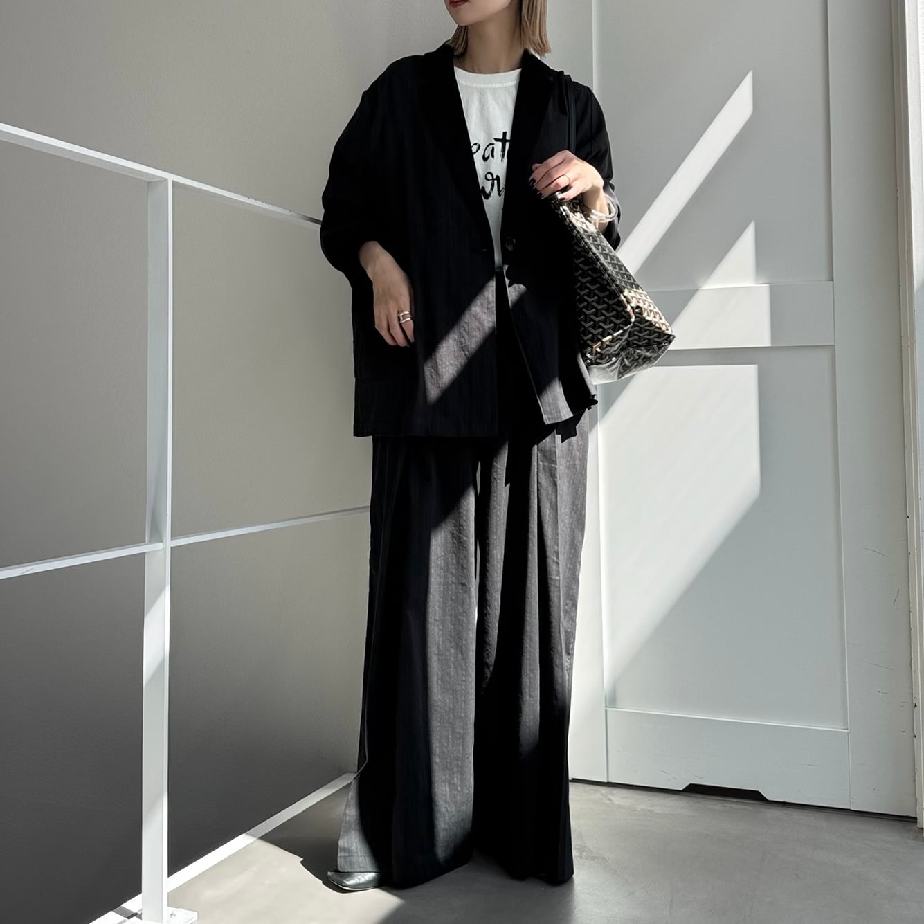 麻のような軽やかな着心地のワイドパンツ。幅の深いタックが入っているため、ワイドながらもきれいなシルエットに。カジュアルにはもちろんこれからの季節のスタイリッシュなフォーマルコーデにもお楽しみいただけます。同生地のジャケットとセットアップ着用も可能◎