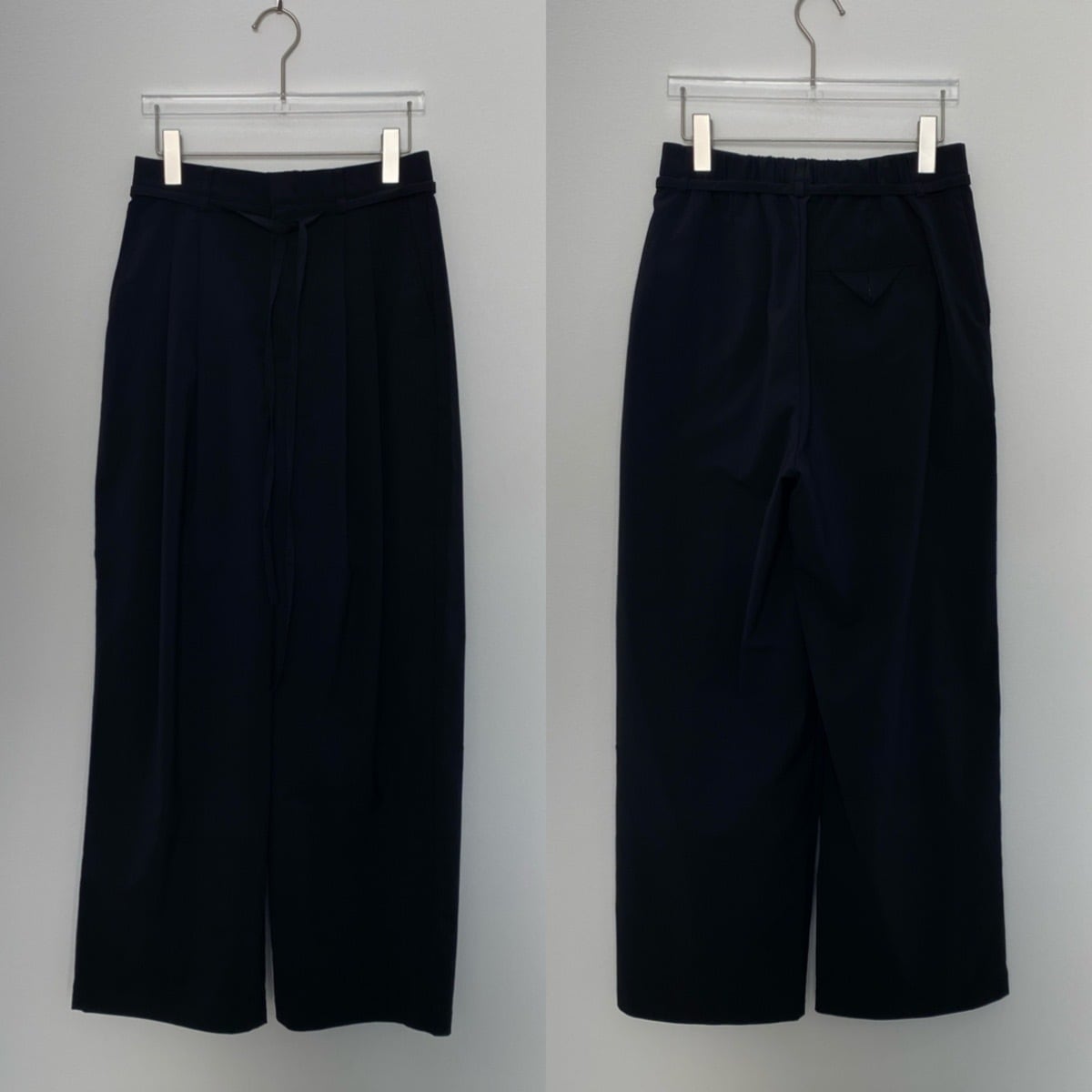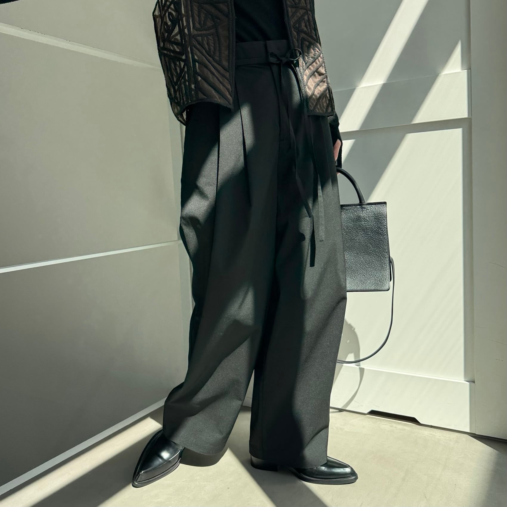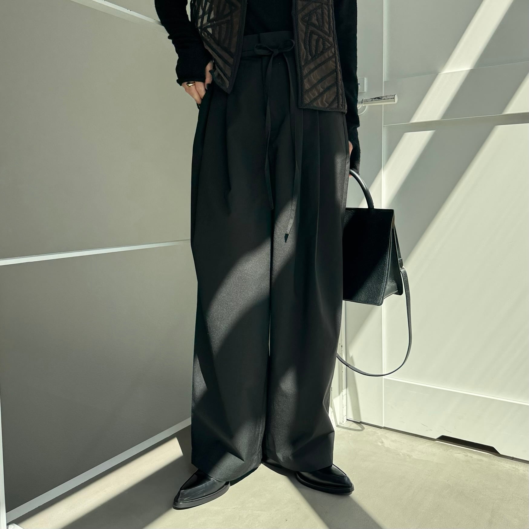 タブルベルトループ付きのタックパンツ。麻ライクな素材感が軽やかで、シーズンを通して着回しが可能◎ウエスト部分には華奢な紐が付いており、機能性だけでなくデザインのアクセントに◎デイリー使いからフォーマルコーデまで幅広いスタイリングをお楽しみいただけます。