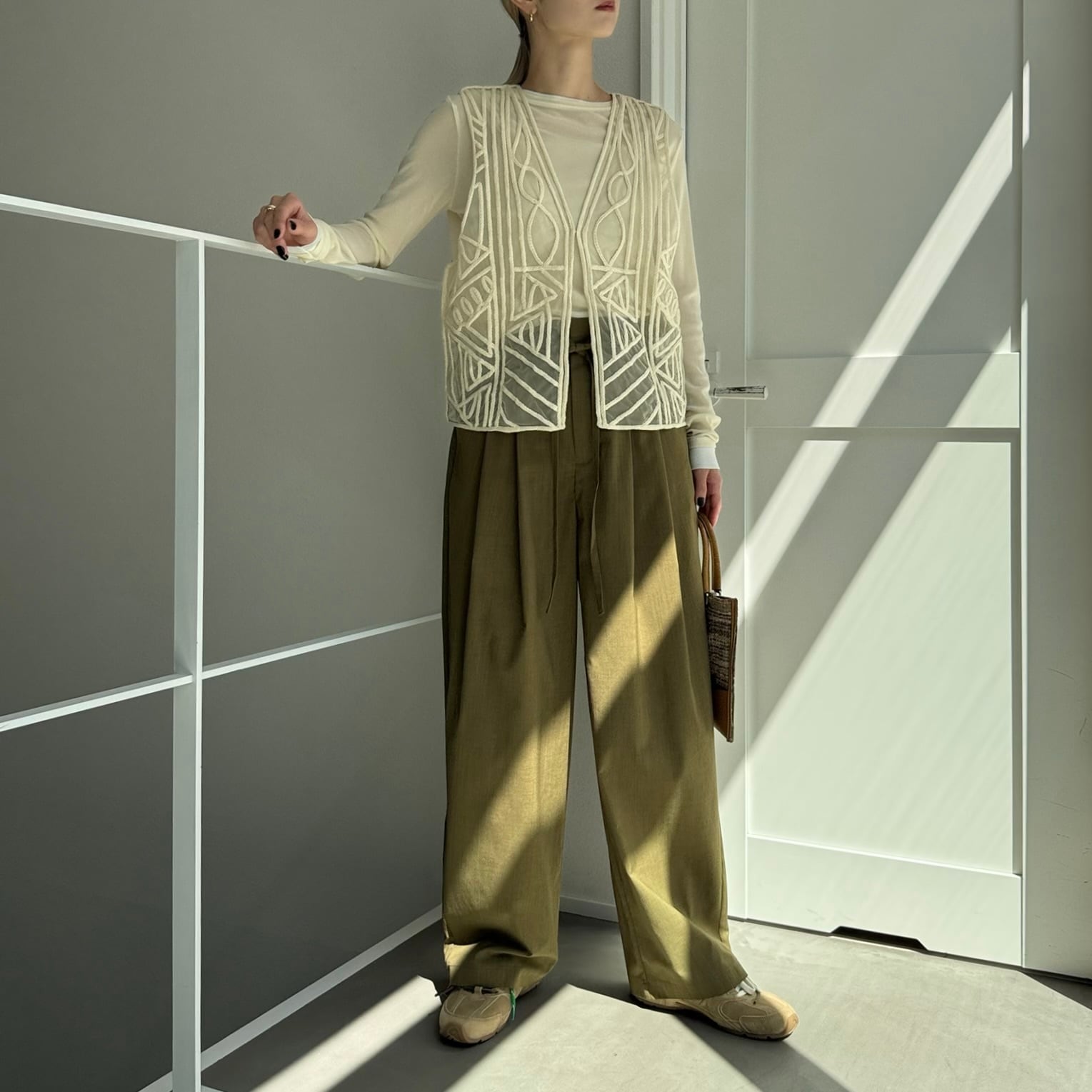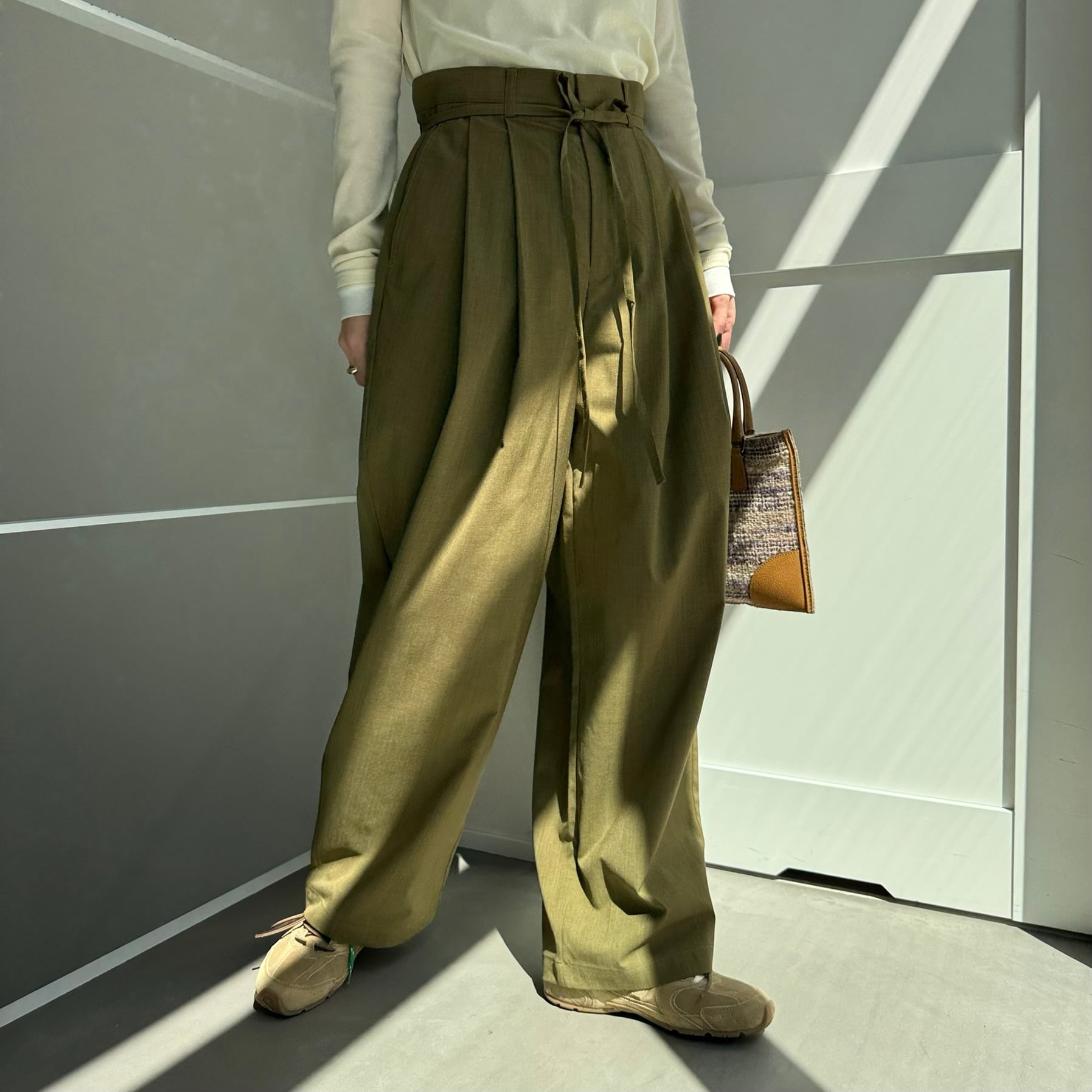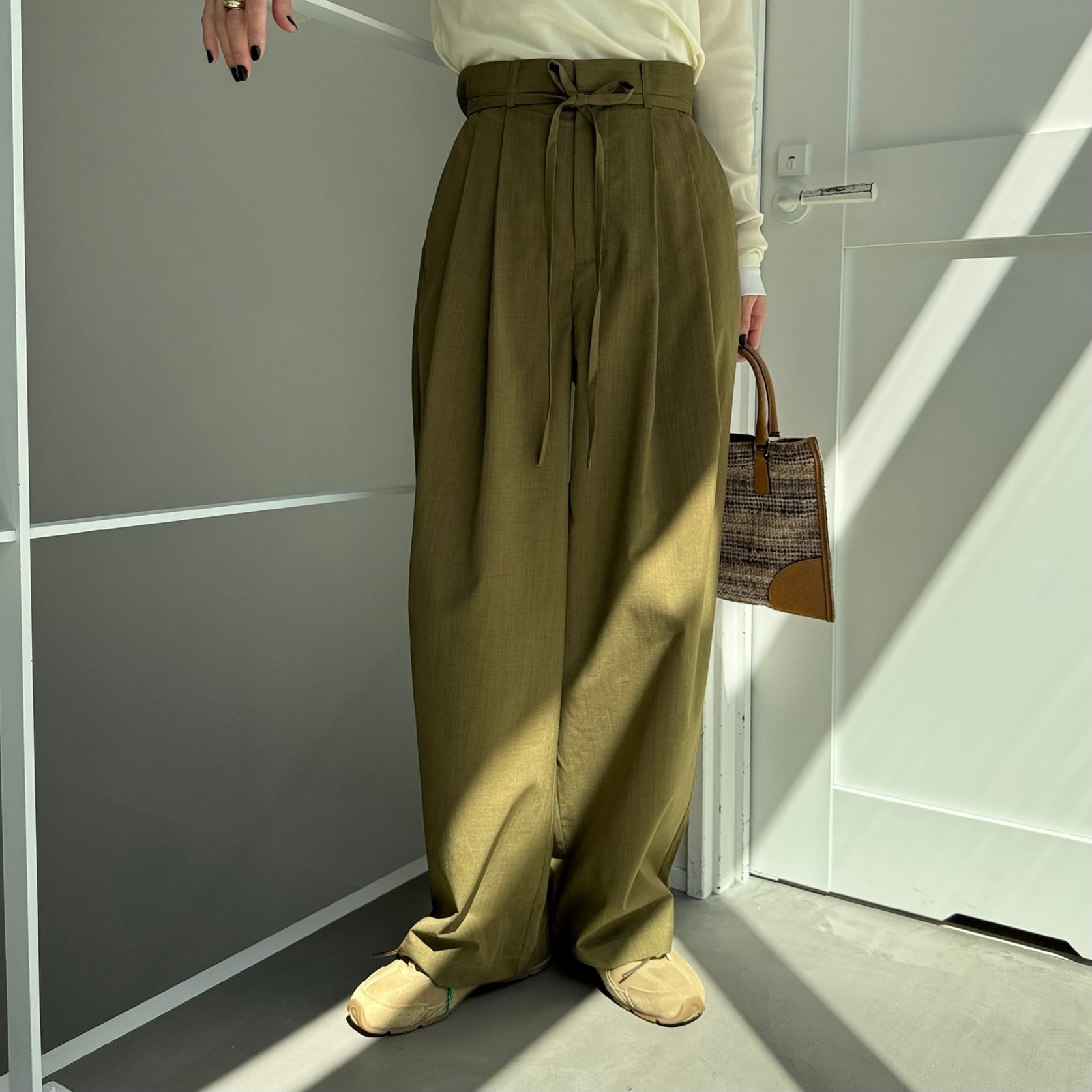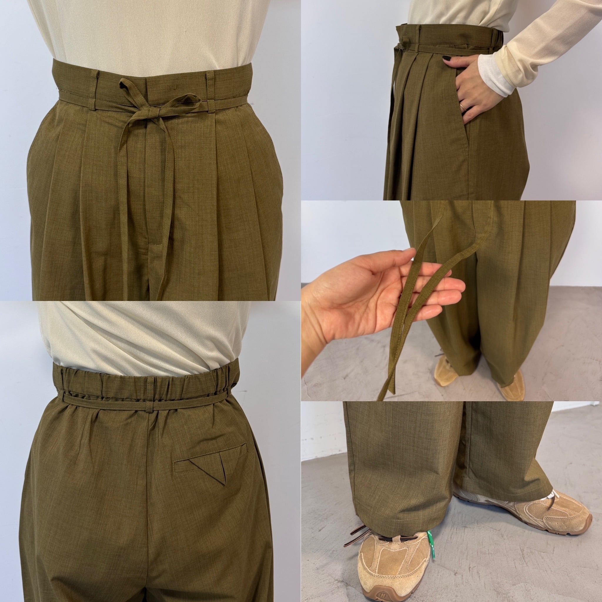 タブルベルトループ付きのタックパンツ。麻ライクな素材感が軽やかで、シーズンを通して着回しが可能◎ウエスト部分には華奢な紐が付いており、機能性だけでなくデザインのアクセントに◎デイリー使いからフォーマルコーデまで幅広いスタイリングをお楽しみいただけます。