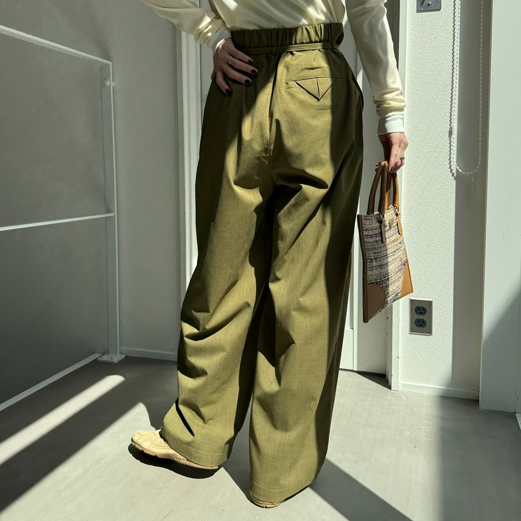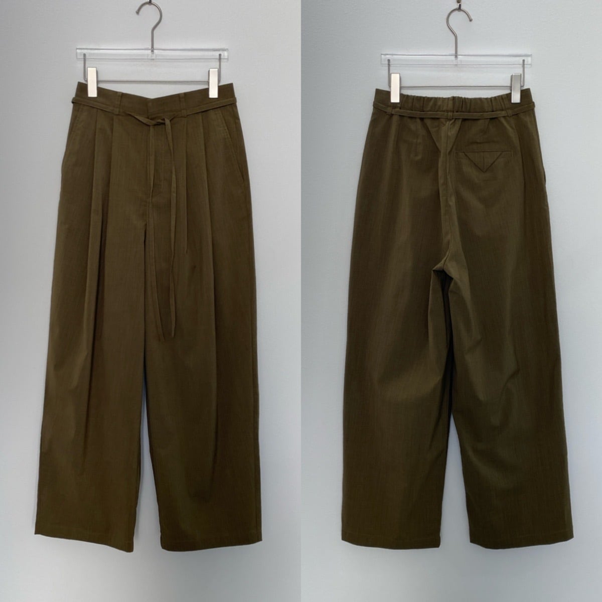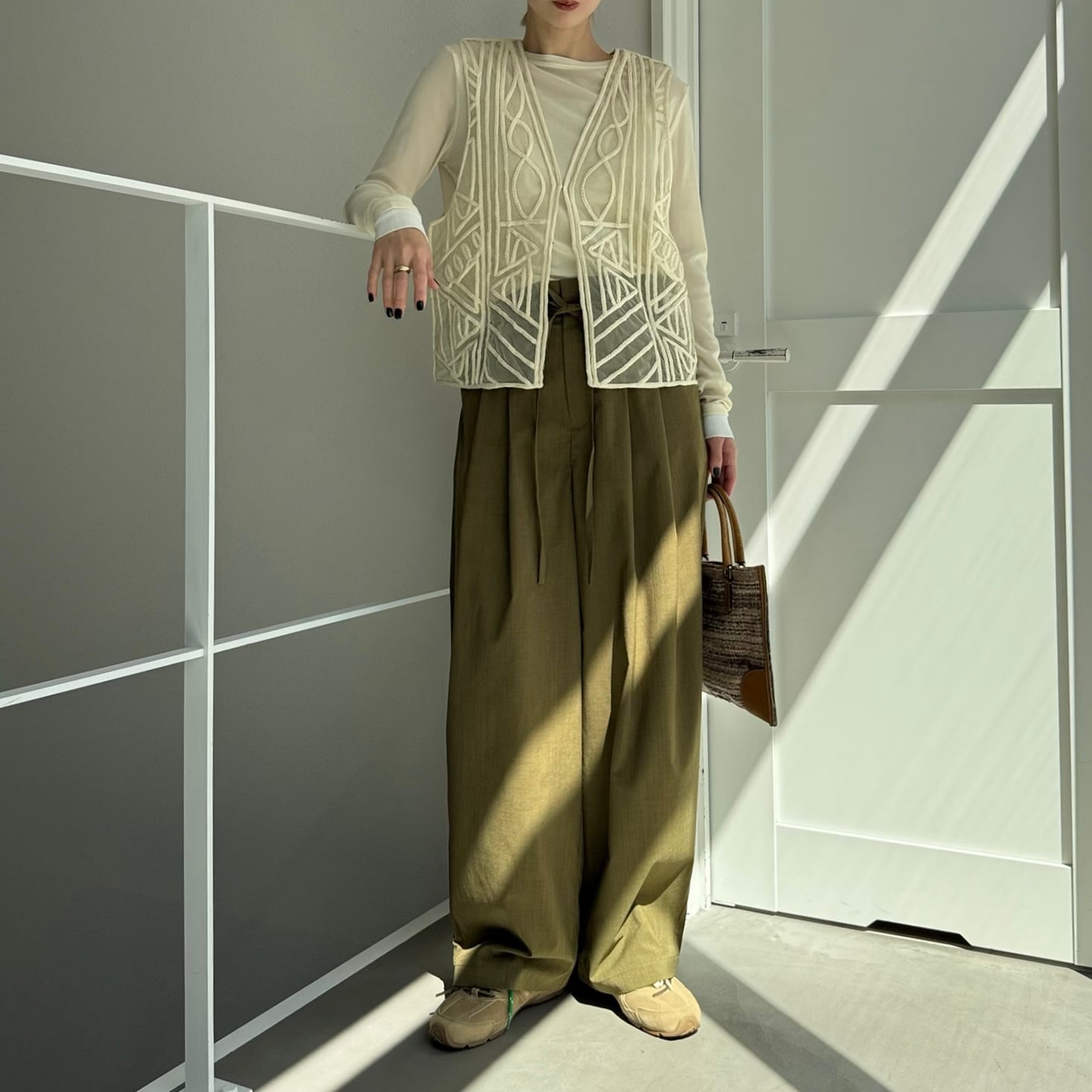 タブルベルトループ付きのタックパンツ。麻ライクな素材感が軽やかで、シーズンを通して着回しが可能◎ウエスト部分には華奢な紐が付いており、機能性だけでなくデザインのアクセントに◎デイリー使いからフォーマルコーデまで幅広いスタイリングをお楽しみいただけます。
