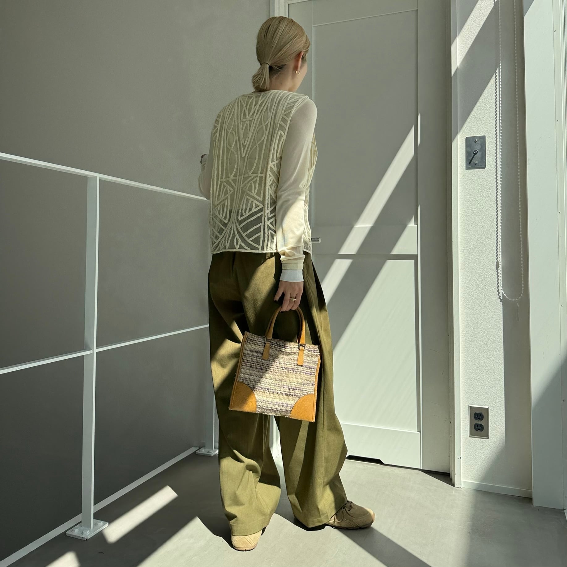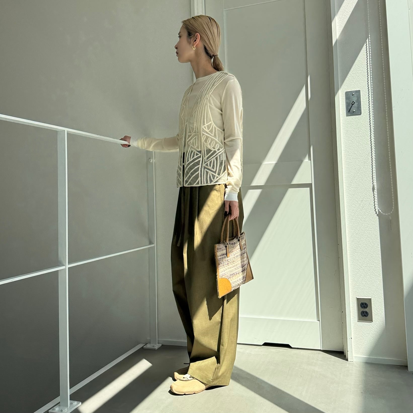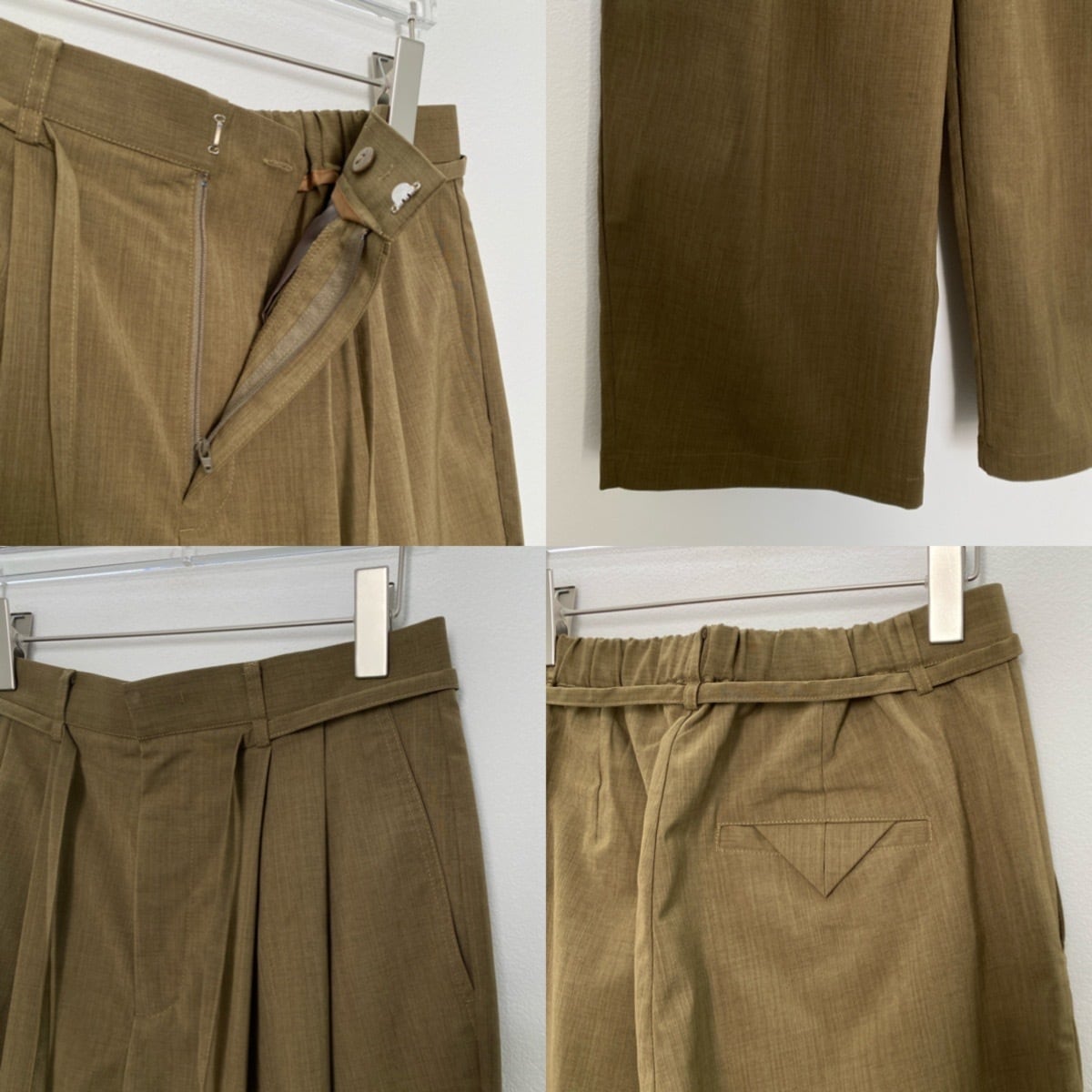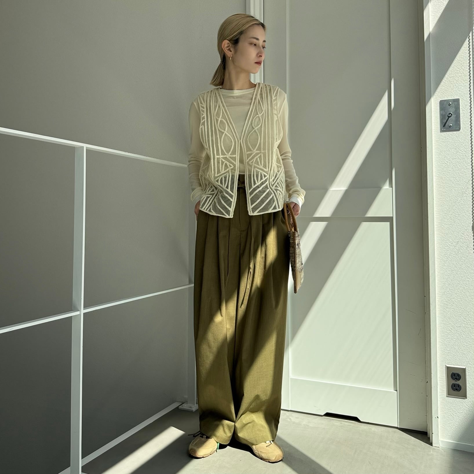 タブルベルトループ付きのタックパンツ。麻ライクな素材感が軽やかで、シーズンを通して着回しが可能◎ウエスト部分には華奢な紐が付いており、機能性だけでなくデザインのアクセントに◎デイリー使いからフォーマルコーデまで幅広いスタイリングをお楽しみいただけます。