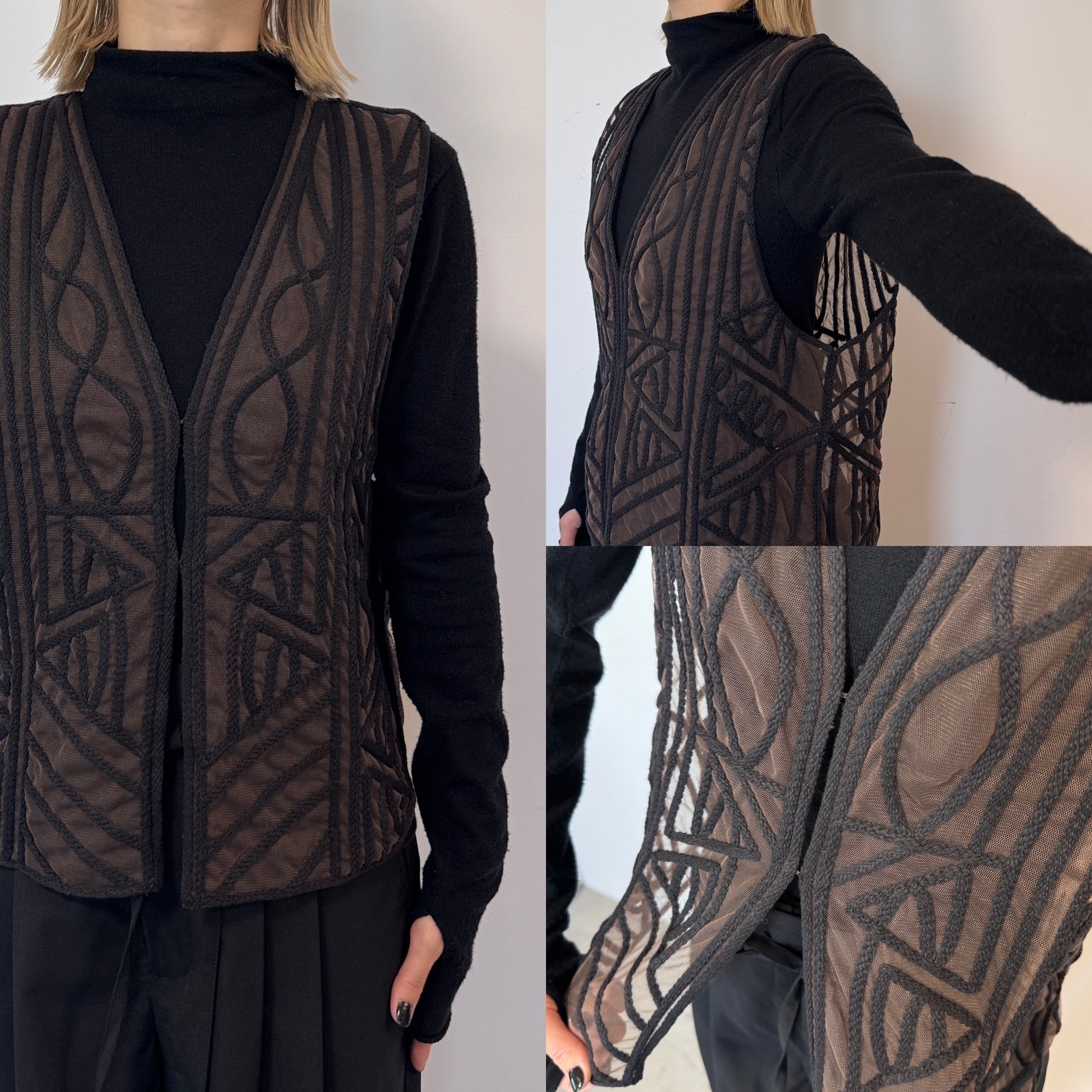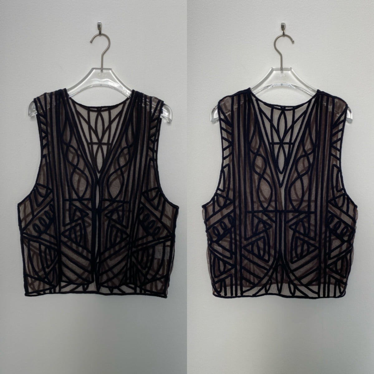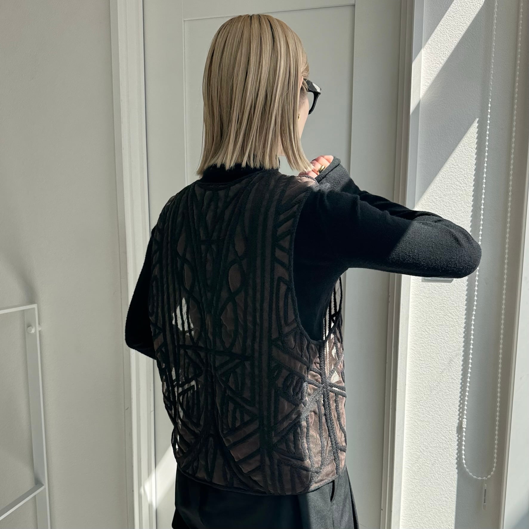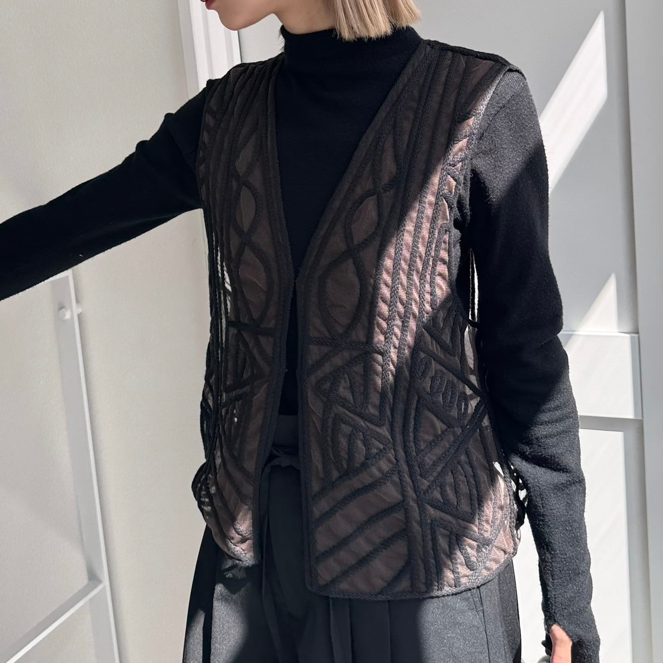 幾何学がモチーフのシアーベスト。エレガントさと個性的なデザインでシンプルなコーディネートのアクセントに◎軽やかで程よい抜け感のあるシアー素材に細やかなロープ刺繍が施されており、カジュアルからドレッシーまで幅広いスタイリングをお楽しみいただけます。