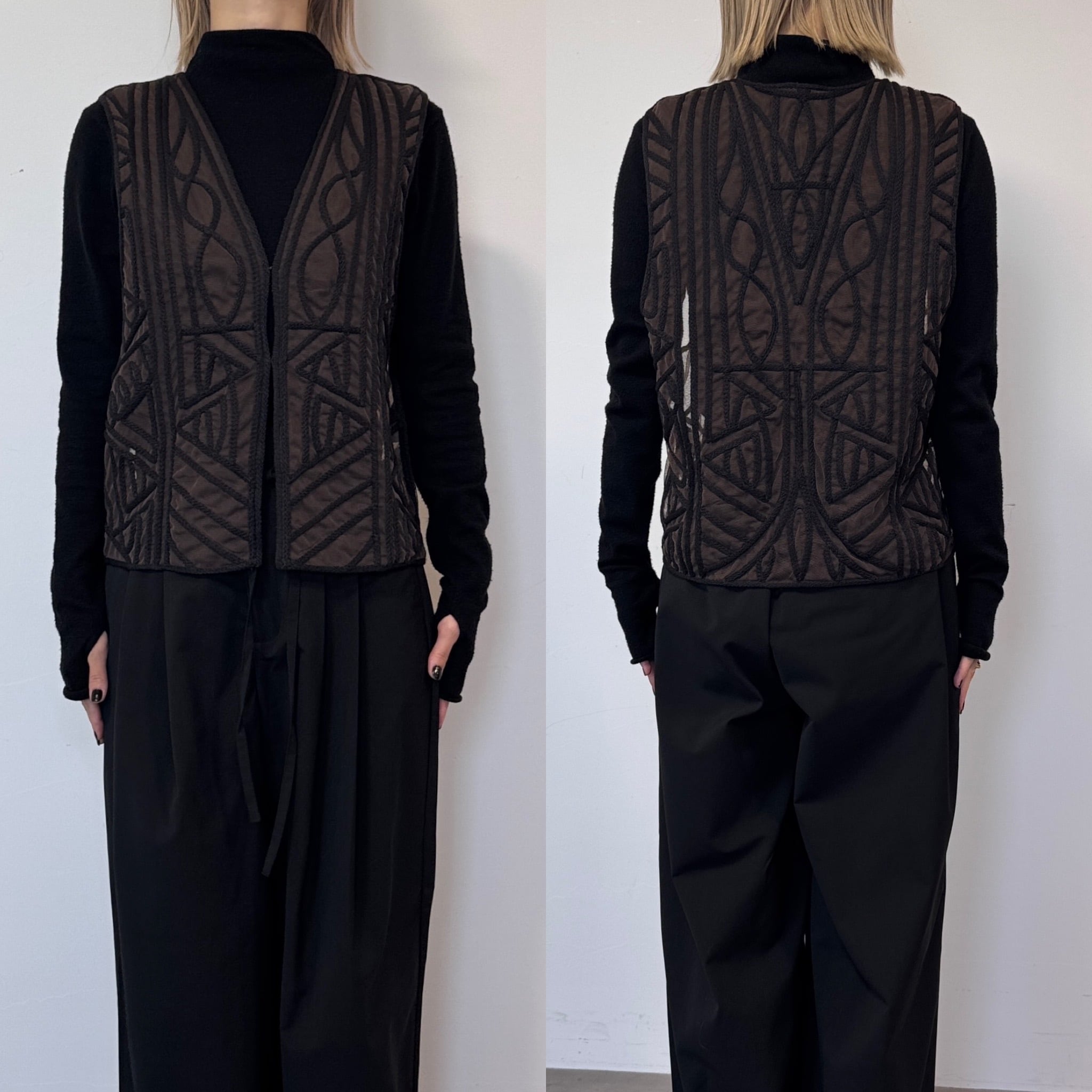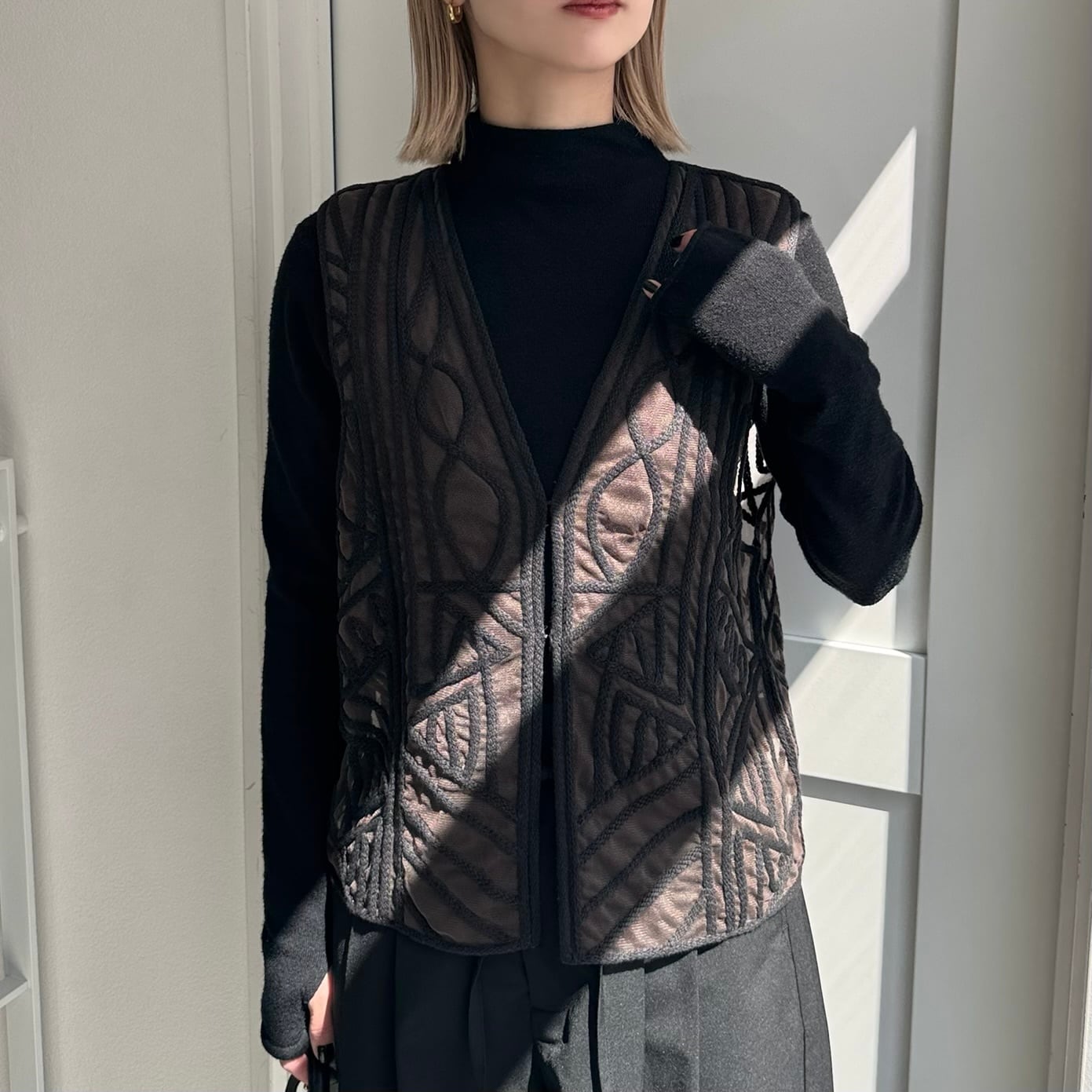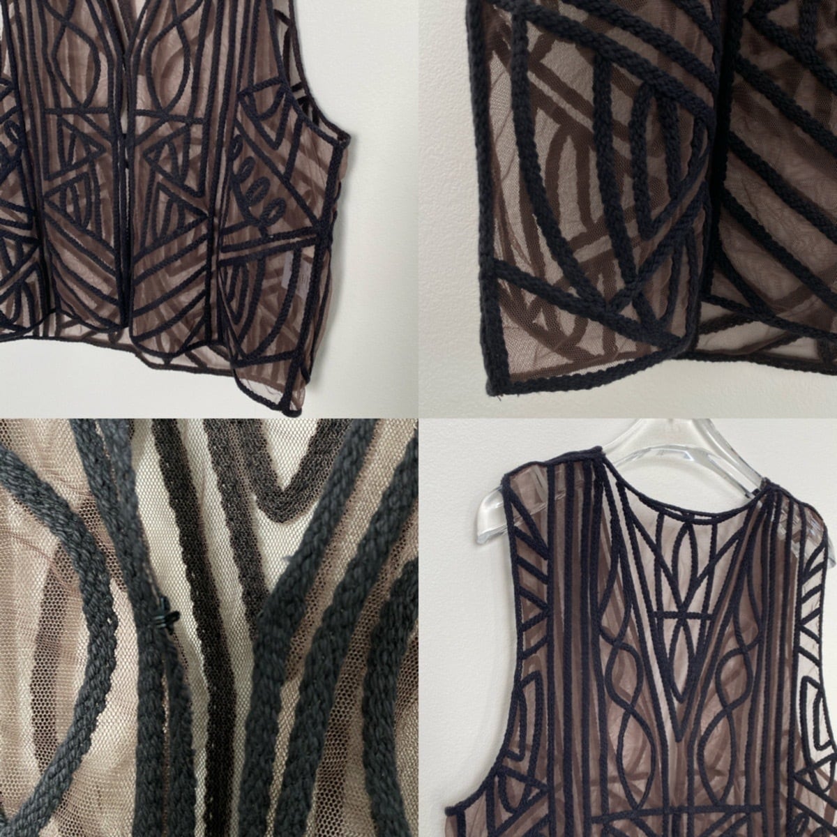 幾何学がモチーフのシアーベスト。エレガントさと個性的なデザインでシンプルなコーディネートのアクセントに◎軽やかで程よい抜け感のあるシアー素材に細やかなロープ刺繍が施されており、カジュアルからドレッシーまで幅広いスタイリングをお楽しみいただけます。