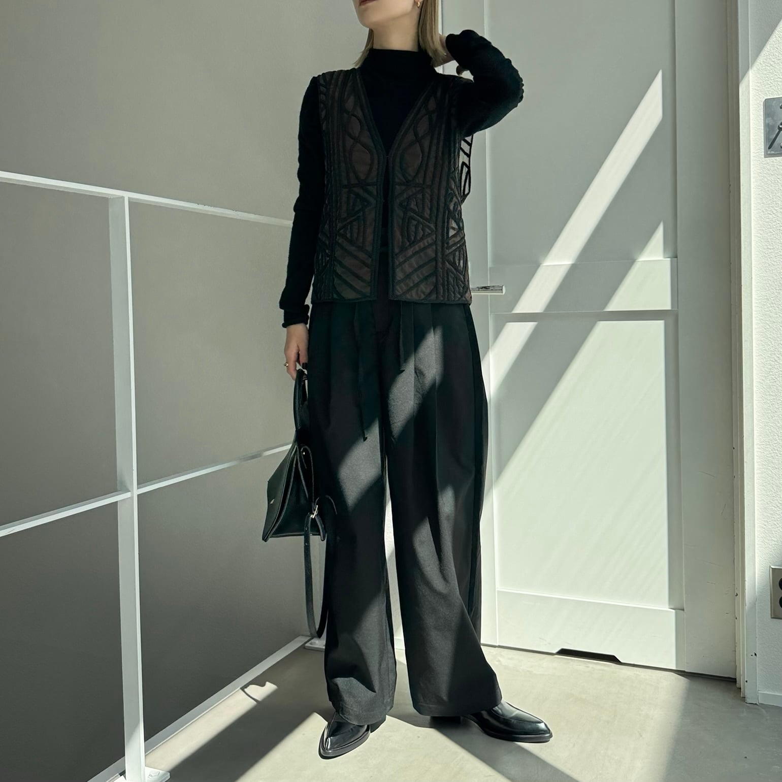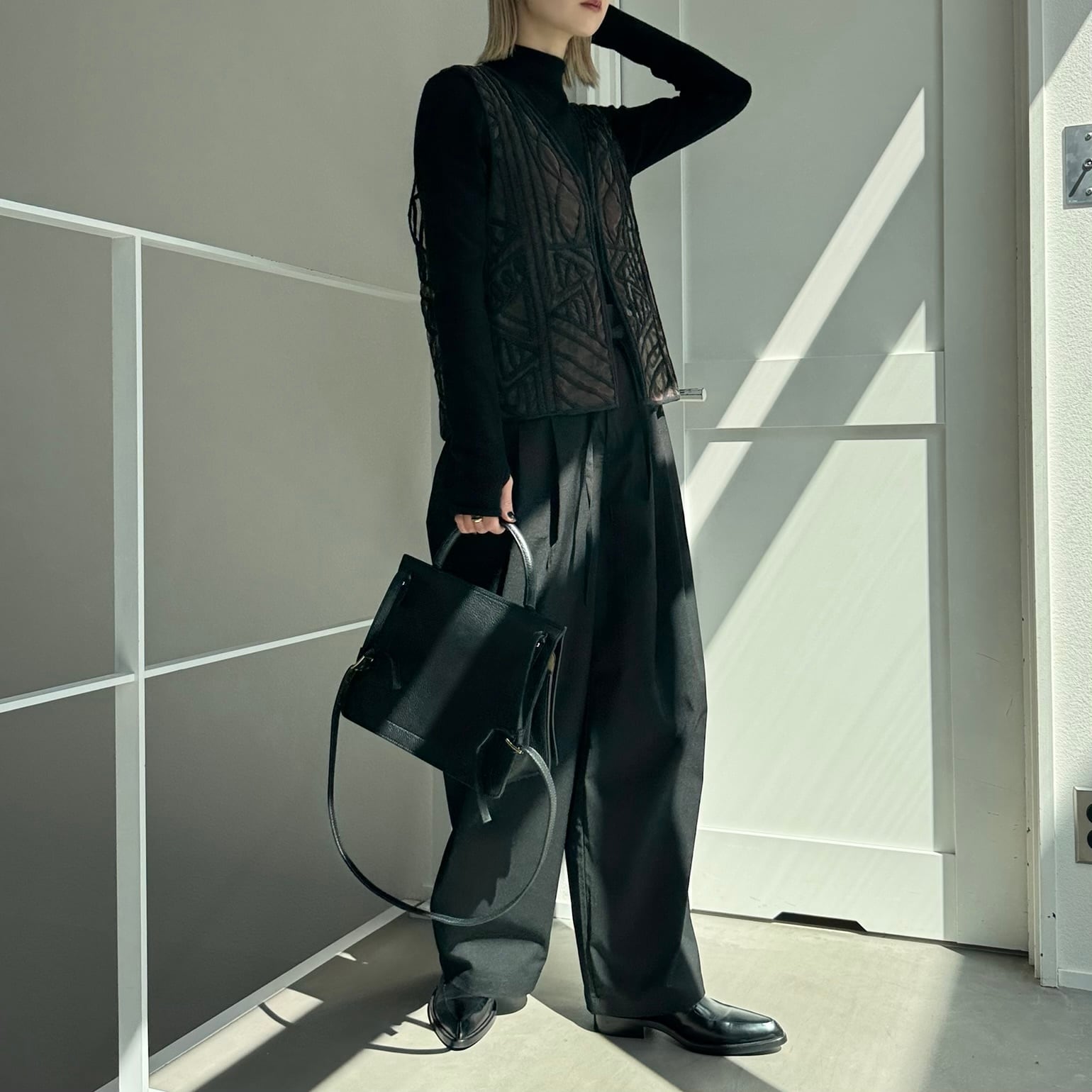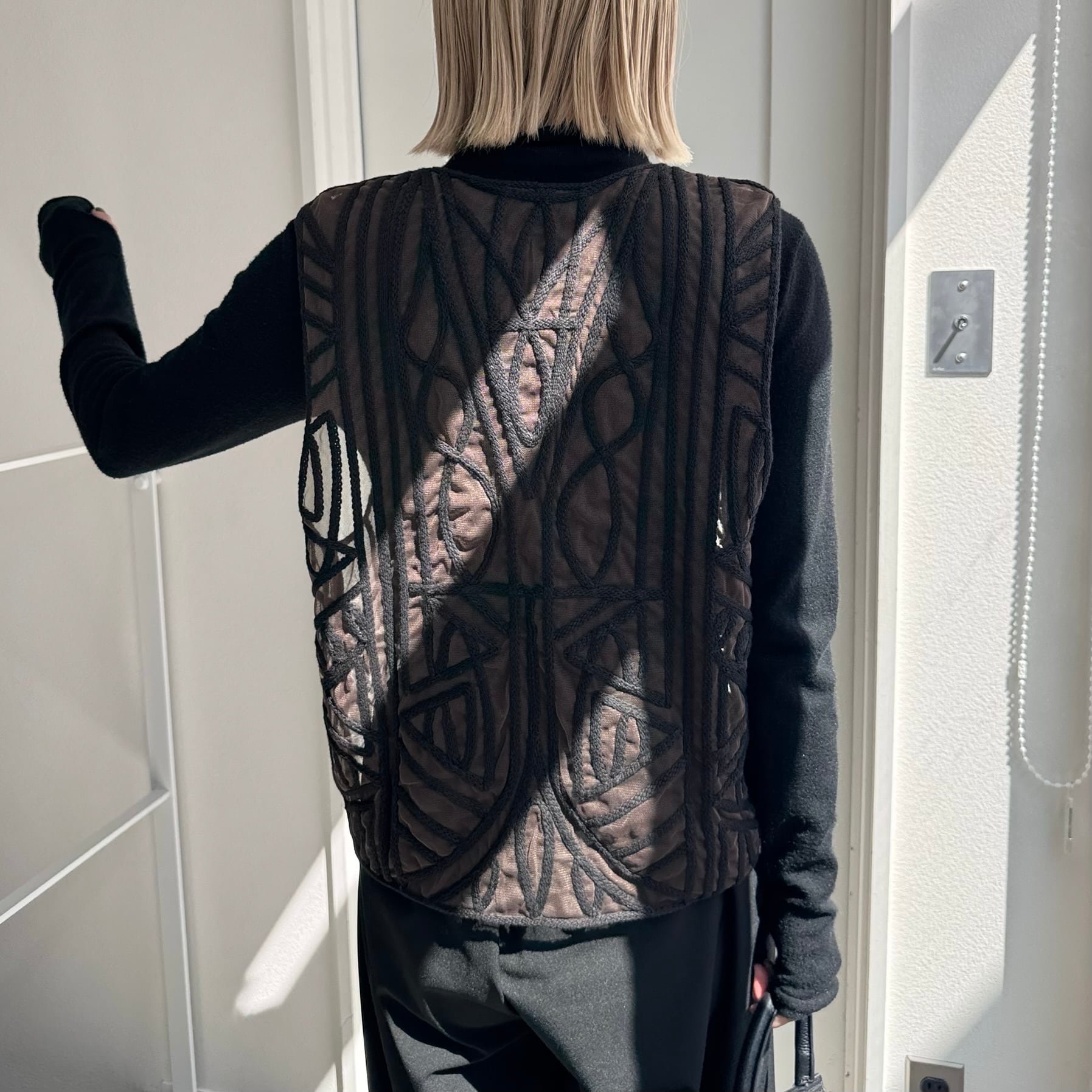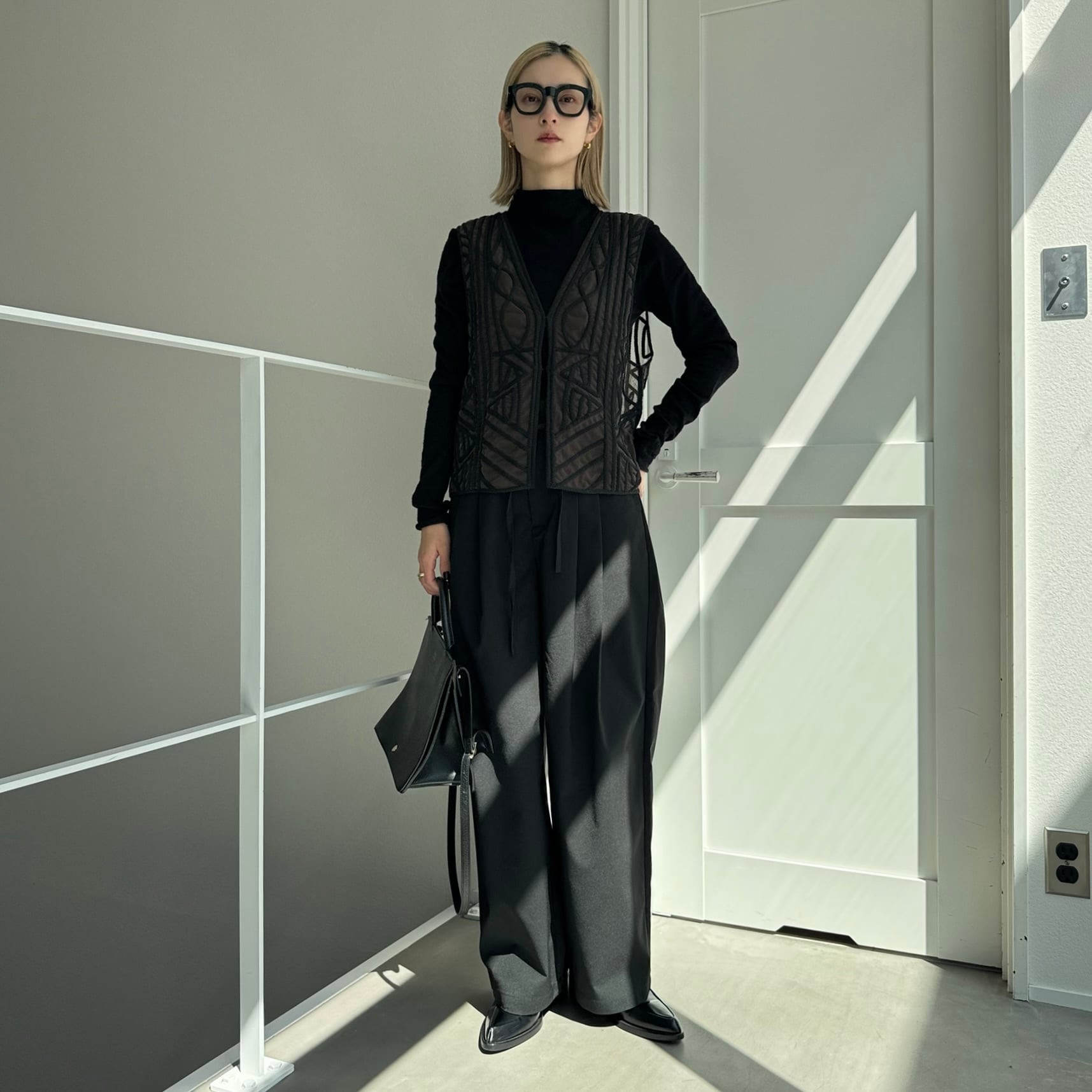 幾何学がモチーフのシアーベスト。エレガントさと個性的なデザインでシンプルなコーディネートのアクセントに◎軽やかで程よい抜け感のあるシアー素材に細やかなロープ刺繍が施されており、カジュアルからドレッシーまで幅広いスタイリングをお楽しみいただけます。