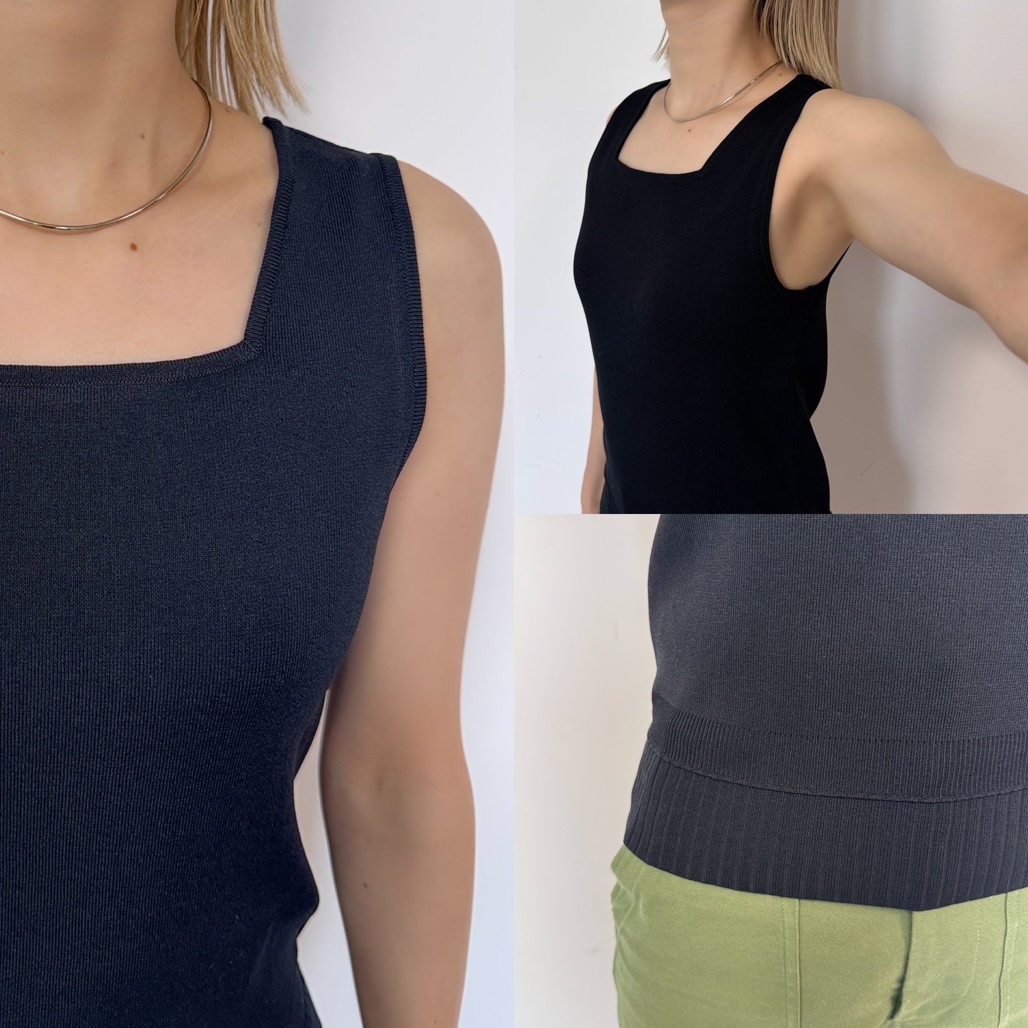 目がつまったハイゲージニットで、伸縮性もよく程よいフィット感◎毛玉のできにくい糸を使用しているためお手入れもしやすいアイテム。薄手なのでボトムINもしやすく裾を出して着てもこなれた雰囲気に。スクエアとUネックデザインは前後2wayで着用いただけます。