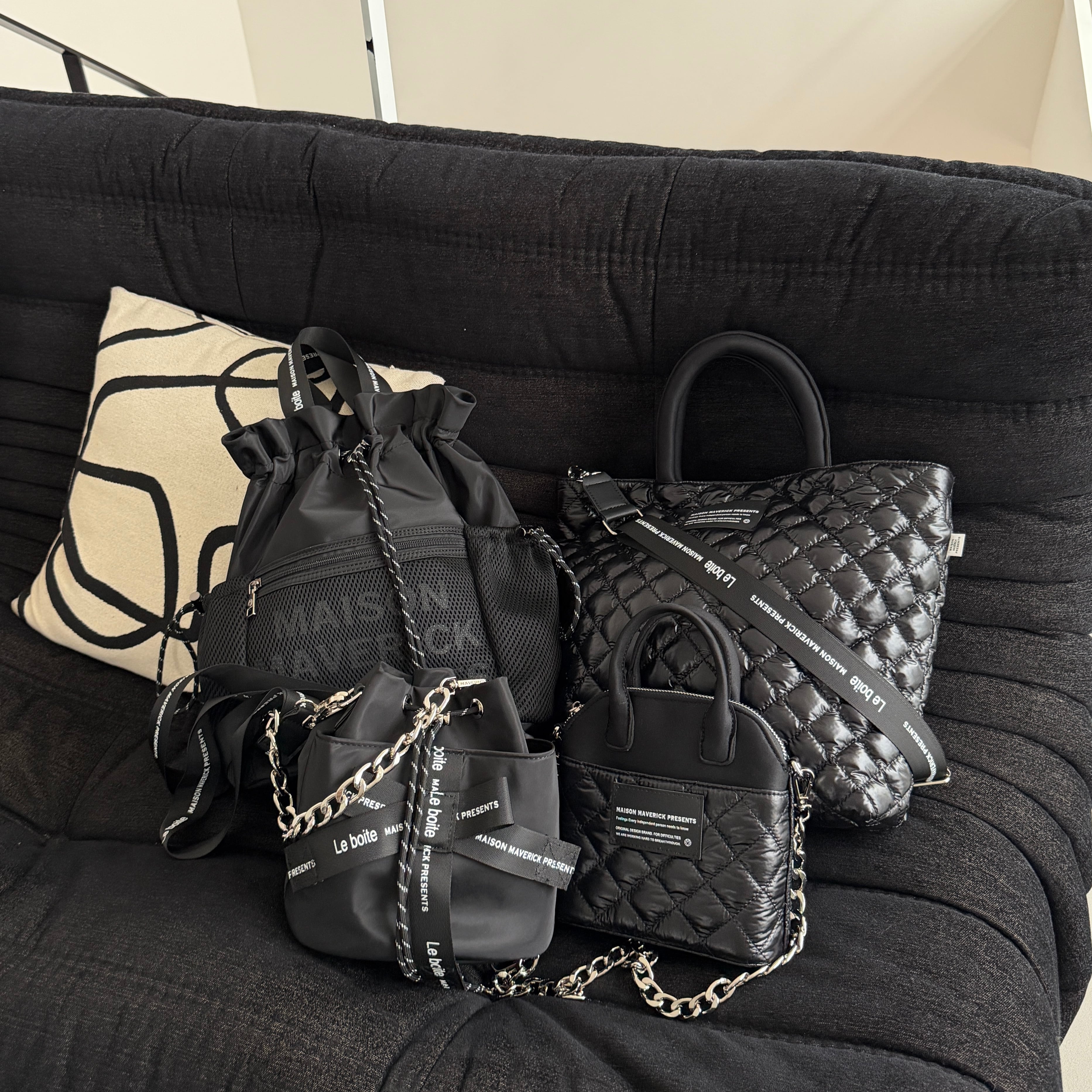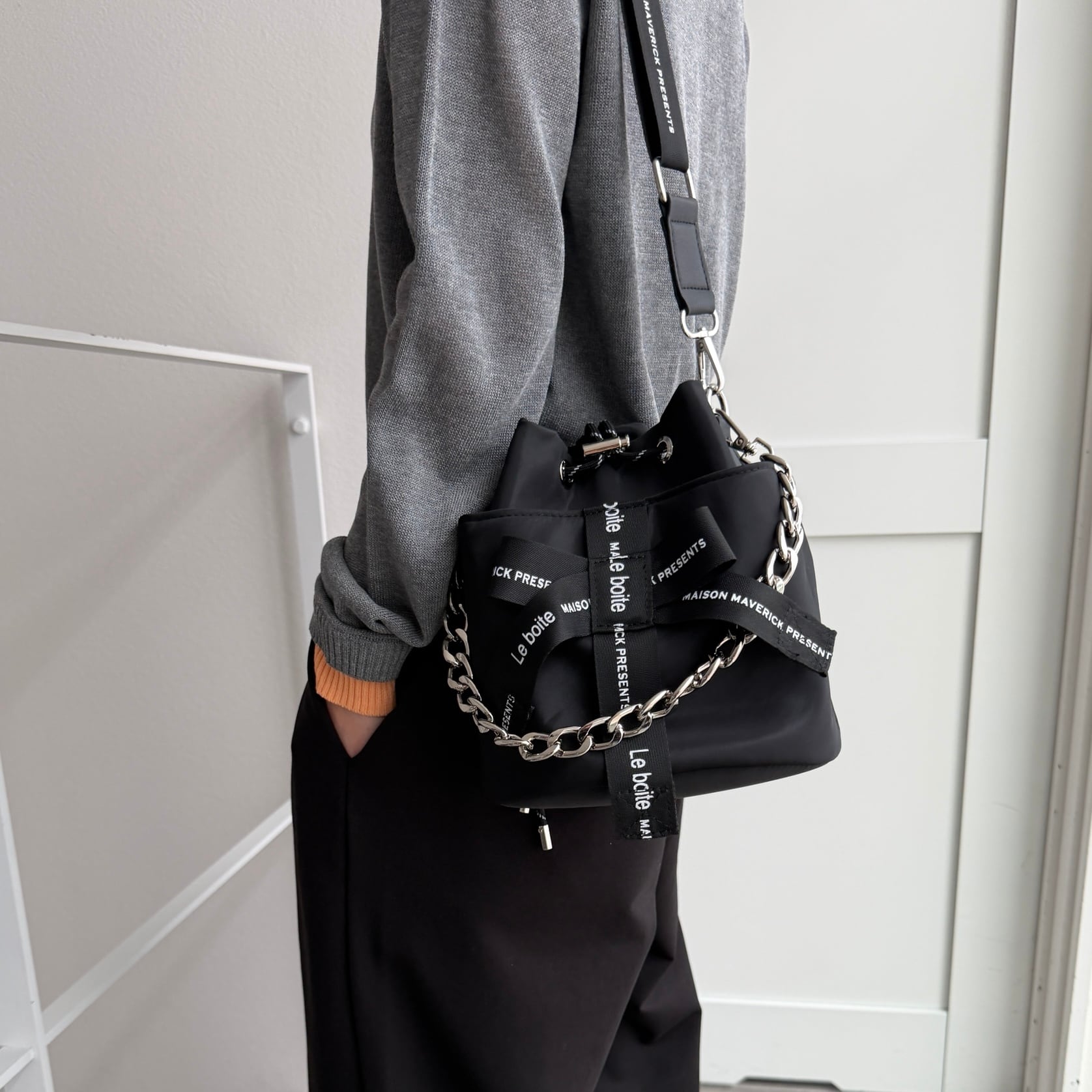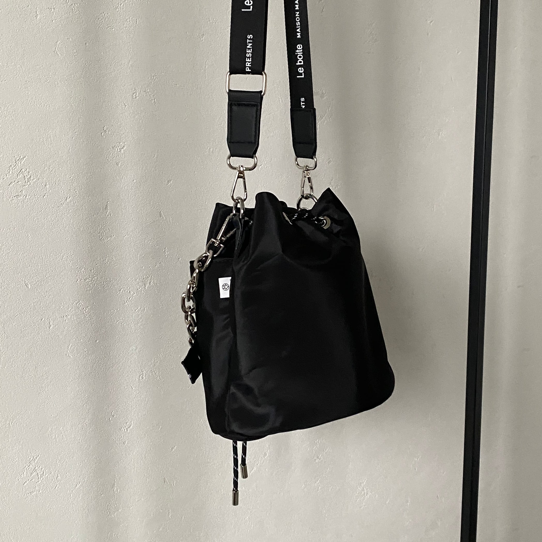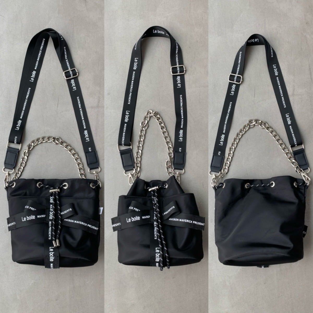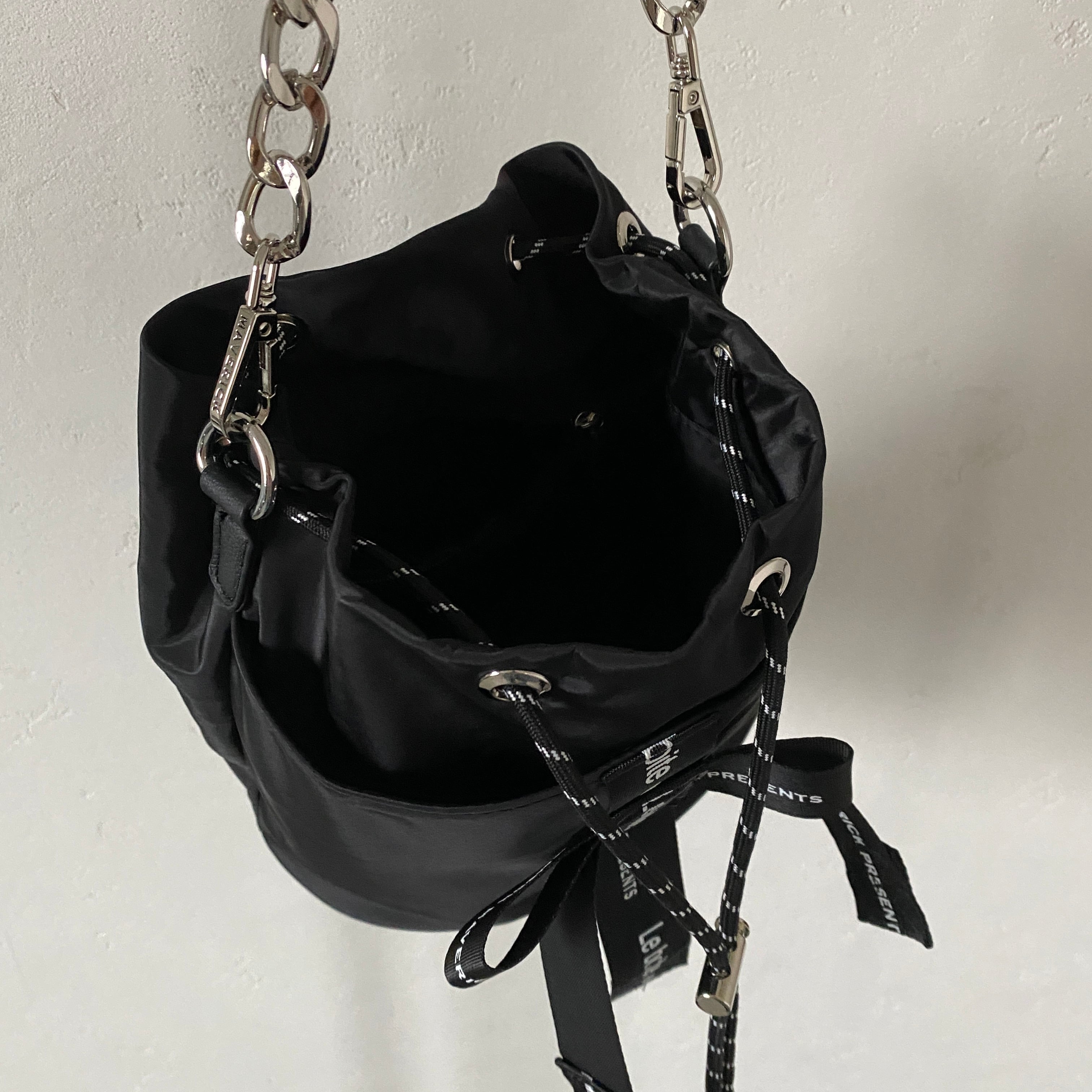 ナイロン素材のポシェットで大きめのロゴリボンに目を惹くデザインミニバッグ。ドローコードを引っ張るだけで簡単に出し入れでき開口部も広く大容量◎チェーンも肩紐も取り外し可能の為、その日のコーディネートに合わせてお楽しみいただけます。