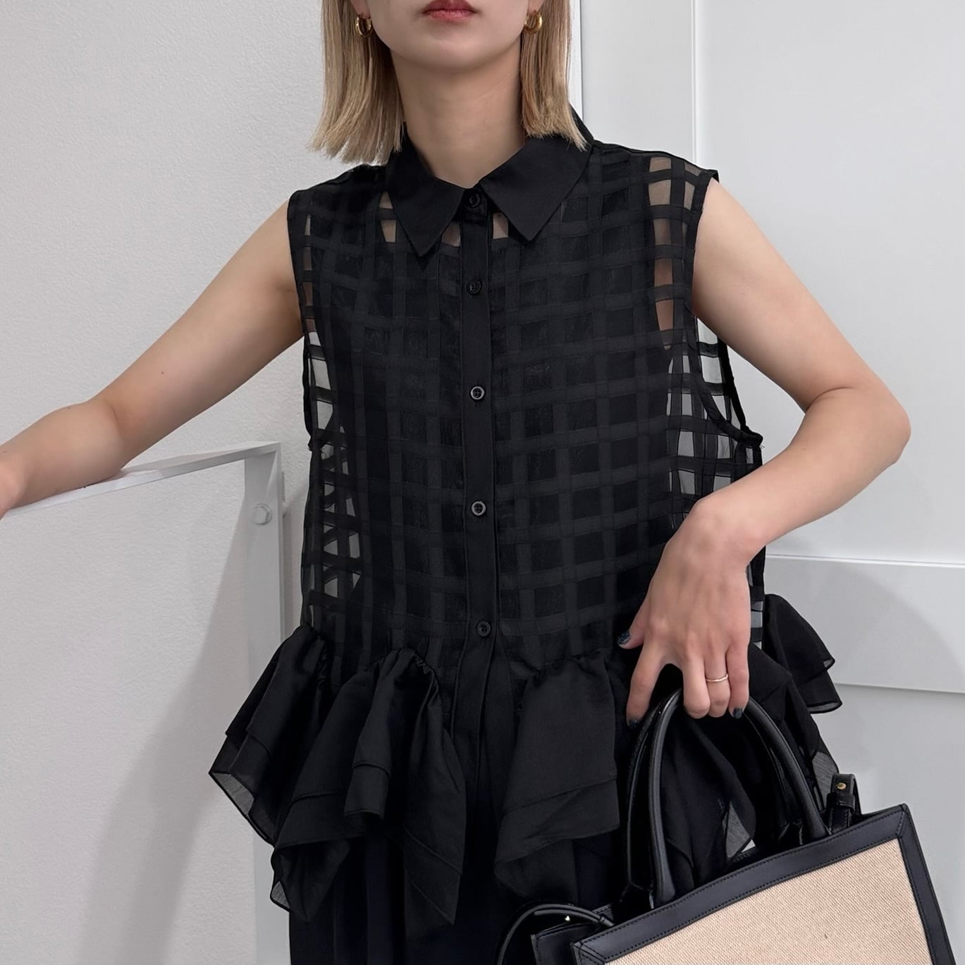 ノースリーブシアーチェックフリルBL/ブラック
