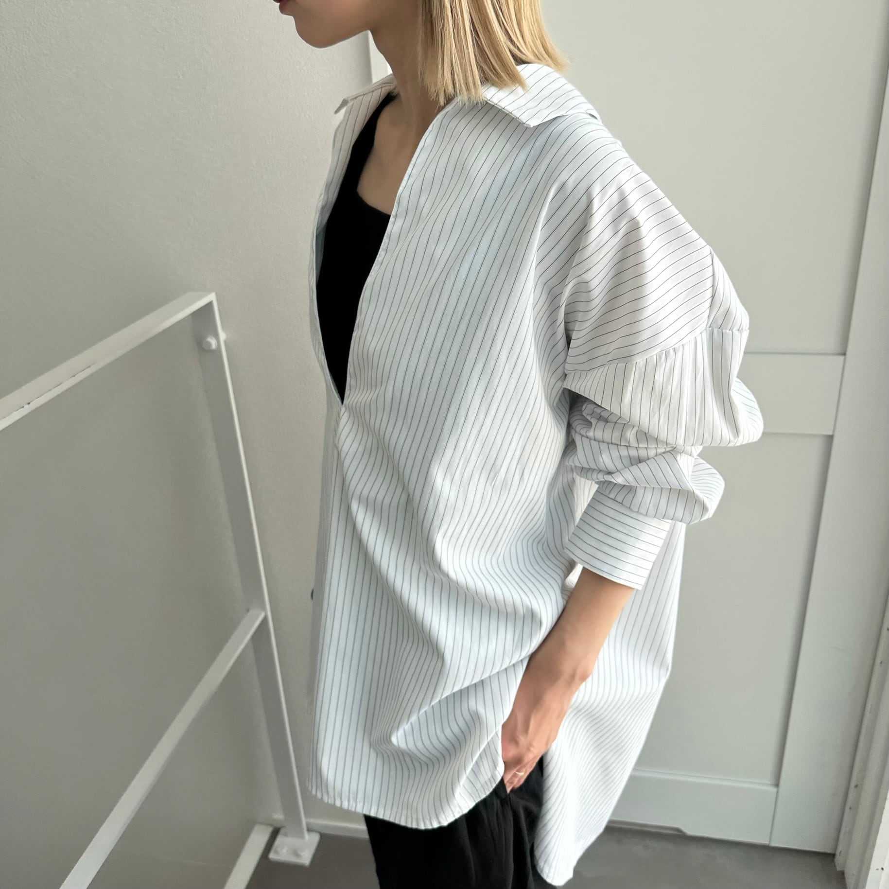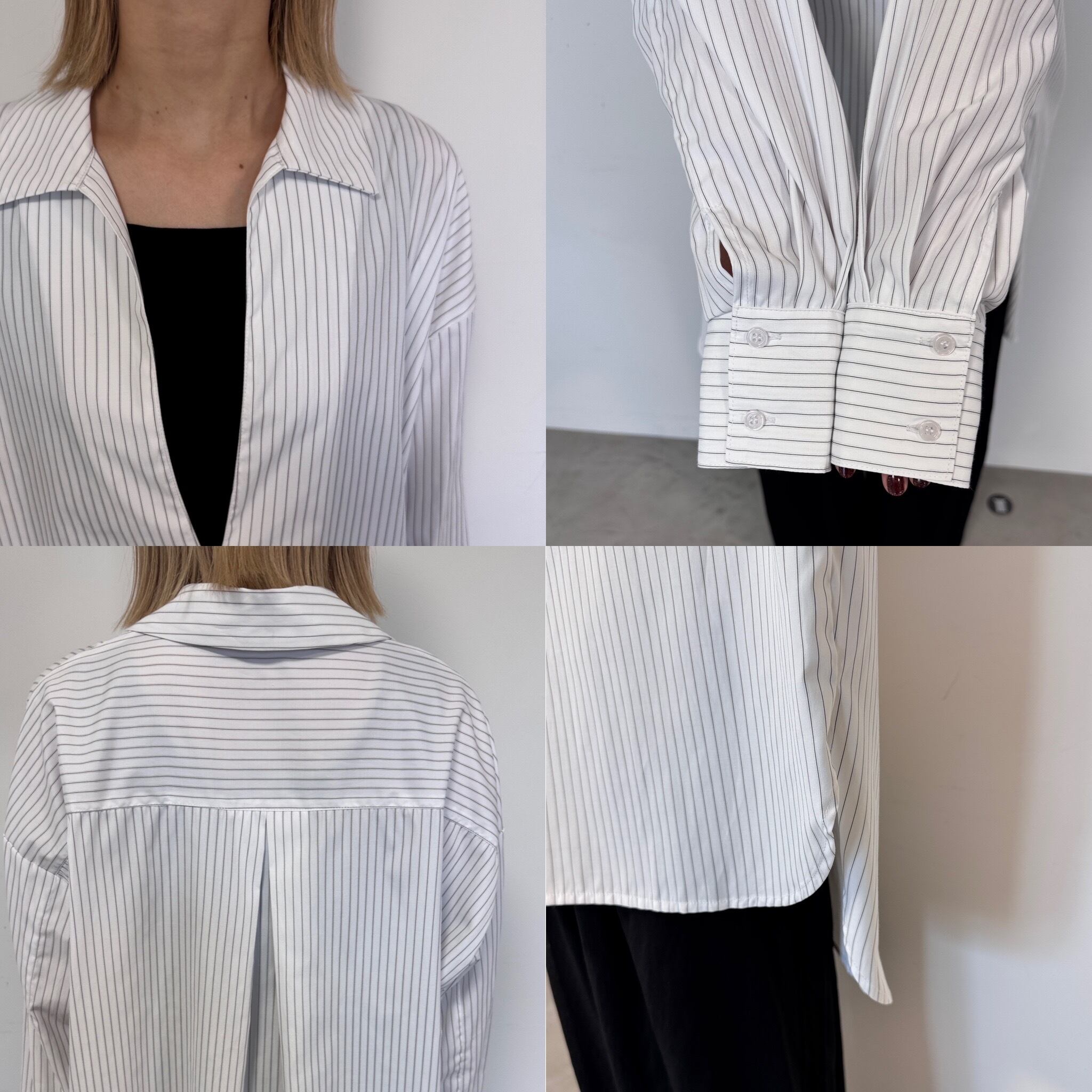 ゆったりとしたオーバーシルエットのストライプブラウス。コットン混なので程よいハリと落ち感もあり、キレイめにもカジュアルにも着用いただけます。またキーネックに衿が付く事で、抜けた雰囲気の中にもきちんとしたスタイリングに◎後ろの着丈が長めのデザインで気になる腰回りもカバーしてくれます。