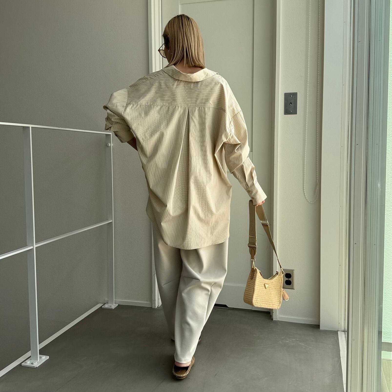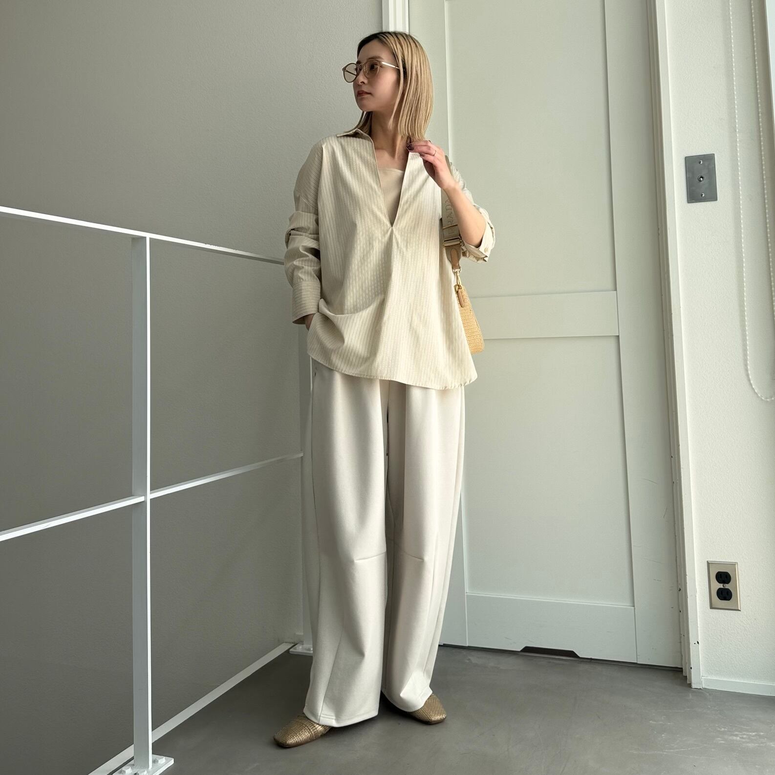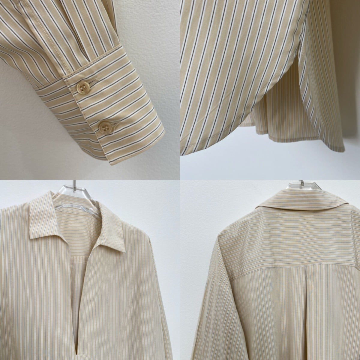 ゆったりとしたオーバーシルエットのストライプブラウス。コットン混なので程よいハリと落ち感もあり、キレイめにもカジュアルにも着用いただけます。またキーネックに衿が付く事で、抜けた雰囲気の中にもきちんとしたスタイリングに◎後ろの着丈が長めのデザインで気になる腰回りもカバーしてくれます。