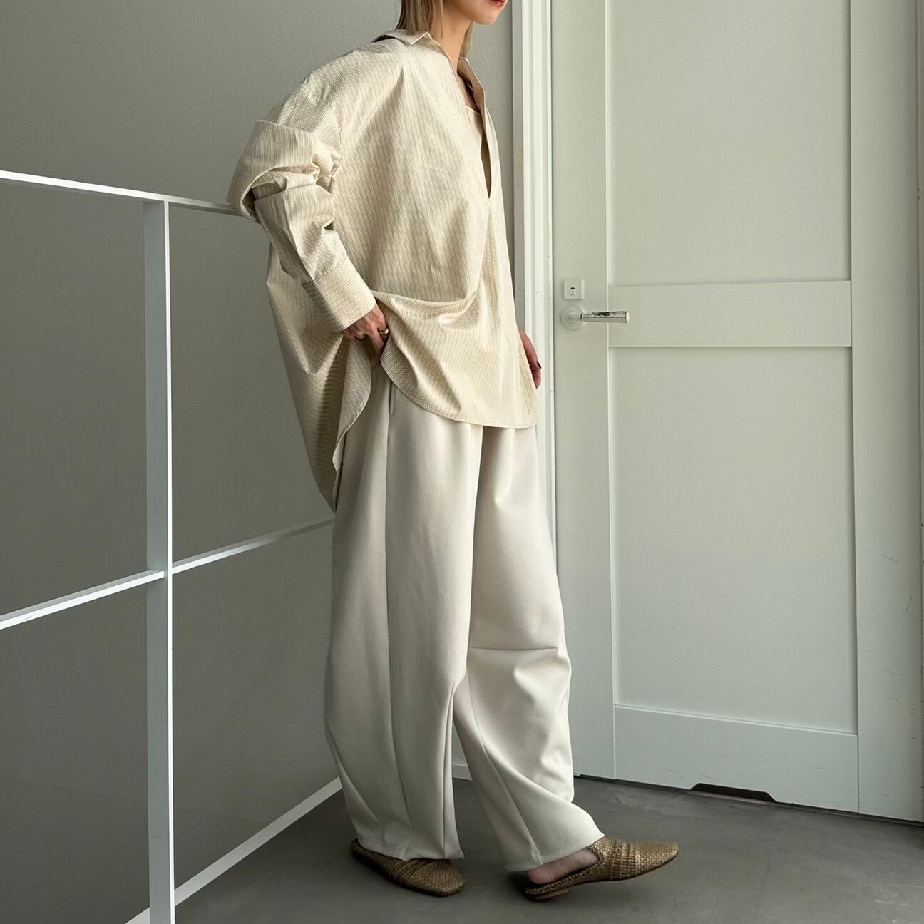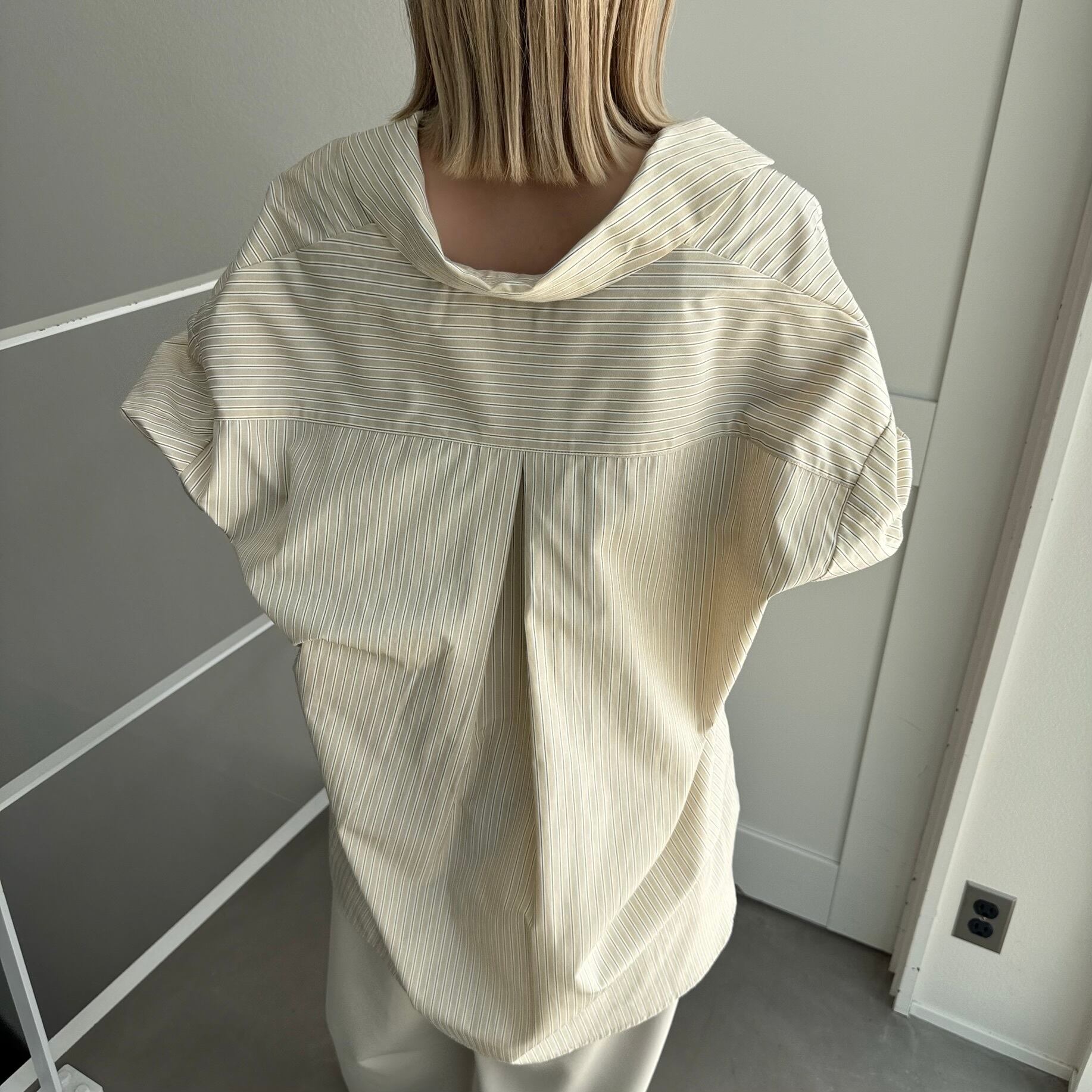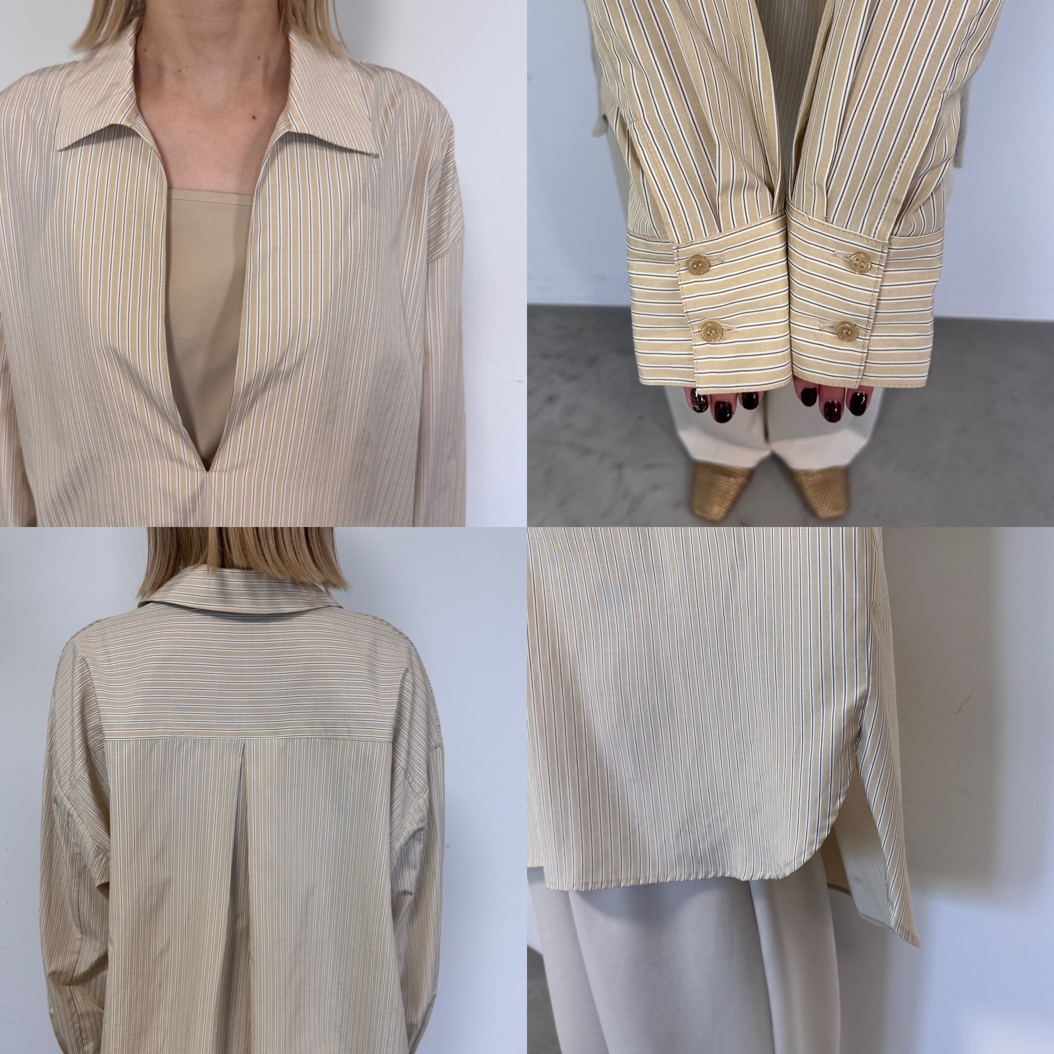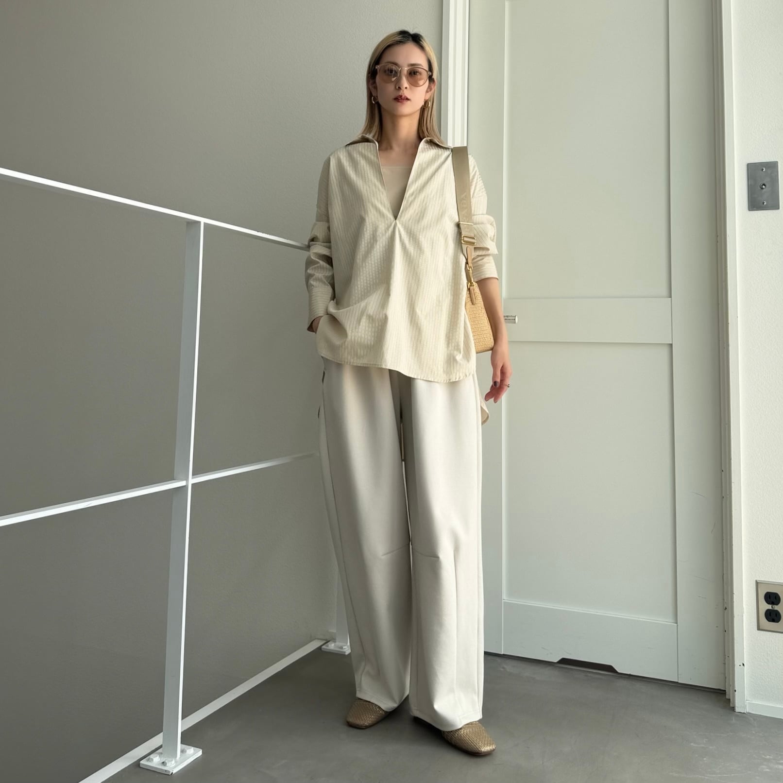 ゆったりとしたオーバーシルエットのストライプブラウス。コットン混なので程よいハリと落ち感もあり、キレイめにもカジュアルにも着用いただけます。またキーネックに衿が付く事で、抜けた雰囲気の中にもきちんとしたスタイリングに◎後ろの着丈が長めのデザインで気になる腰回りもカバーしてくれます。