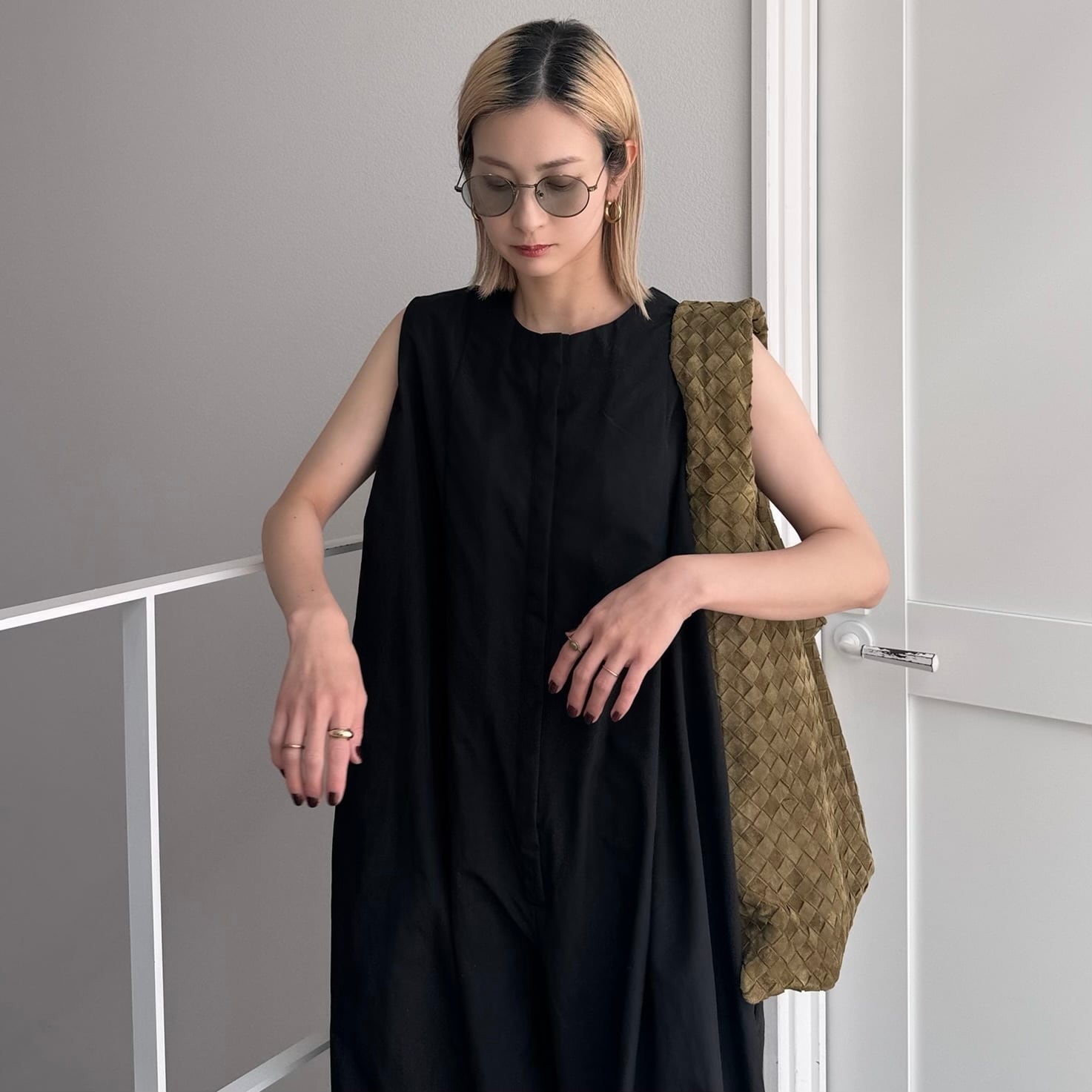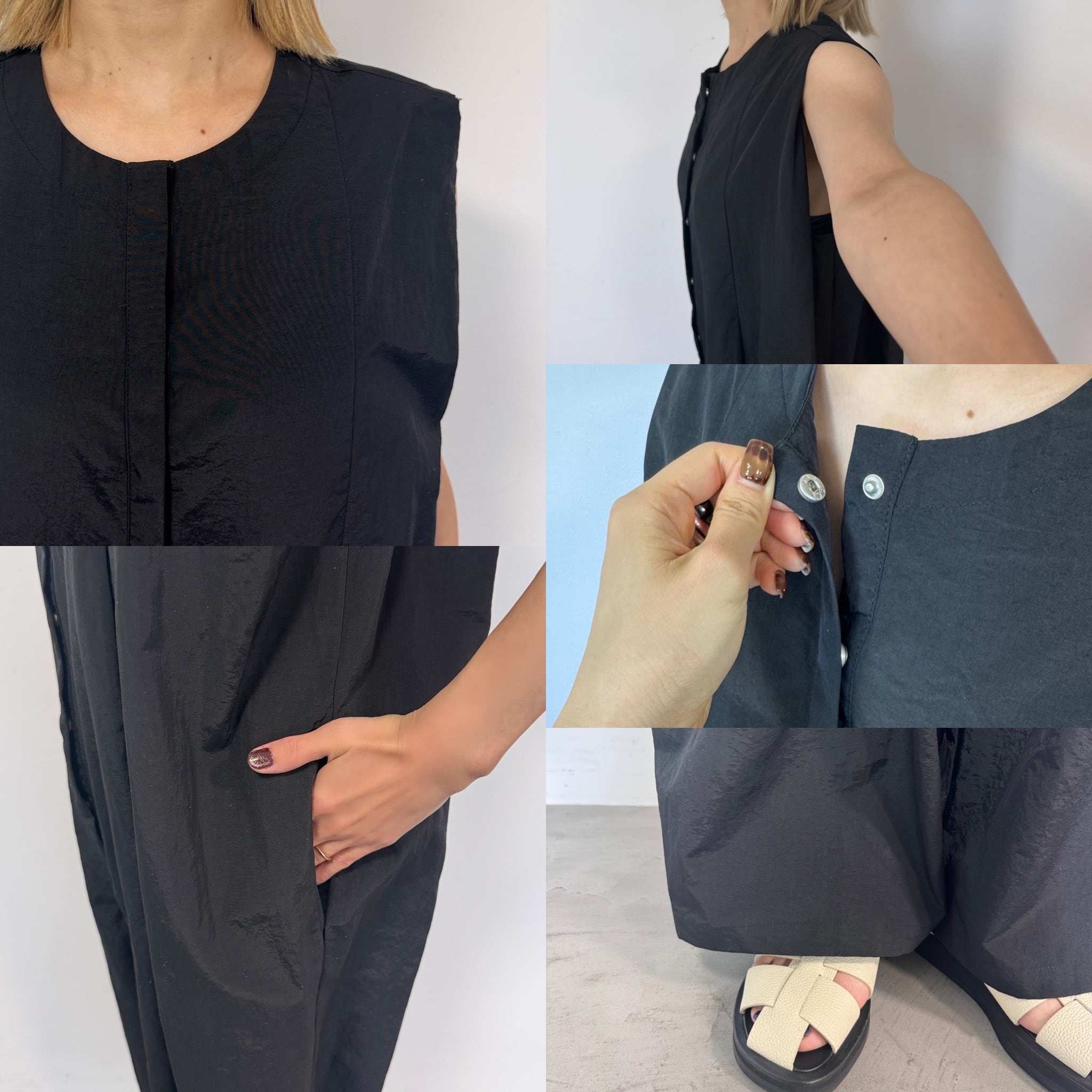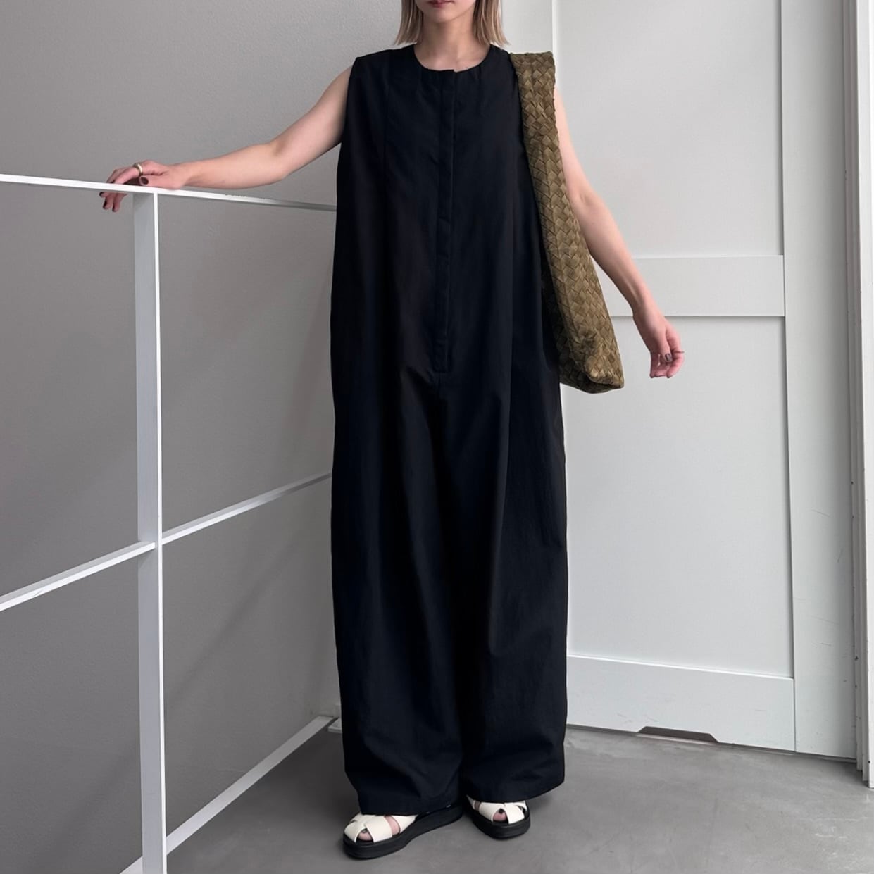 1枚でスタイリングが決まるノースリオールインワン。タフタ素材特有のさらっとした肌触りで着心地が良く、ノーカラーでスナップボタン仕様なのでシンプルなスタイリングに◎ウエストとヒップ部分にゆとりがあり、体のラインも拾わずすっきり着用いただけます。