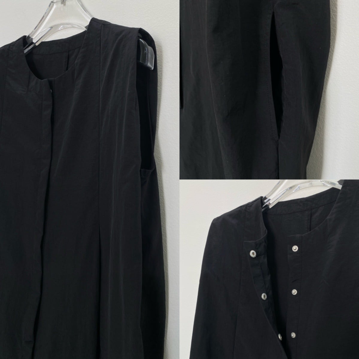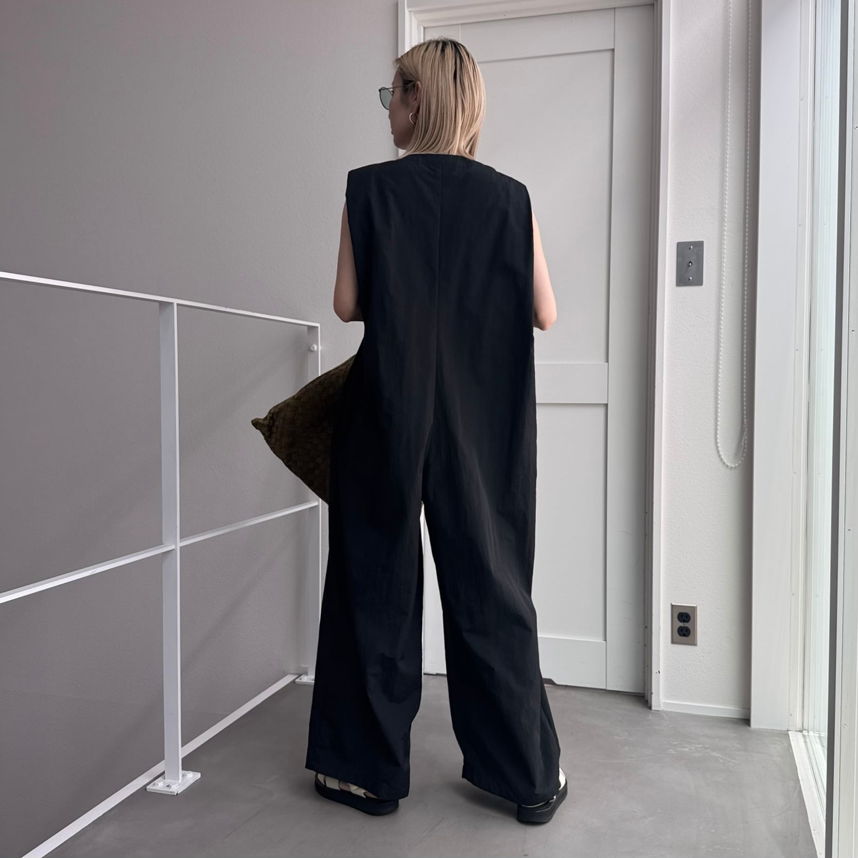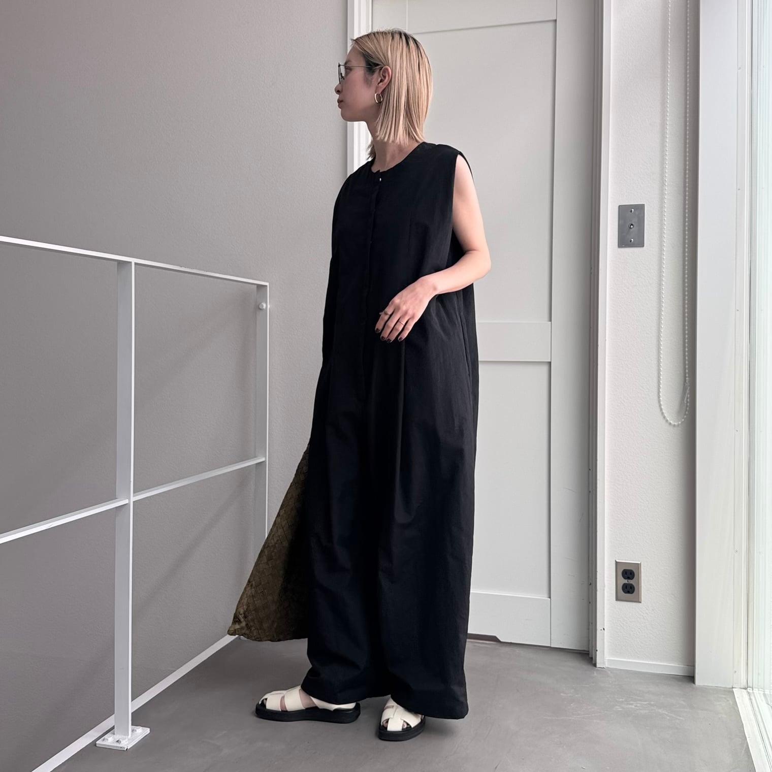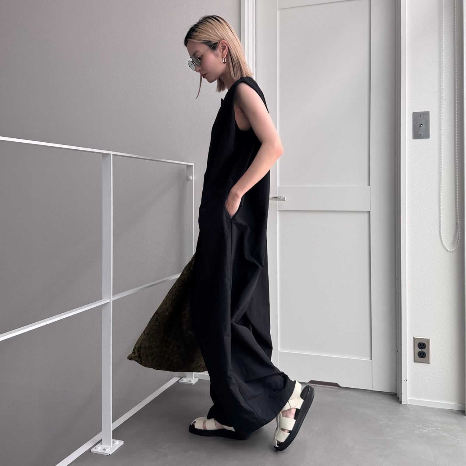 1枚でスタイリングが決まるノースリオールインワン。タフタ素材特有のさらっとした肌触りで着心地が良く、ノーカラーでスナップボタン仕様なのでシンプルなスタイリングに◎ウエストとヒップ部分にゆとりがあり、体のラインも拾わずすっきり着用いただけます。