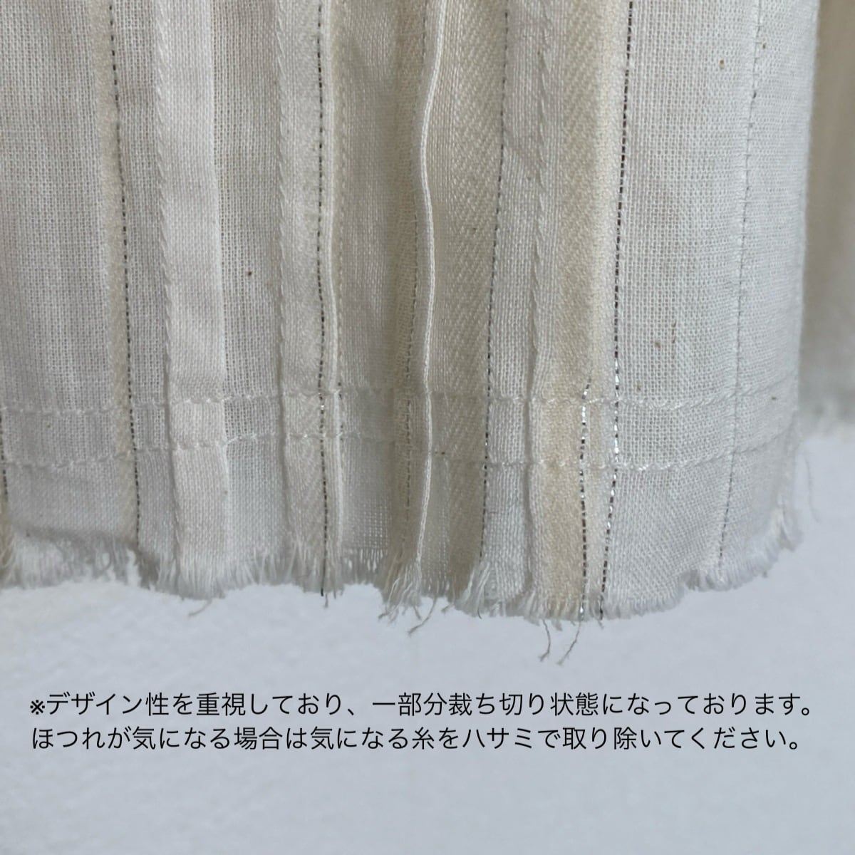 ※ファッション性を重視した製品の為、一部の縫い代を断ち切りにしていますがデザイン上の特質です。ほつれが気になる場合は無理に引っ張らず、気になる糸をハサミで取り除いてください。