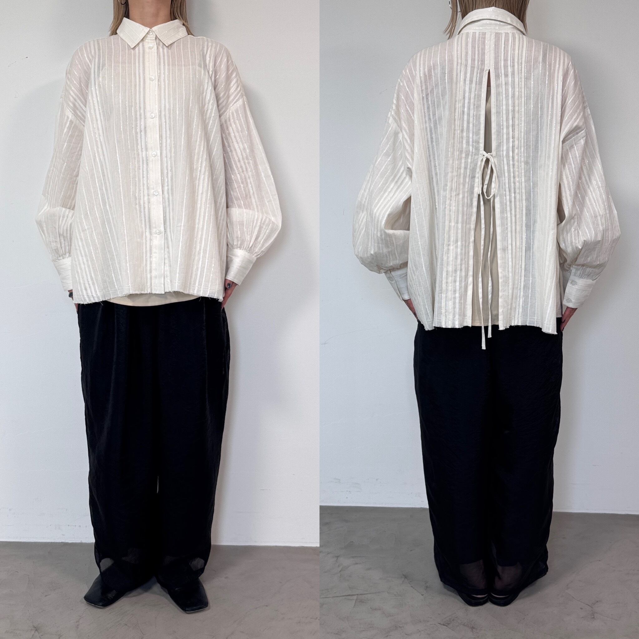 繊細なラメが施されたバックデザインが特徴のストライプシャツ。インド製の生地を使用しているので味のある風合いです。裾部分は切りっぱなしのデザインとなっており、きちんと感もありつつラフな印象も◎涼しく通気性の良い素材なので夏の日よけにもピッタリです。きちんと感と抜け感を両立したデザインで様々なコーディネートにおすすめの1枚です。