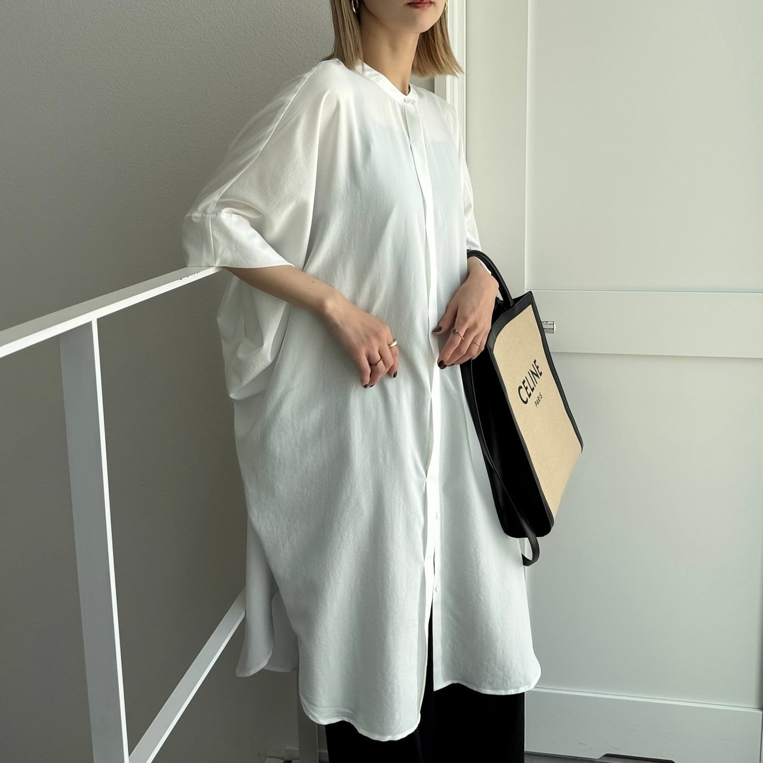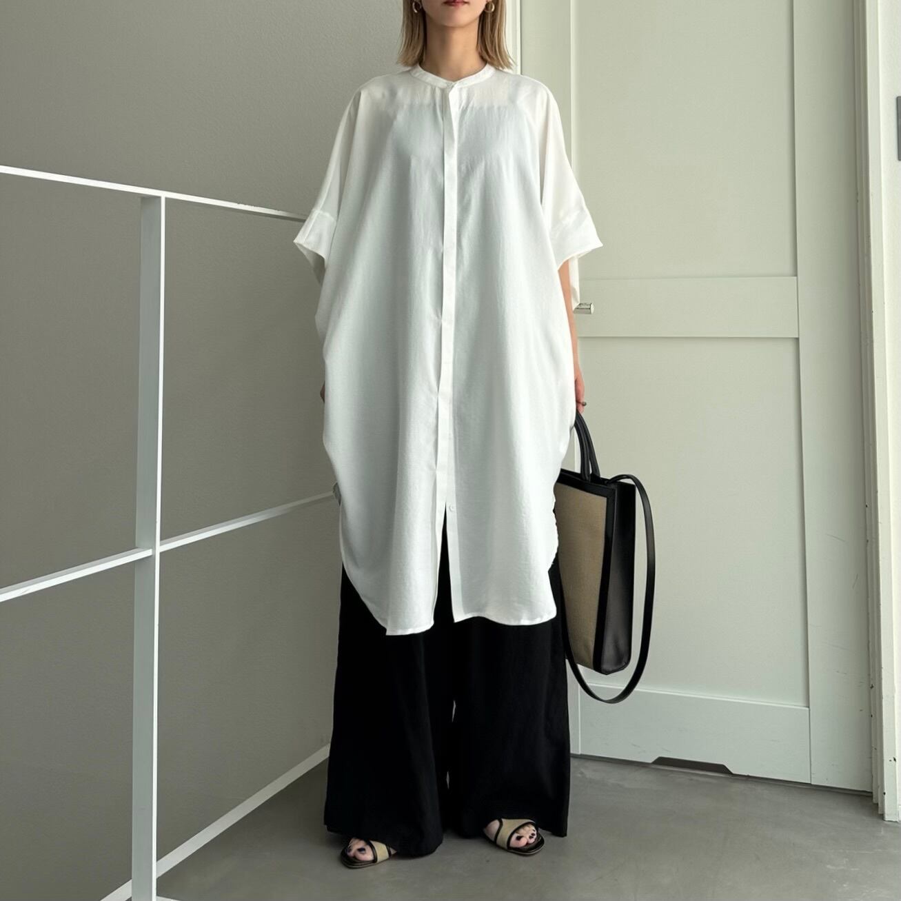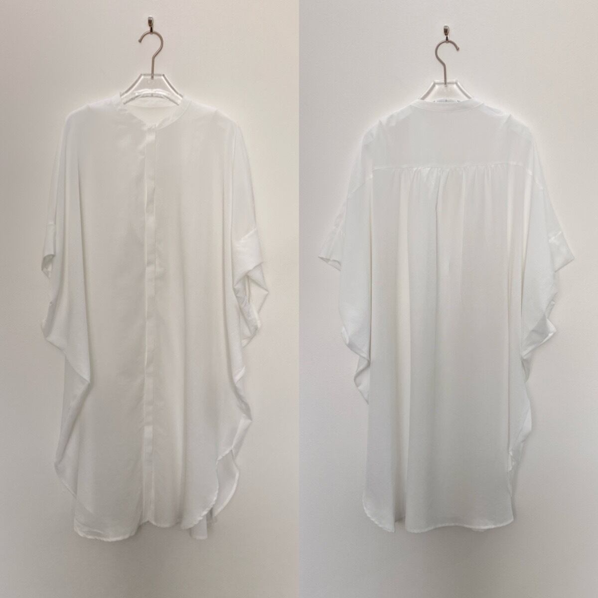 ワイドなハーフスリーブのロングシャツ。とろみのある生地で身幅たっぷりでも細見え効果◎ロング丈なので、ボトムで雰囲気が変わるので幅広いスタイリングをお楽しみいただけます。ノーカラーで首元すっきりで羽織としても大活躍間違いなしの1枚です。