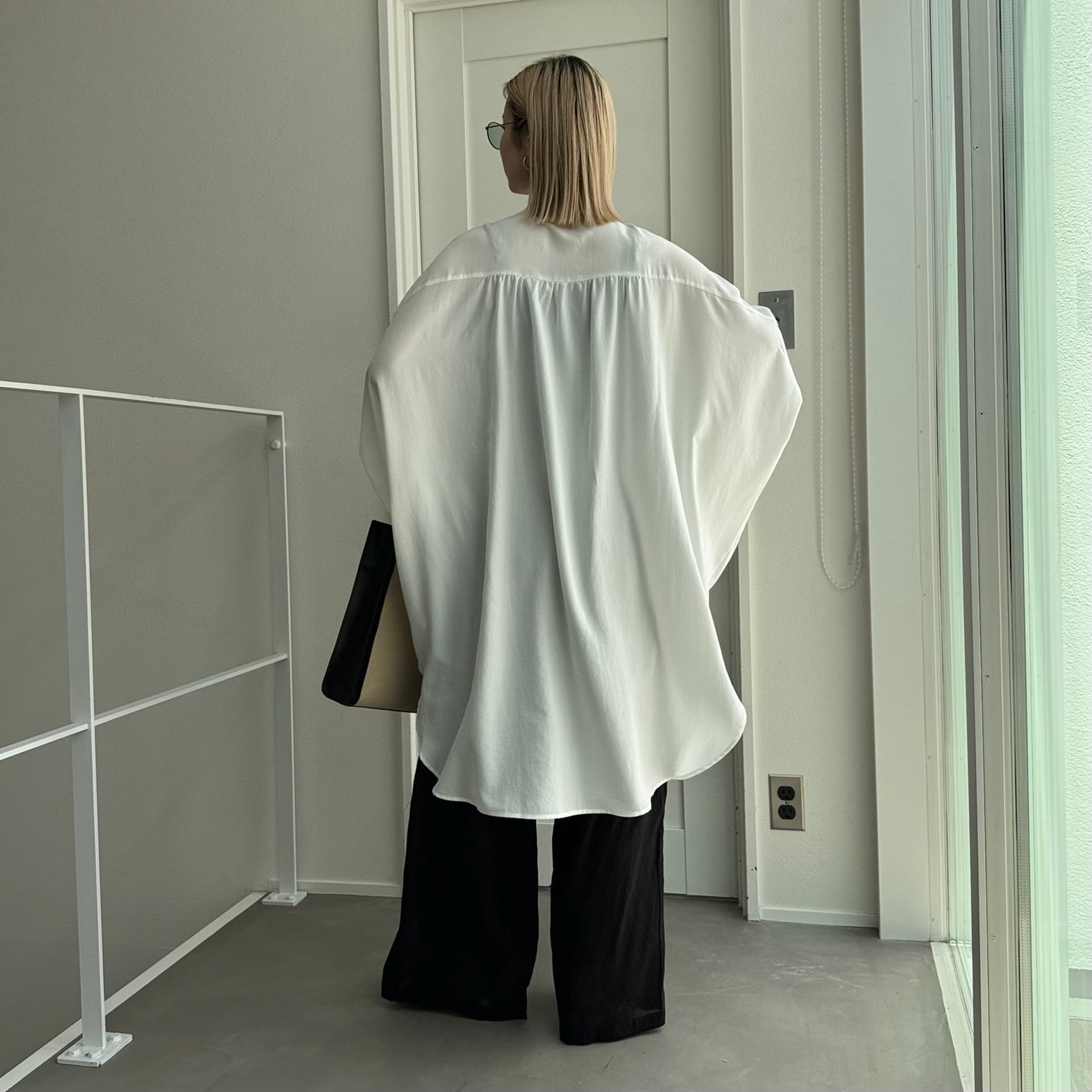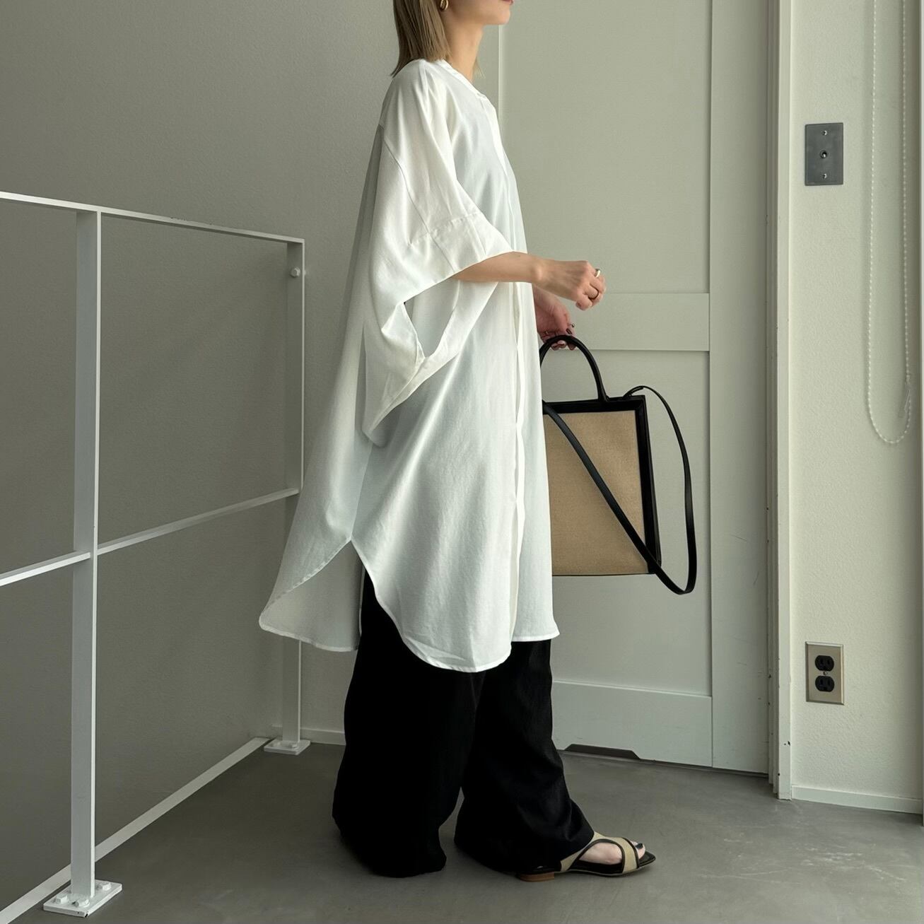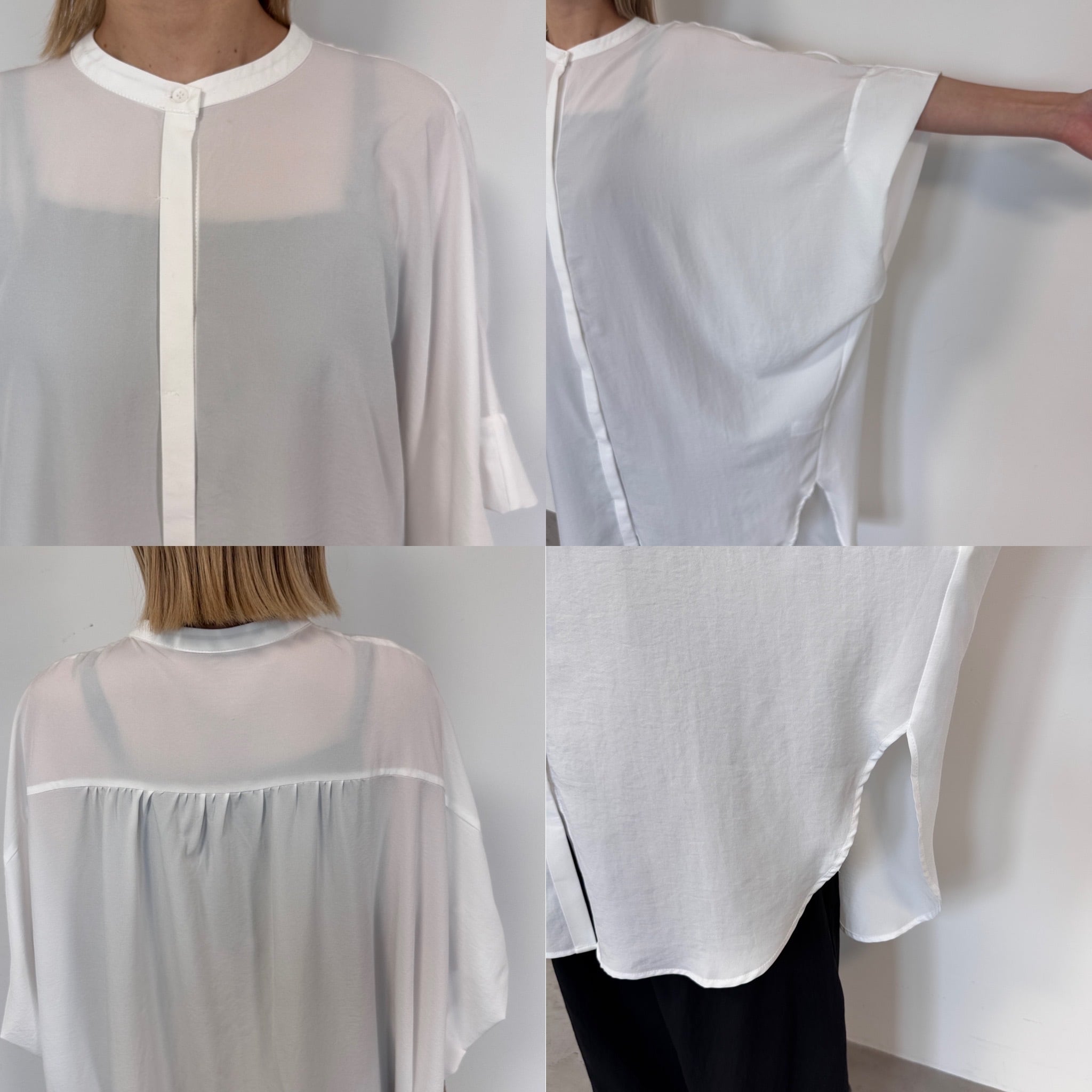 ワイドなハーフスリーブのロングシャツ。とろみのある生地で身幅たっぷりでも細見え効果◎ロング丈なので、ボトムで雰囲気が変わるので幅広いスタイリングをお楽しみいただけます。ノーカラーで首元すっきりで羽織としても大活躍間違いなしの1枚です。