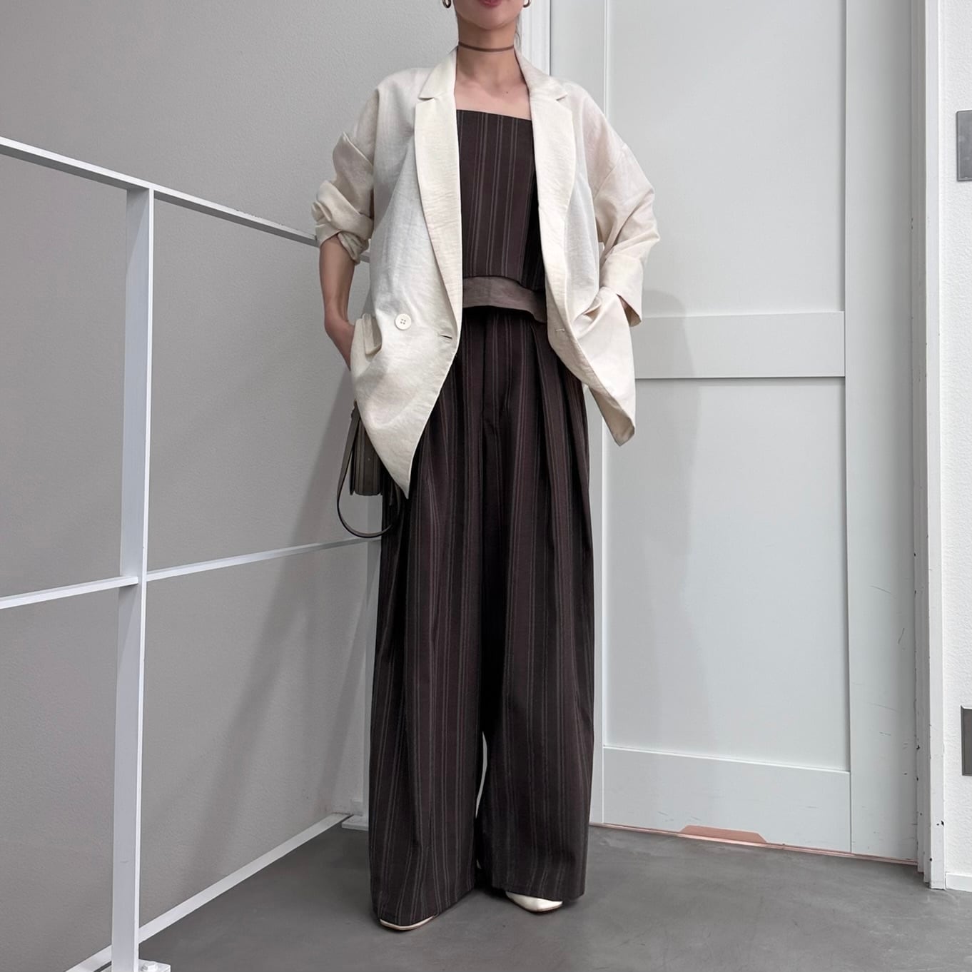 コーデのポイントになるキャミビスチェ。裾にはシフォン生地がドッキングされており可愛さもプラス。シンプルなアイテムに合わせるだけで一気におしゃれ度がアップします。身幅もたっぷりなので着脱も簡単。着用するとストンと落ち感があるのでスッキリとした印象に。きれいめからカジュアルコーデまで幅広くご使用頂けます。同生地の[ピンストライプタックストレートPT]とのSET UP風コーデもおすすめ◎