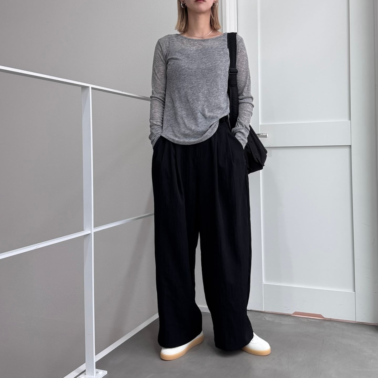オープンツイストデザインがポイントのリブシアーカットソー。前後2wayで着用出来きるのでコーデによって雰囲気も変えられます。程よいシアー感と柔らかい素材なので着心地も抜群。袖丈が長めな作りなのでたるませてこなれ感のあるスタイリングに。1枚はもちろんレイヤードのインナーにも使える万能アイテムです。