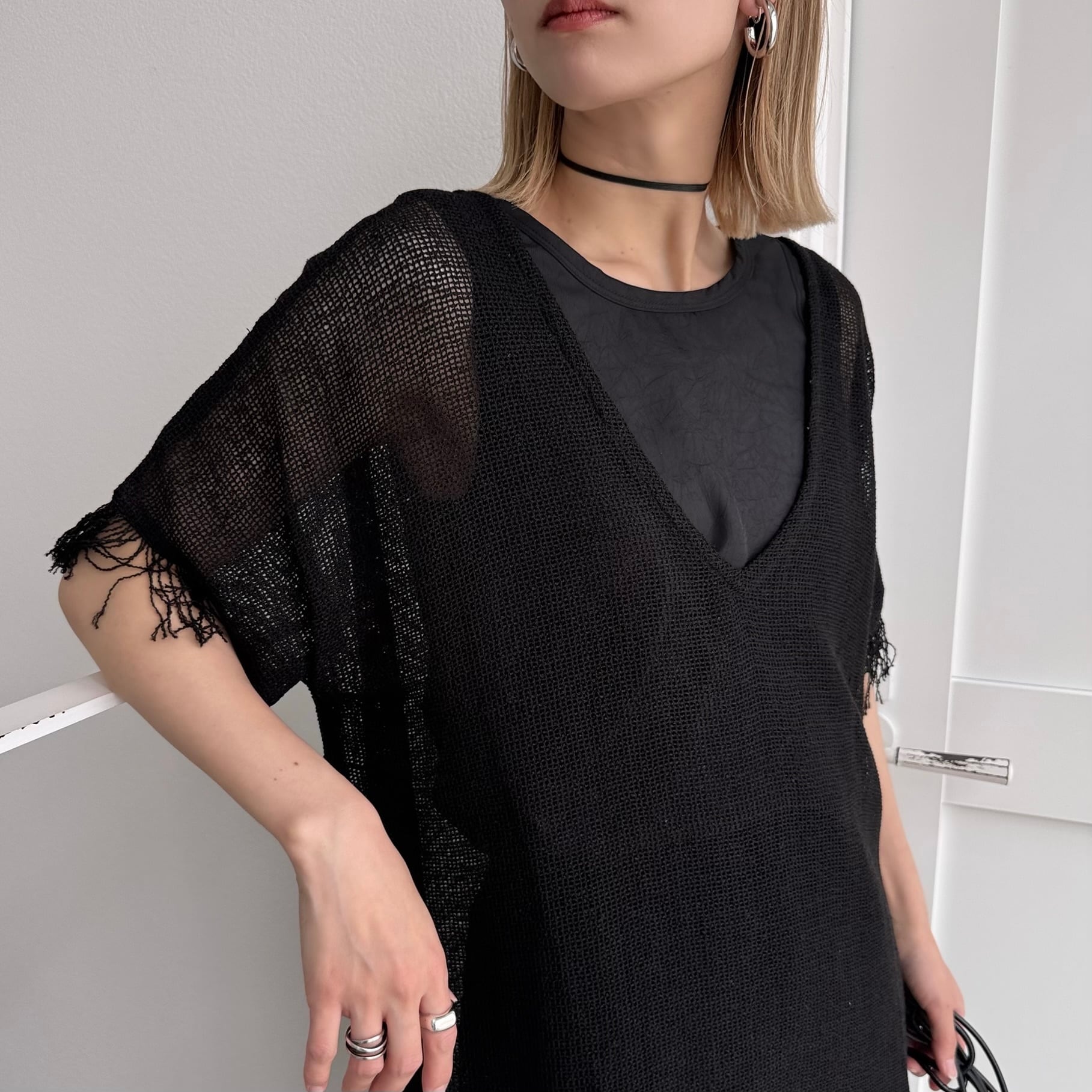 one-piece:VネックフリンジメッシュOP/ブラック