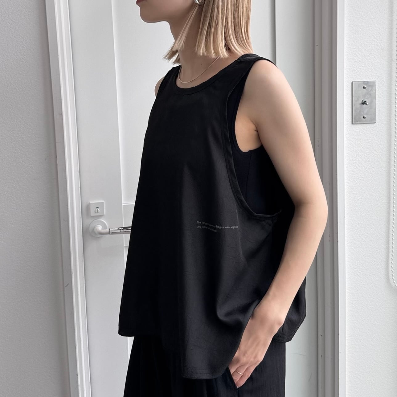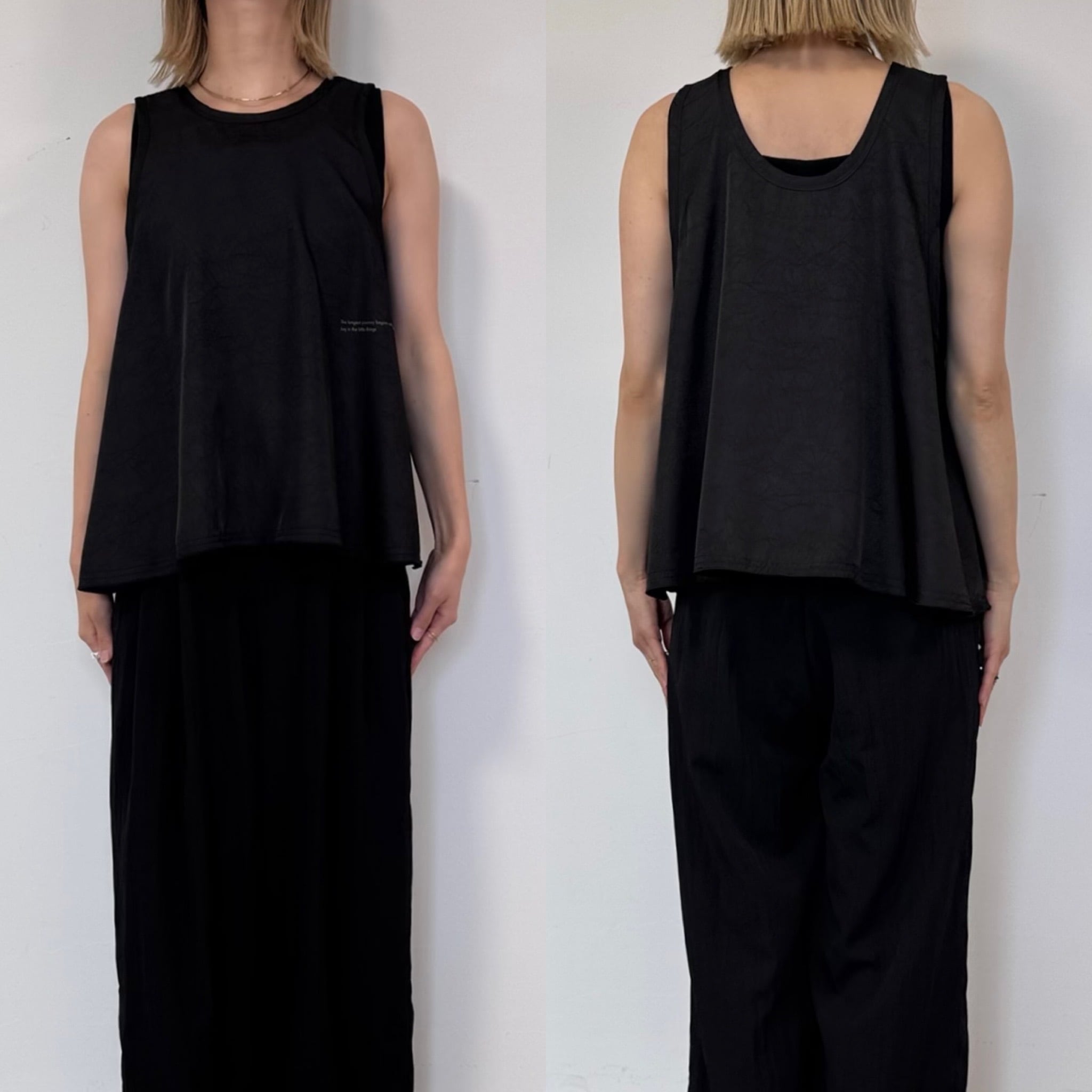前後2way仕様で着回せるサイドロゴタンクトップ。サテンのような生地感でなめらかな肌触り◎裾がフレアになっていてゆるっとしたシルエットをお楽しみいただけます。レイヤードとしても大活躍な1枚です。
