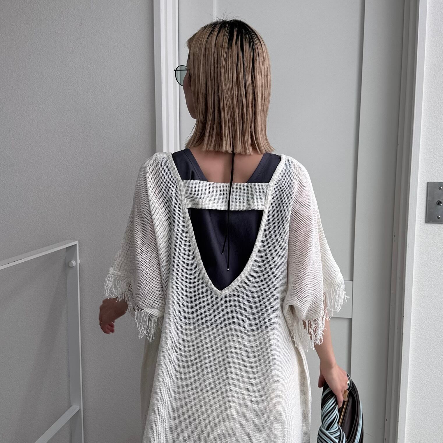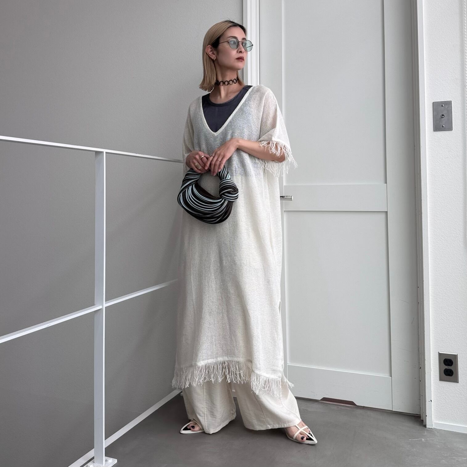 one-piece:VネックフリンジメッシュOP/ホワイト