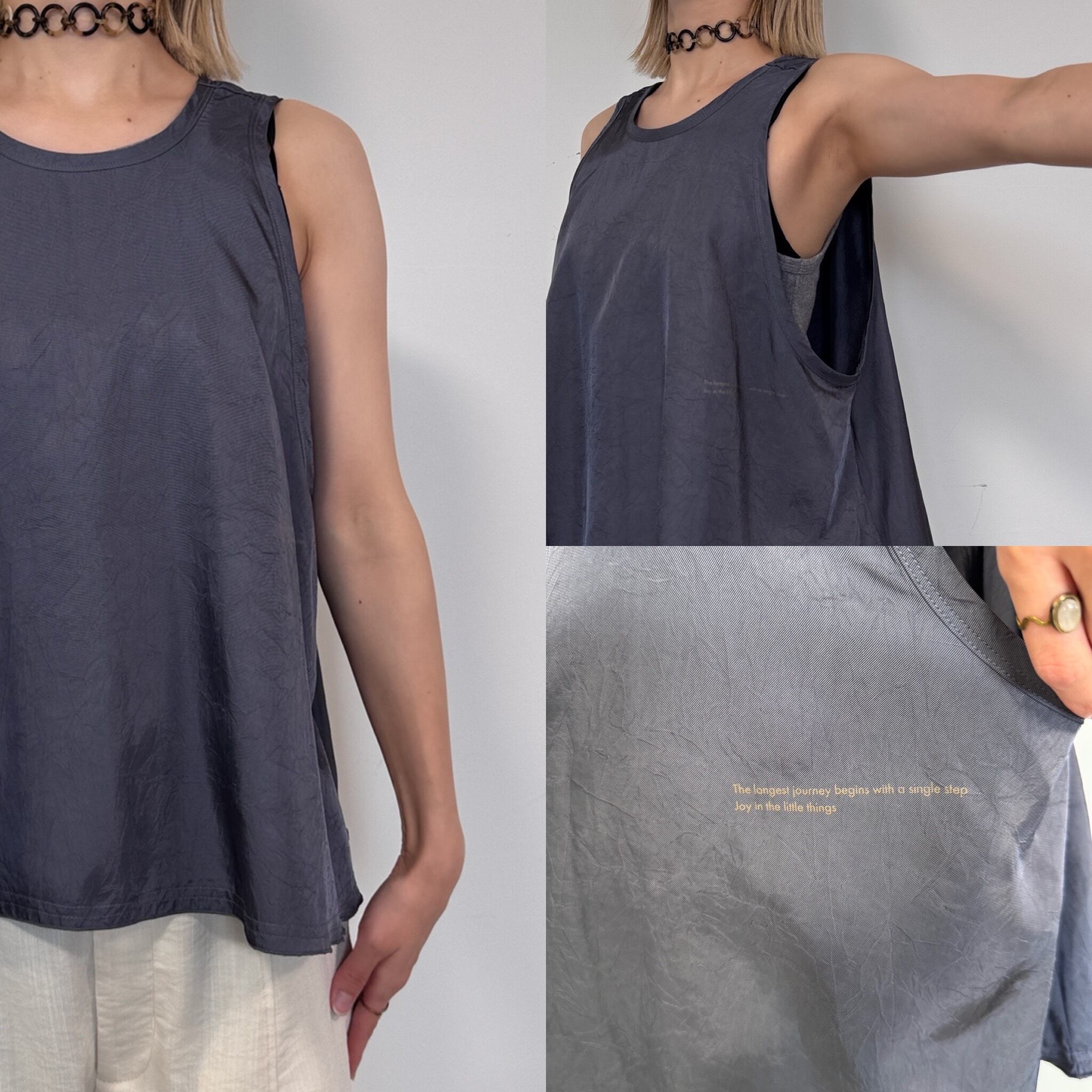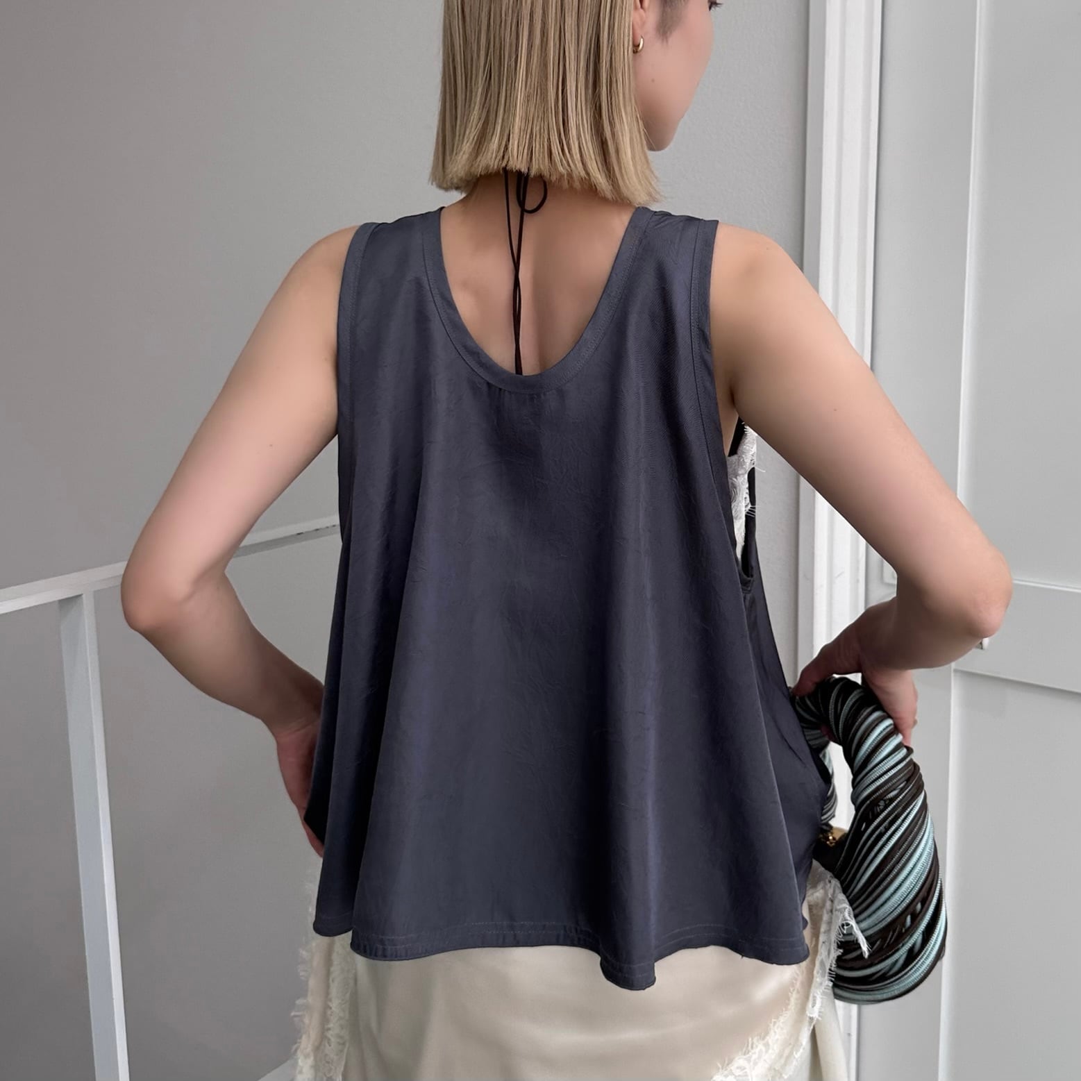 前後2way仕様で着回せるサイドロゴタンクトップ。サテンのような生地感でなめらかな肌触り◎裾がフレアになっていてゆるっとしたシルエットをお楽しみいただけます。レイヤードとしても大活躍な1枚です。