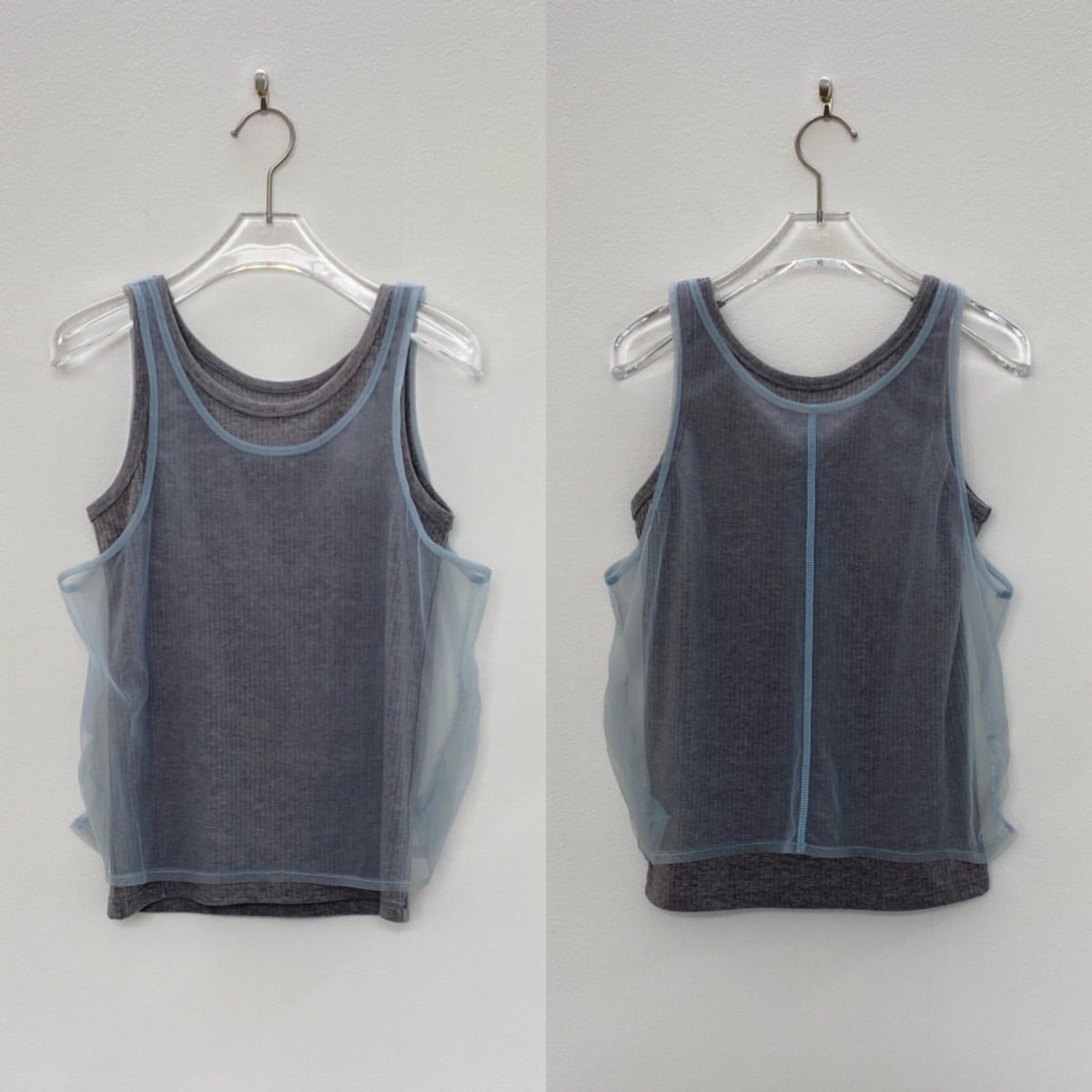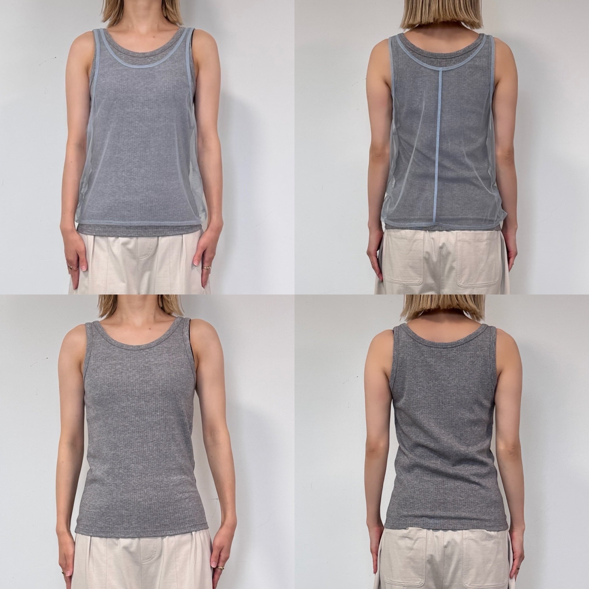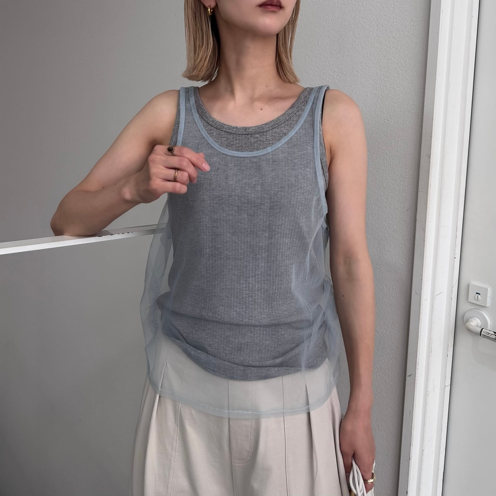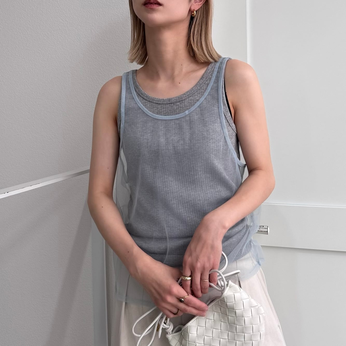 柔らかくストレッチが効いていて肌触りが心地よいリブタンクとマットシアーなチュールタンクのセット。共に前後2way仕様で、その日の気分でコーディネートをお楽しみいただけます。チュールタンクのサイドにはギャザーが施されているのも可愛いポイント◎