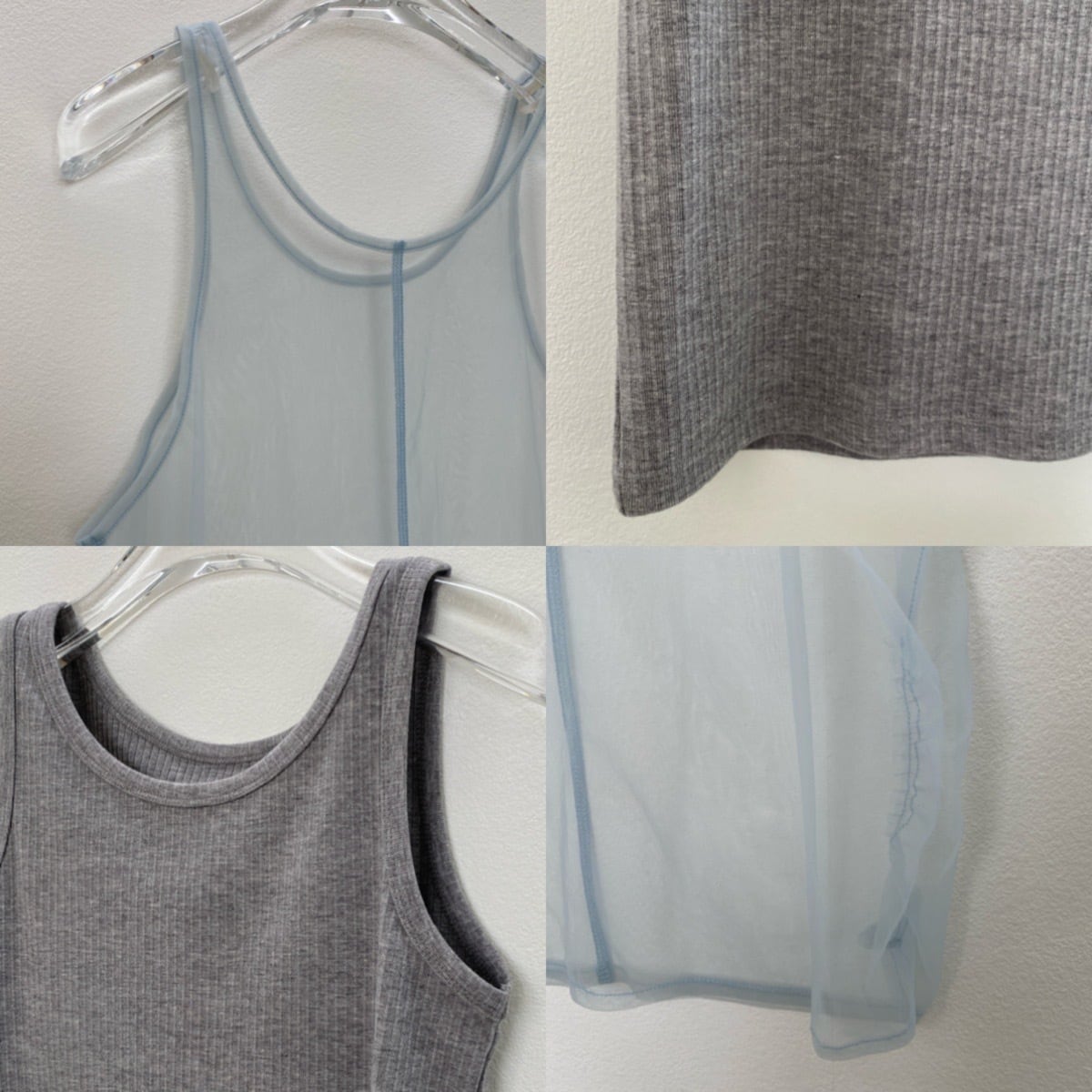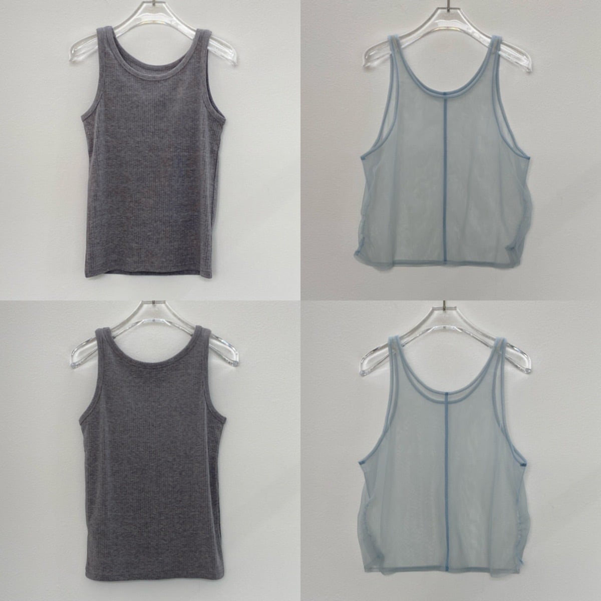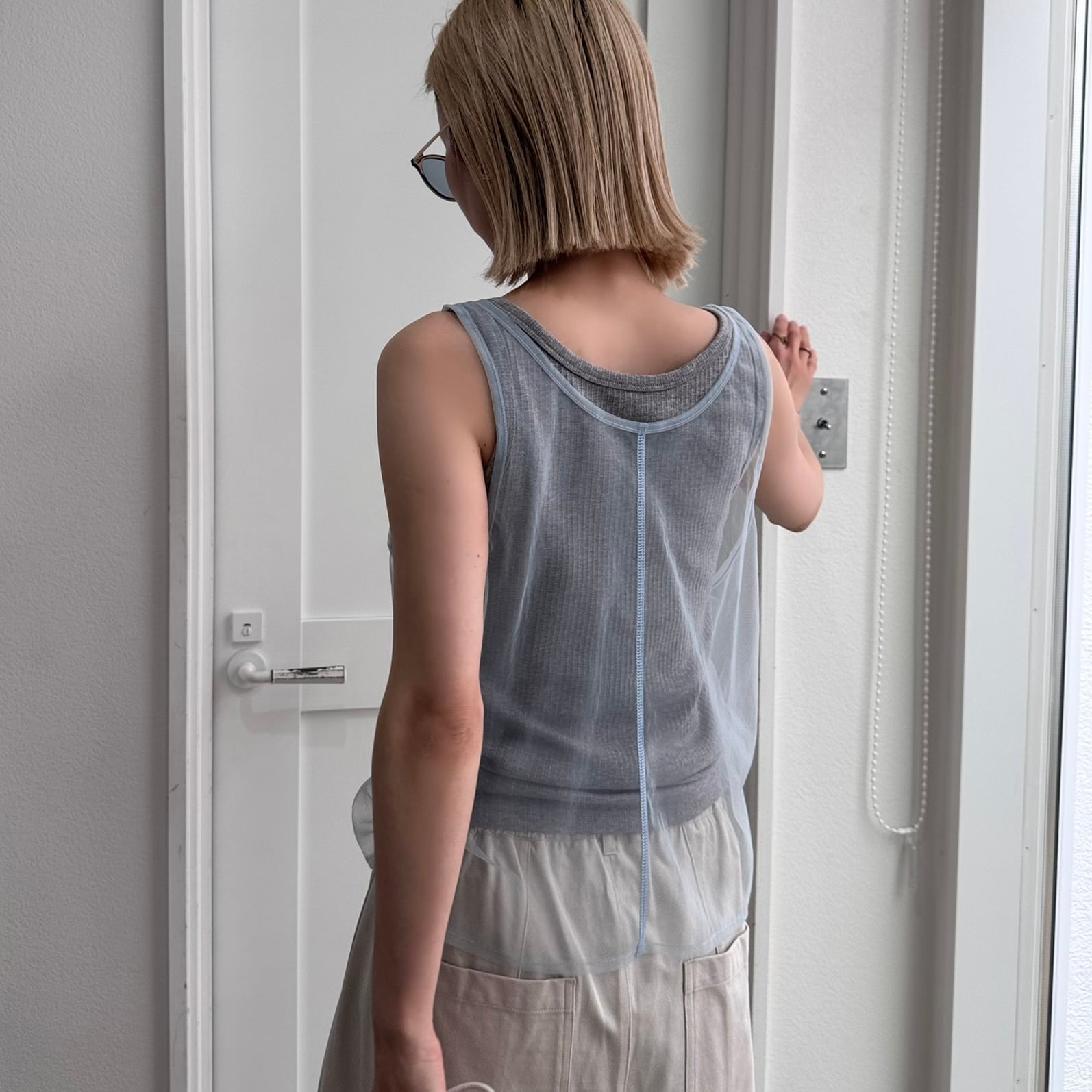 柔らかくストレッチが効いていて肌触りが心地よいリブタンクとマットシアーなチュールタンクのセット。共に前後2way仕様で、その日の気分でコーディネートをお楽しみいただけます。チュールタンクのサイドにはギャザーが施されているのも可愛いポイント◎