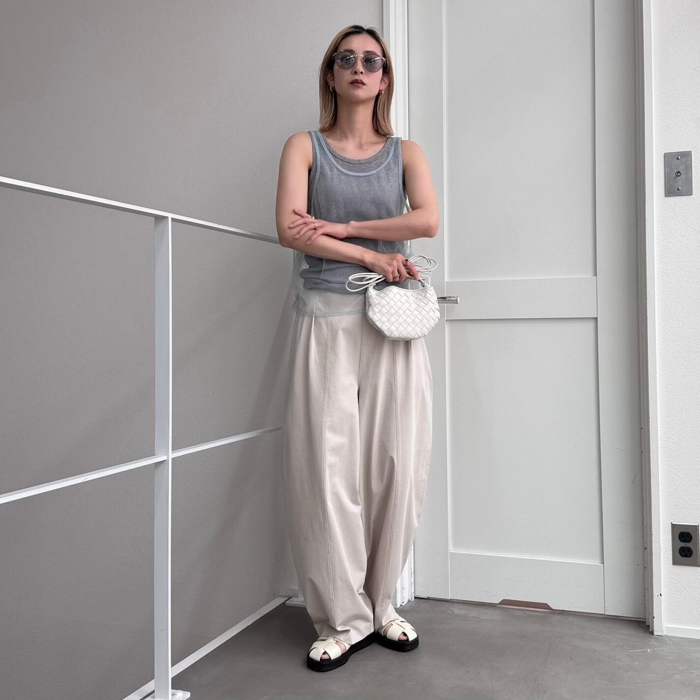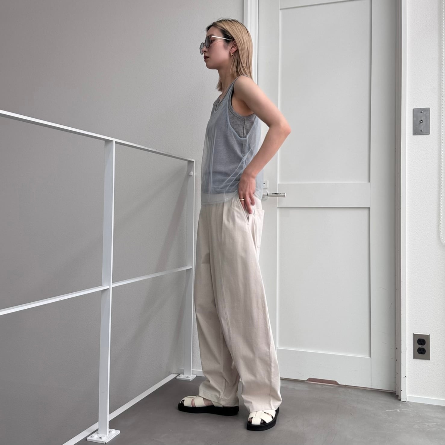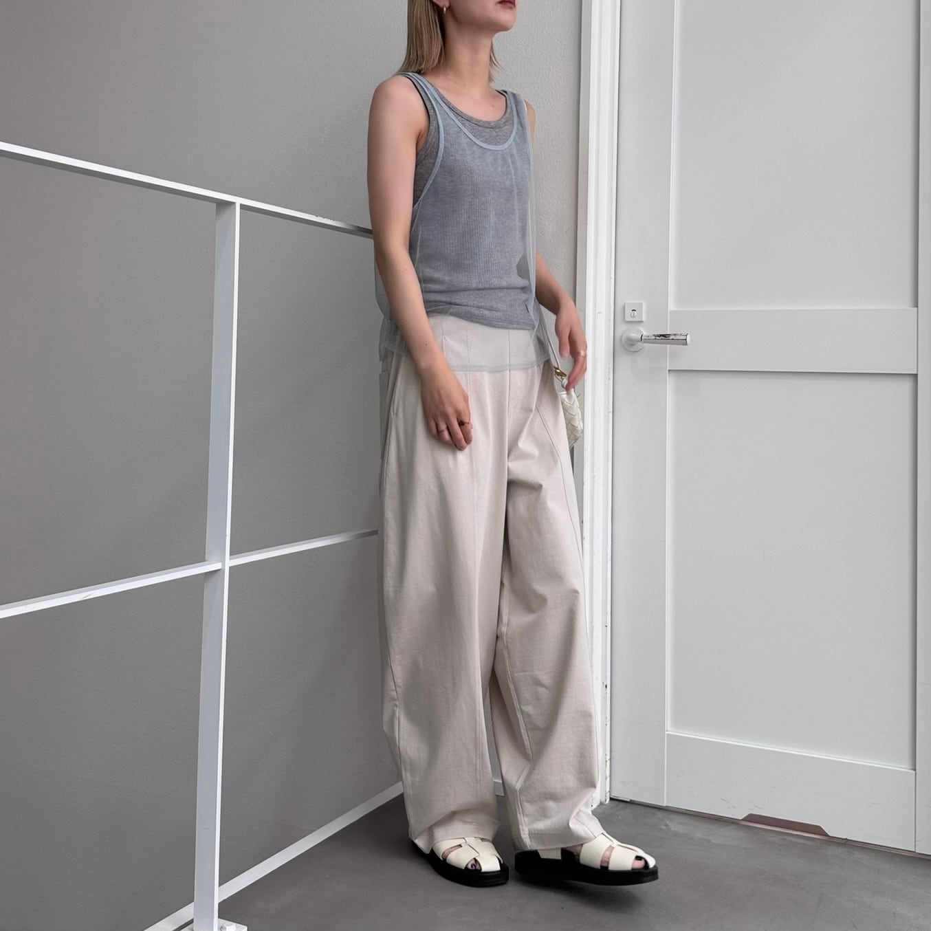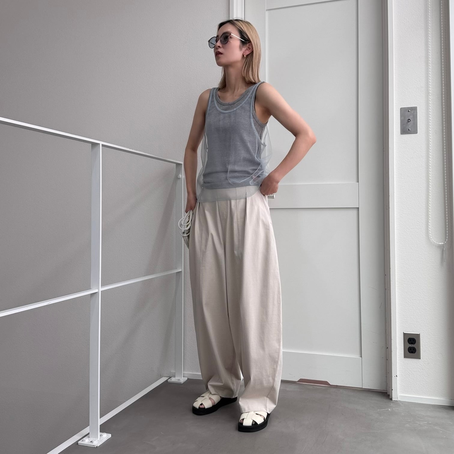 柔らかくストレッチが効いていて肌触りが心地よいリブタンクとマットシアーなチュールタンクのセット。共に前後2way仕様で、その日の気分でコーディネートをお楽しみいただけます。チュールタンクのサイドにはギャザーが施されているのも可愛いポイント◎
