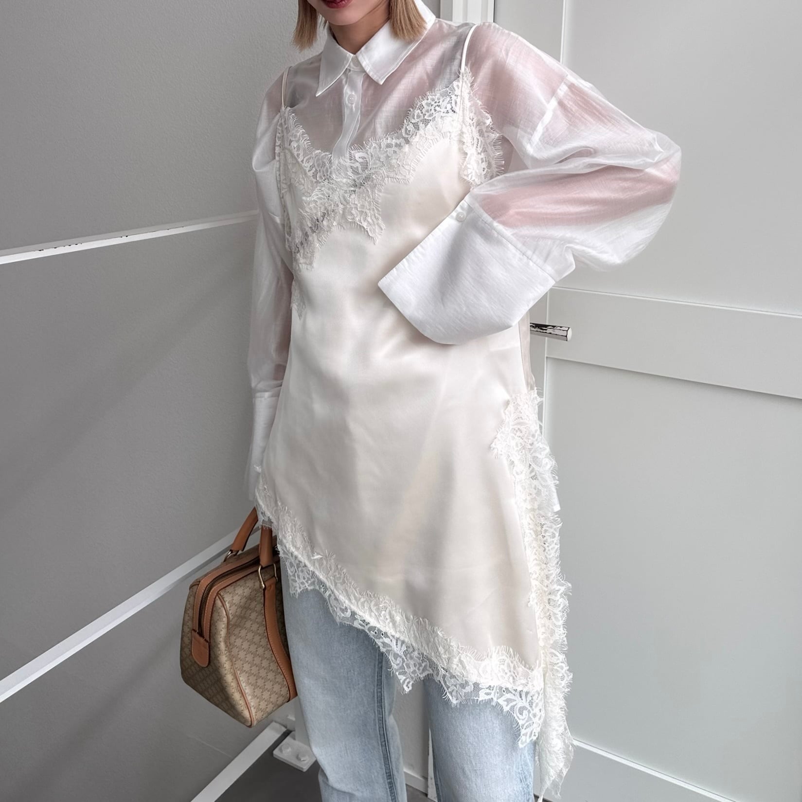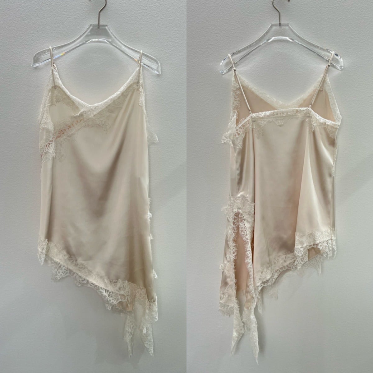 サテン特有のとろみのある肌触りのアシメキャミソール。ランジェリーのようなレースにサテン生地のアシンメトリーデザインで、フェミニンさとモードさを併せ持つ1枚。メインでのスタイリングはもちろん、ニットやTシャツなどのトップスとレイヤードしたり甘辛MIXなスタイリングもお楽しみいただけます。