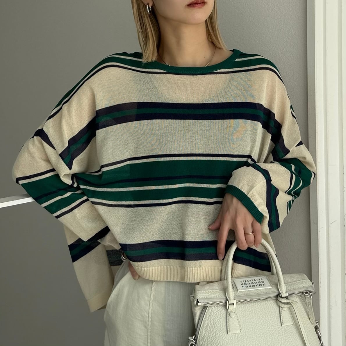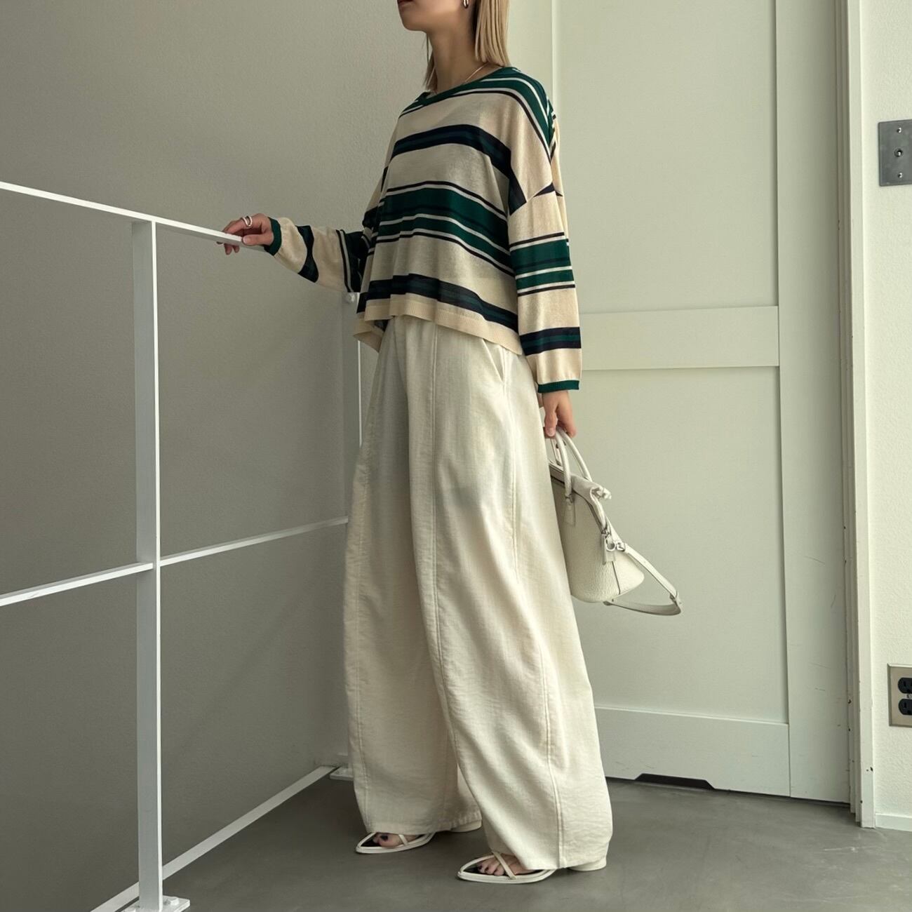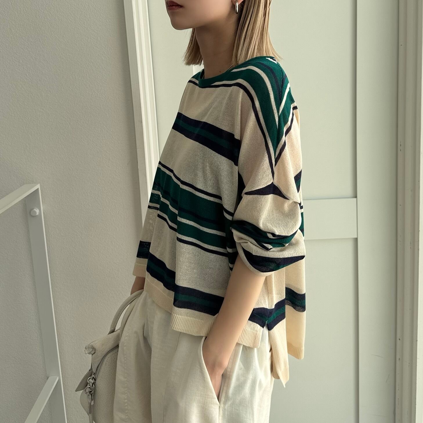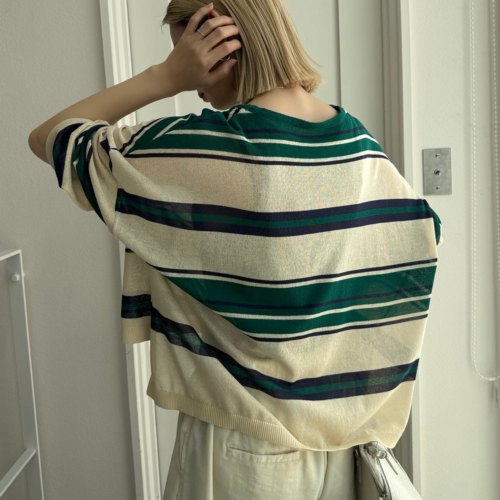 レトロチックなボーダーが目を惹くサマーニットカットソー。身幅が大きめで接触冷感機能付で、さらっとゆるっと着用いただけます。前後差のある裾で気になる腰回りも程よいカバー力も◎ネックラインも広めなので、カジュアルかつフェミニンさを出してくれる1枚です。
