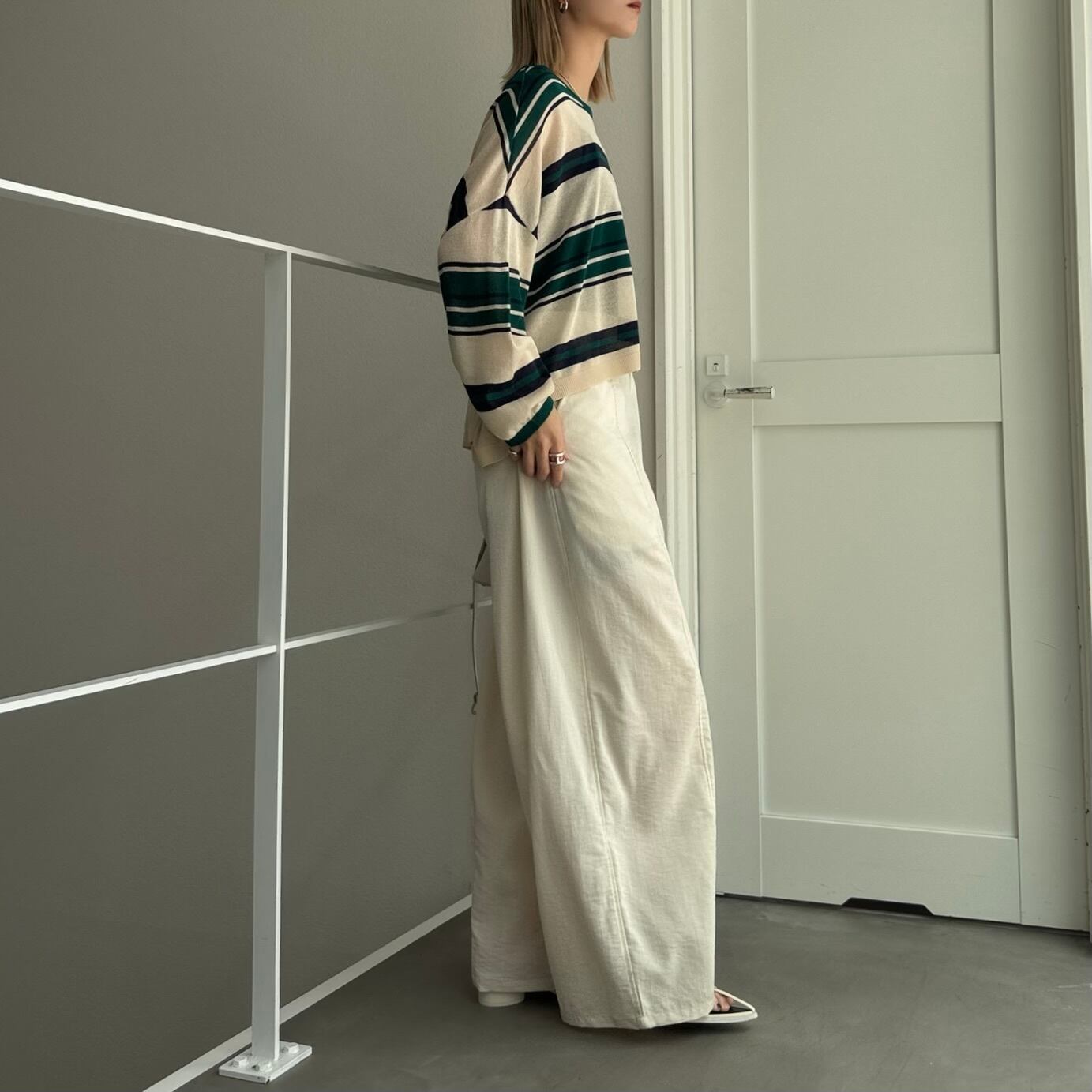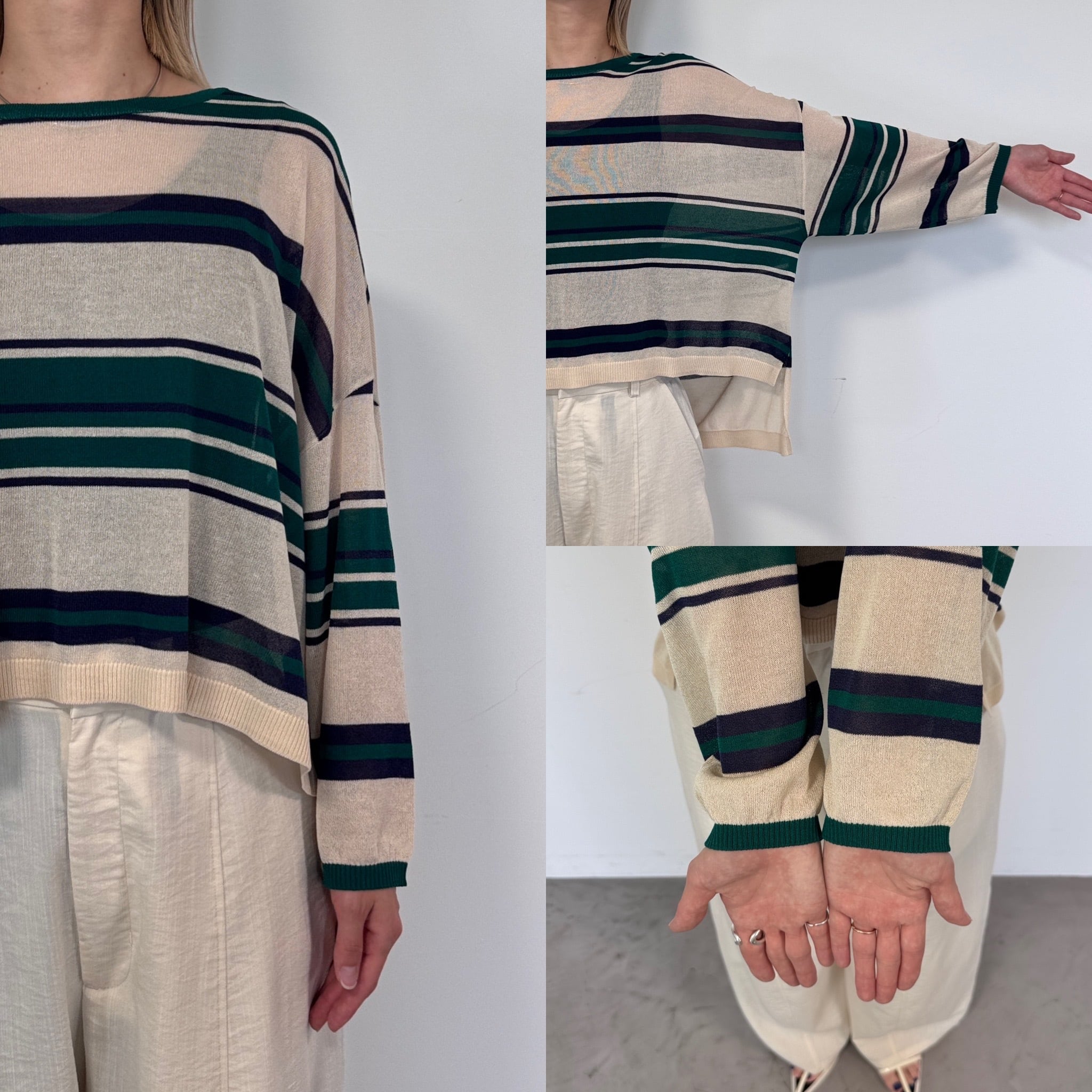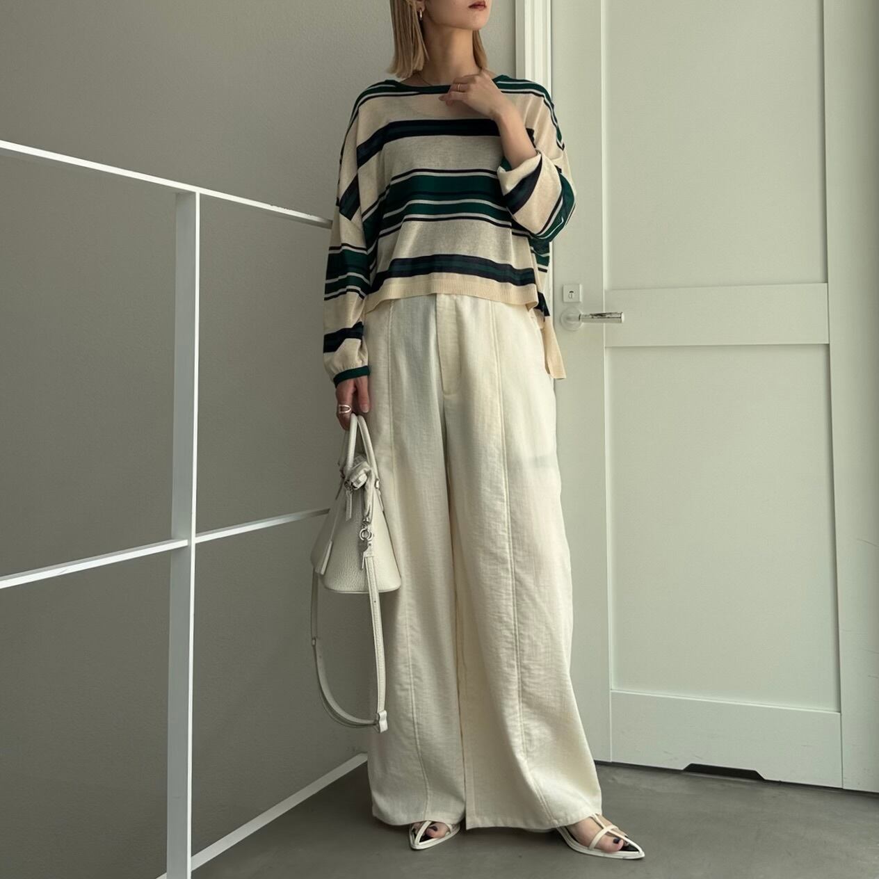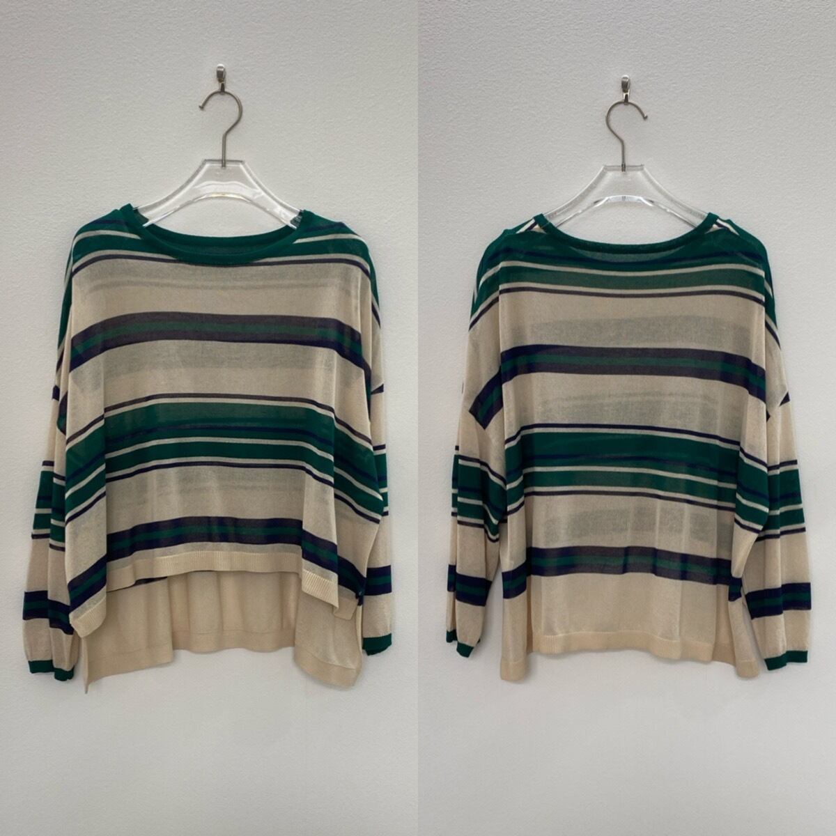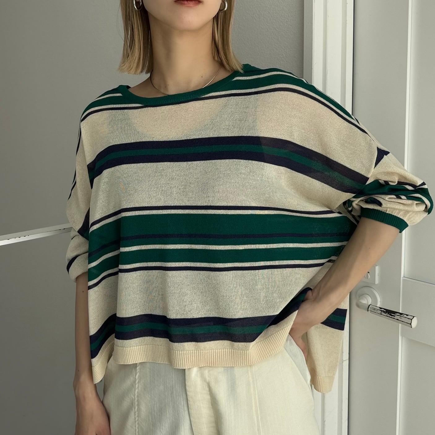 レトロチックなボーダーが目を惹くサマーニットカットソー。身幅が大きめで接触冷感機能付で、さらっとゆるっと着用いただけます。前後差のある裾で気になる腰回りも程よいカバー力も◎ネックラインも広めなので、カジュアルかつフェミニンさを出してくれる1枚です。