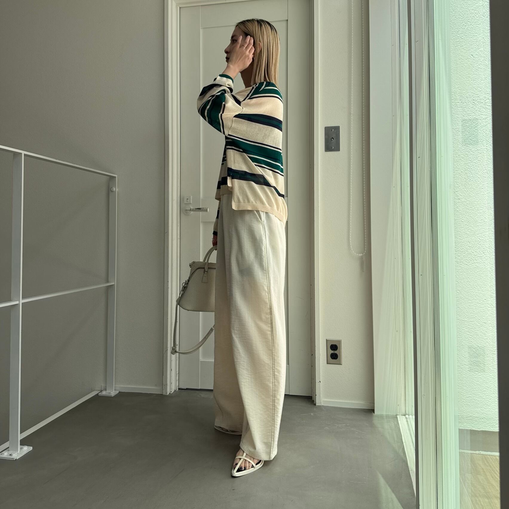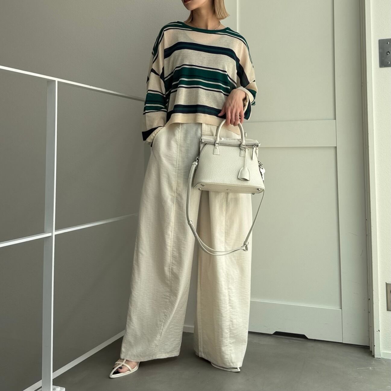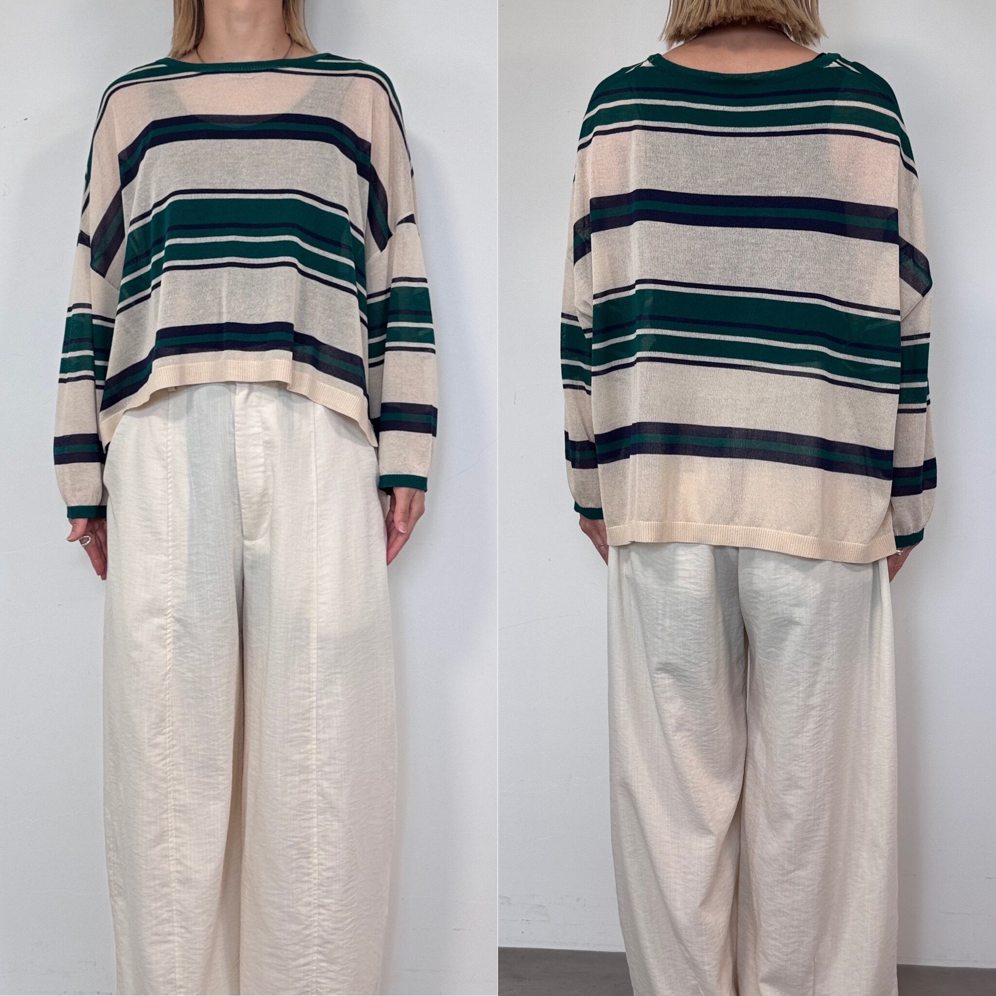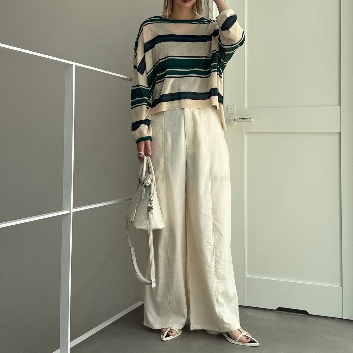 レトロチックなボーダーが目を惹くサマーニットカットソー。身幅が大きめで接触冷感機能付で、さらっとゆるっと着用いただけます。前後差のある裾で気になる腰回りも程よいカバー力も◎ネックラインも広めなので、カジュアルかつフェミニンさを出してくれる1枚です。