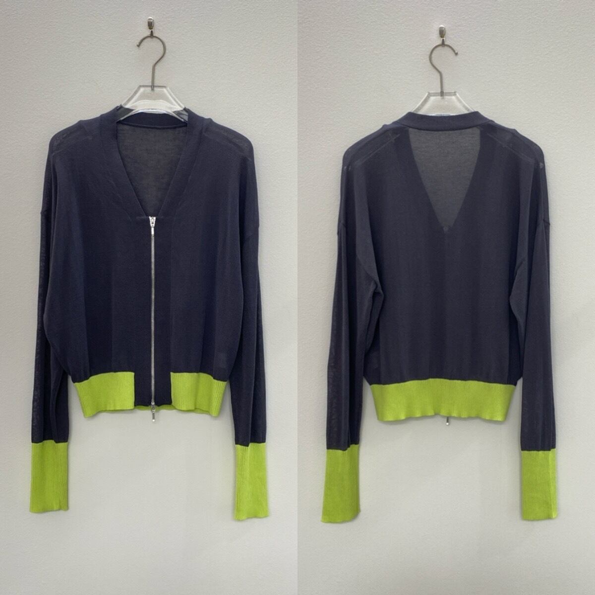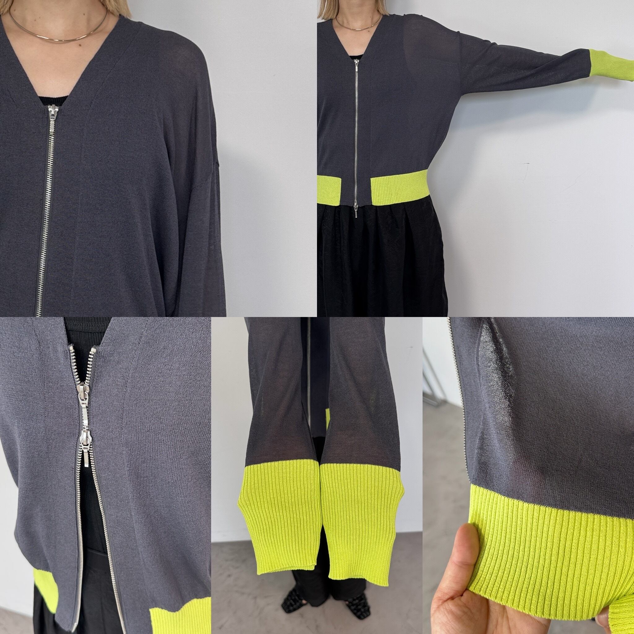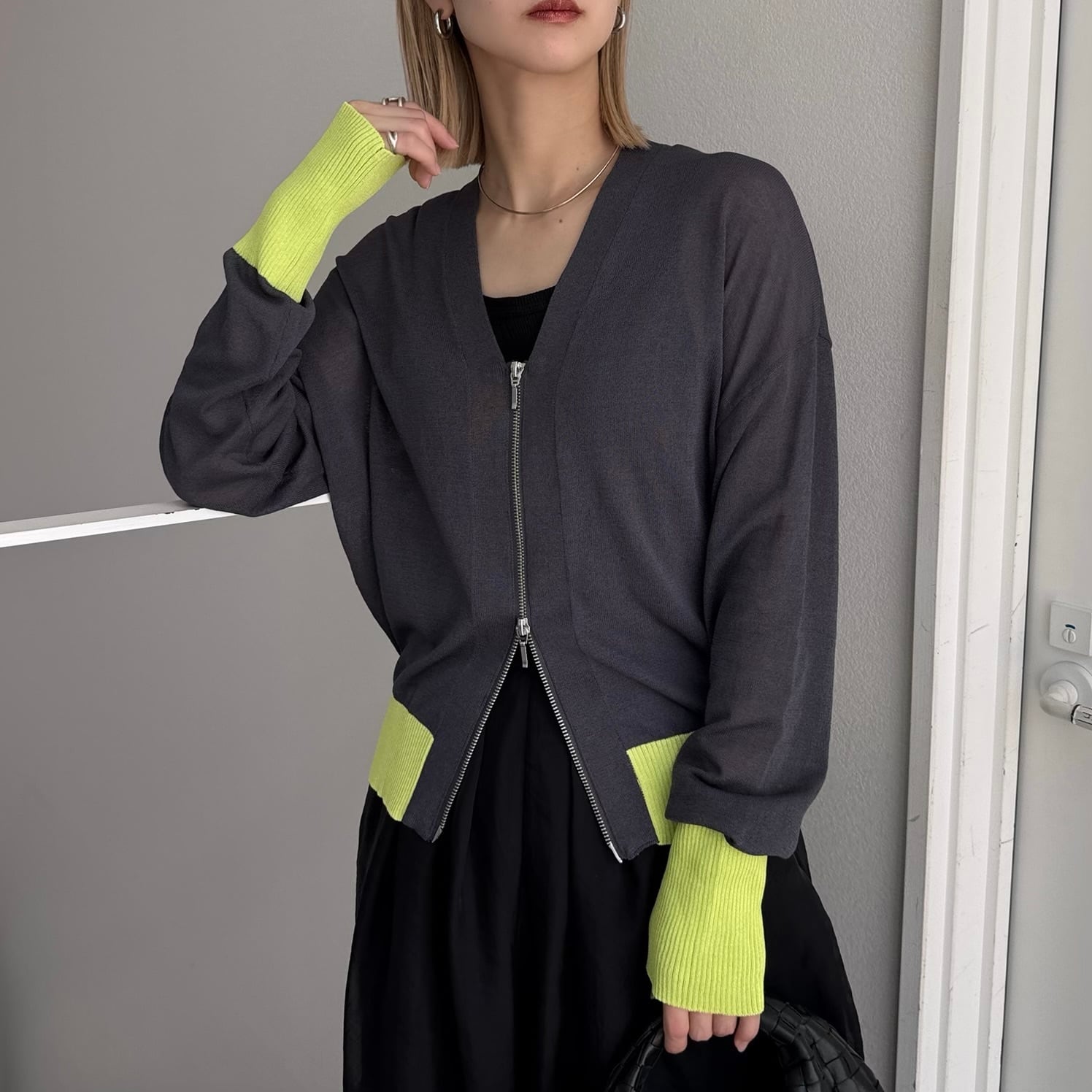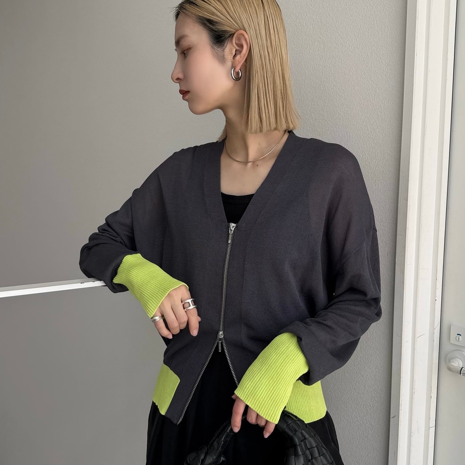 裾と袖の配色がアクセントのサマーニットカーディガン。Vネックからのダブルジップ仕様なので、お好みの形でスタイリングが可能に。接触冷感機能が付いているので夏の暑い日の日除けとしての役割にも◎程よい丈感できれいめのパンツやスカート、デニムとの相性も抜群です。