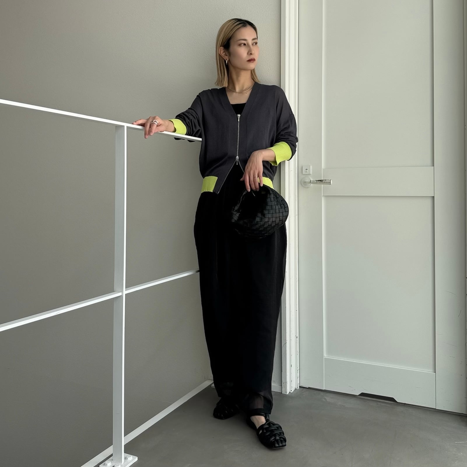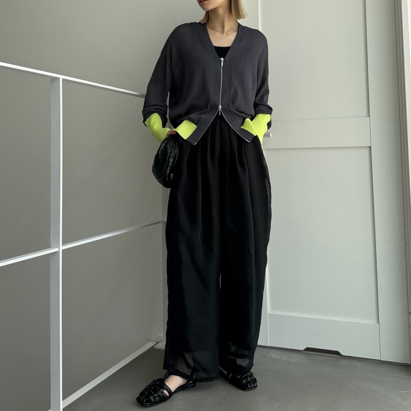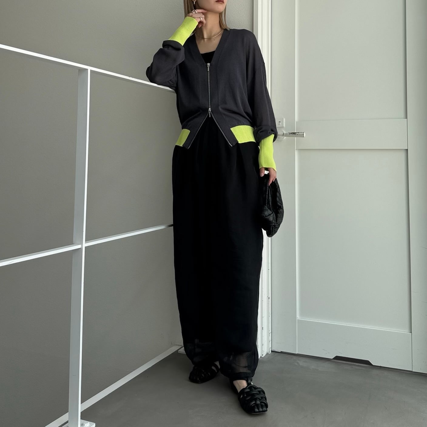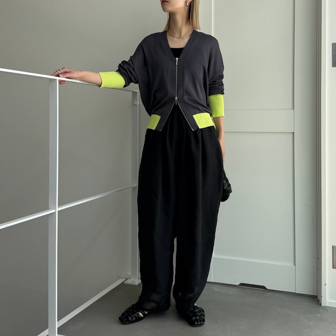 裾と袖の配色がアクセントのサマーニットカーディガン。Vネックからのダブルジップ仕様なので、お好みの形でスタイリングが可能に。接触冷感機能が付いているので夏の暑い日の日除けとしての役割にも◎程よい丈感できれいめのパンツやスカート、デニムとの相性も抜群です。