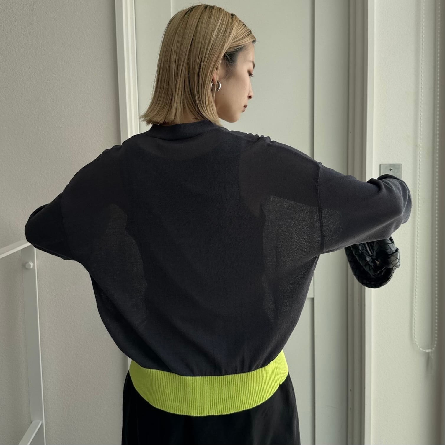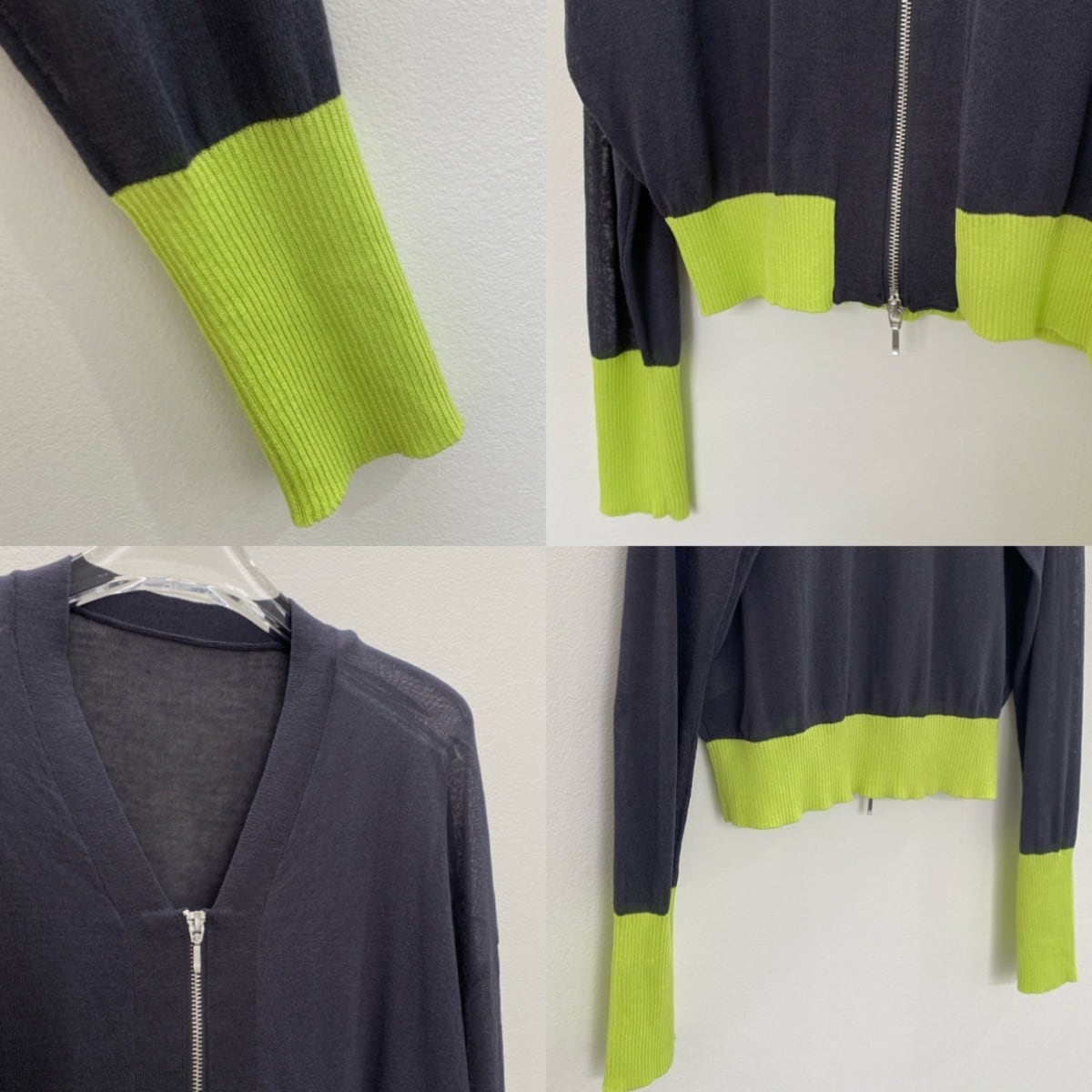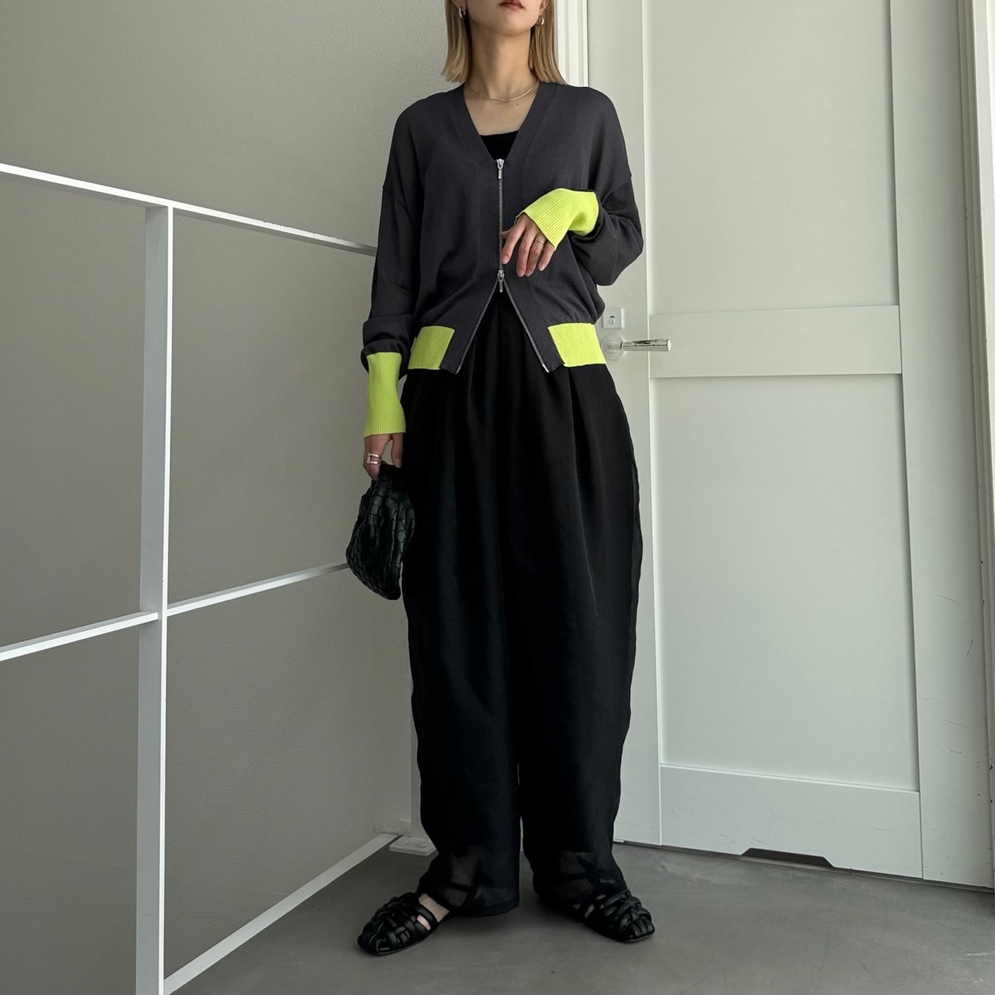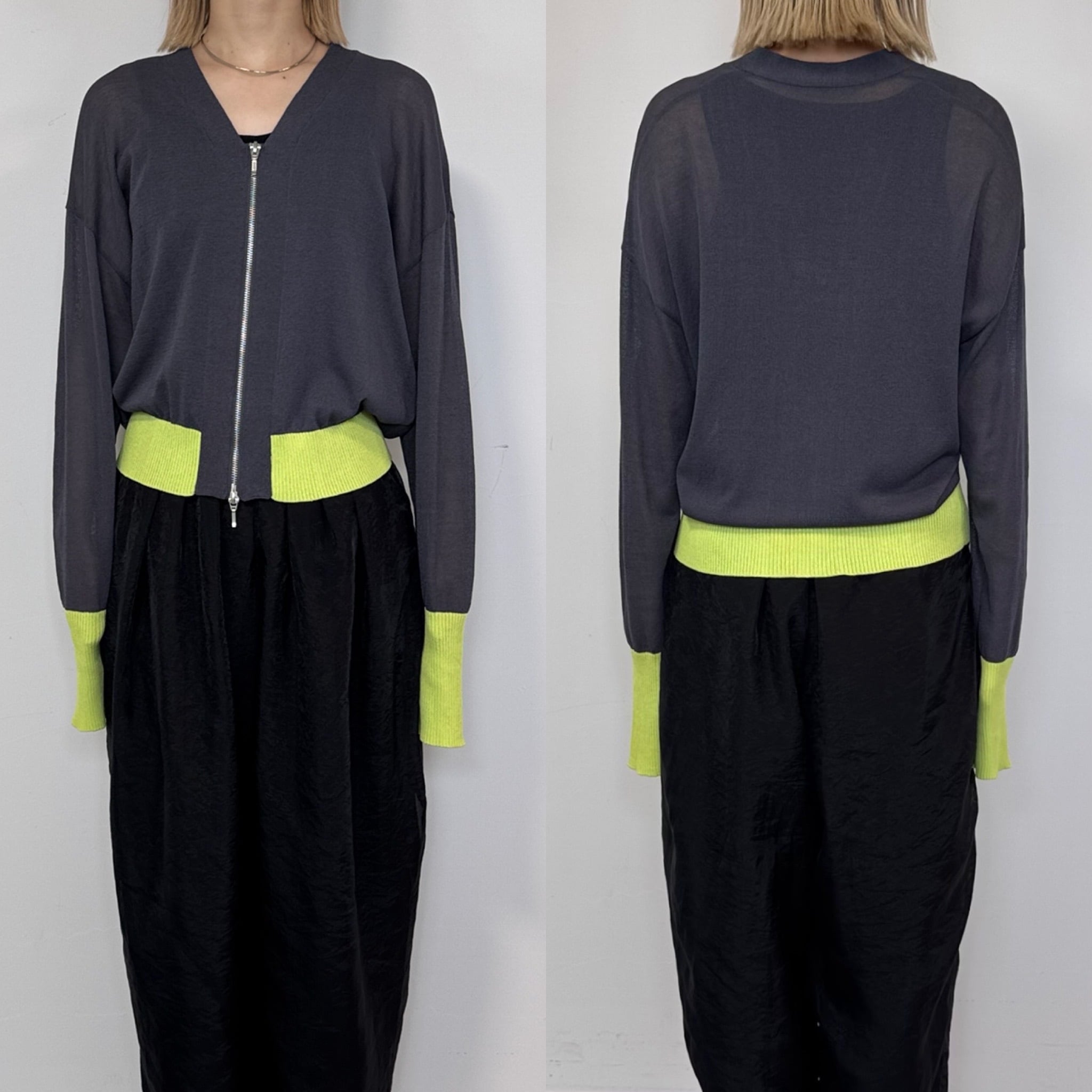 裾と袖の配色がアクセントのサマーニットカーディガン。Vネックからのダブルジップ仕様なので、お好みの形でスタイリングが可能に。接触冷感機能が付いているので夏の暑い日の日除けとしての役割にも◎程よい丈感できれいめのパンツやスカート、デニムとの相性も抜群です。