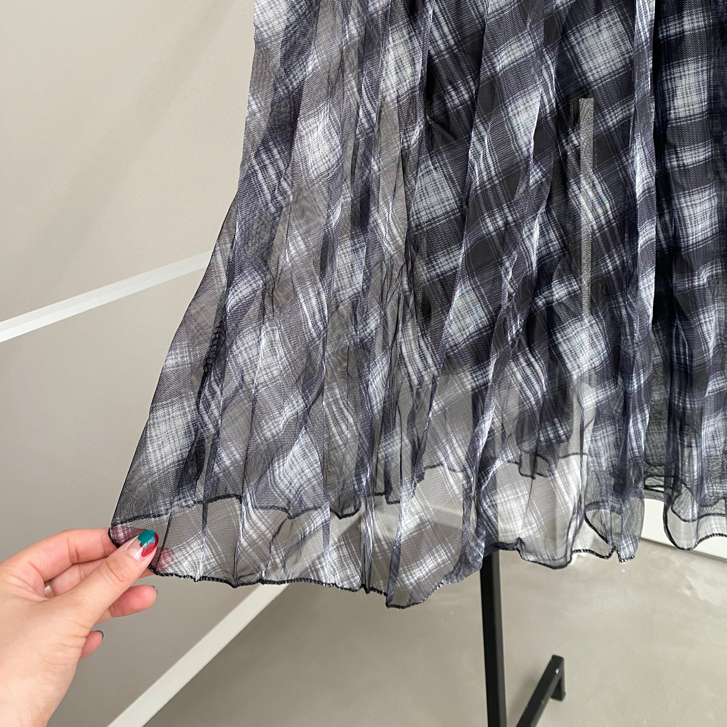 シアー生地にチェック柄がプリントされたチュールスカート。チェック生地の下にもう一枚チュール生地を使用する事でより動きのあるデザインに。ふわりと広がり動きのある1枚です。膝丈ほどの裏地付き。膝から下にかけて透け感があるので抜け感のあるコーデが完成します。もちろん靴下やタイツを合わせもおススメ。