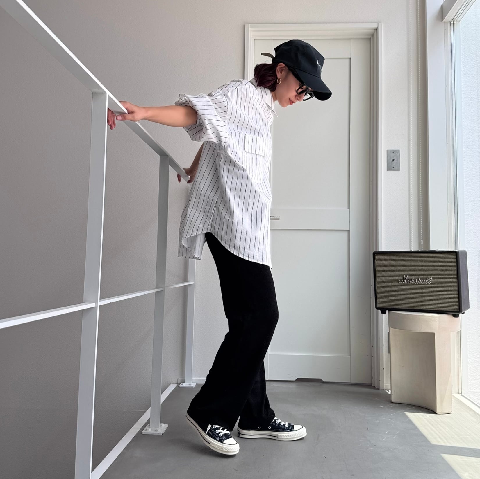 カジュアルなアイテムに合わせて少しエッジを効かせたコーディネートにまとめるのがおすすめです。
